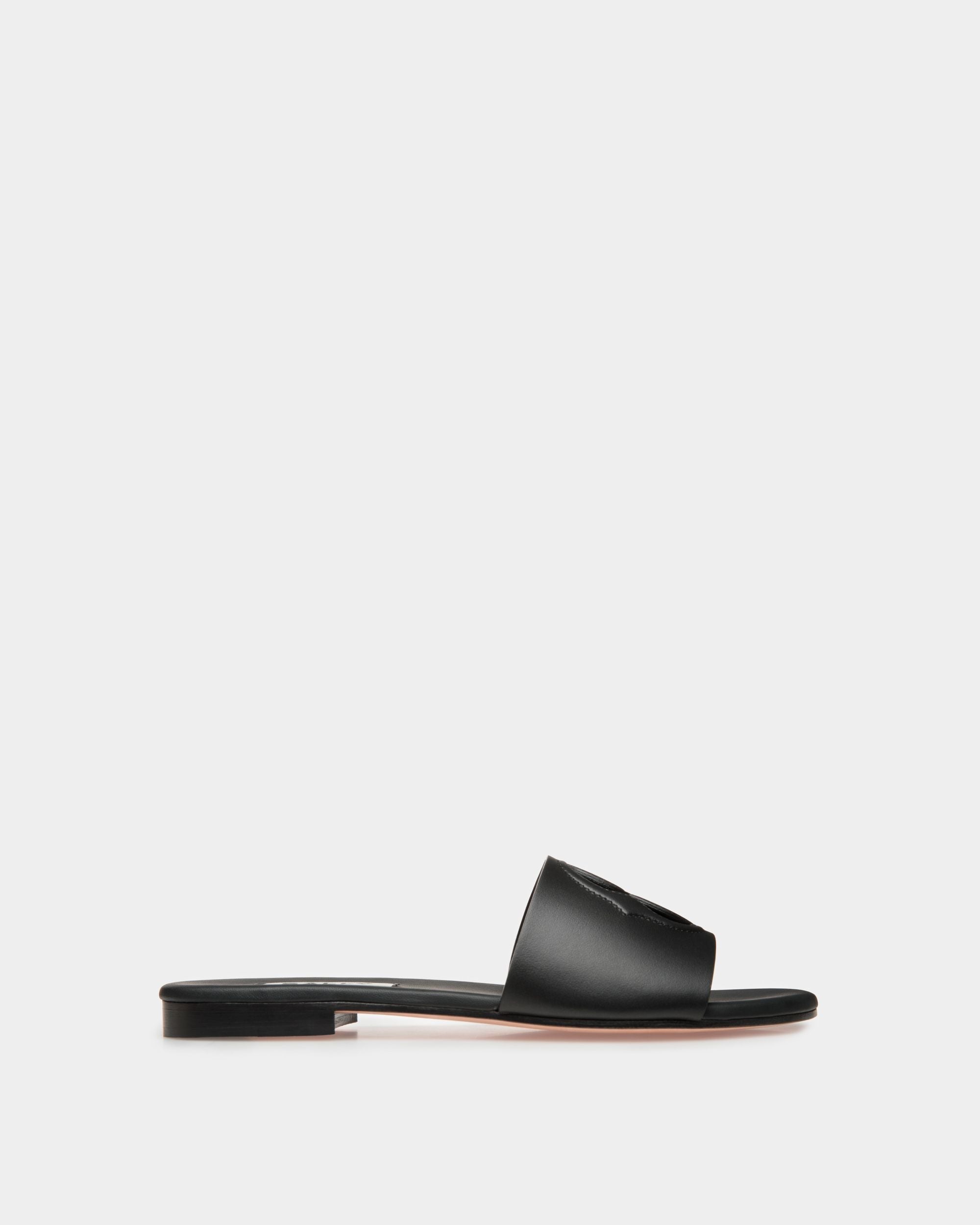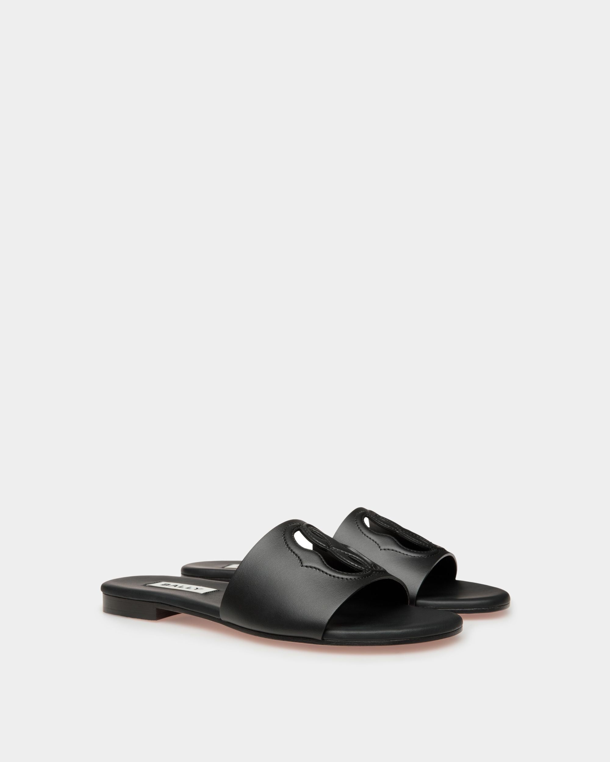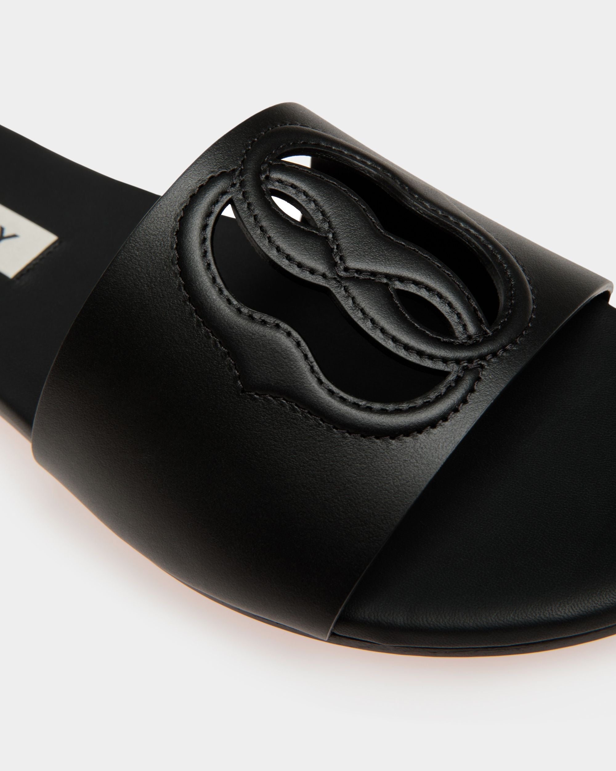 Sleek all black styling and pared-back branding infuse these slides with understated allure. An interplay of openwork and stitching sits at the top of the single maxi strap of the upper, forming the Bally Emblem.