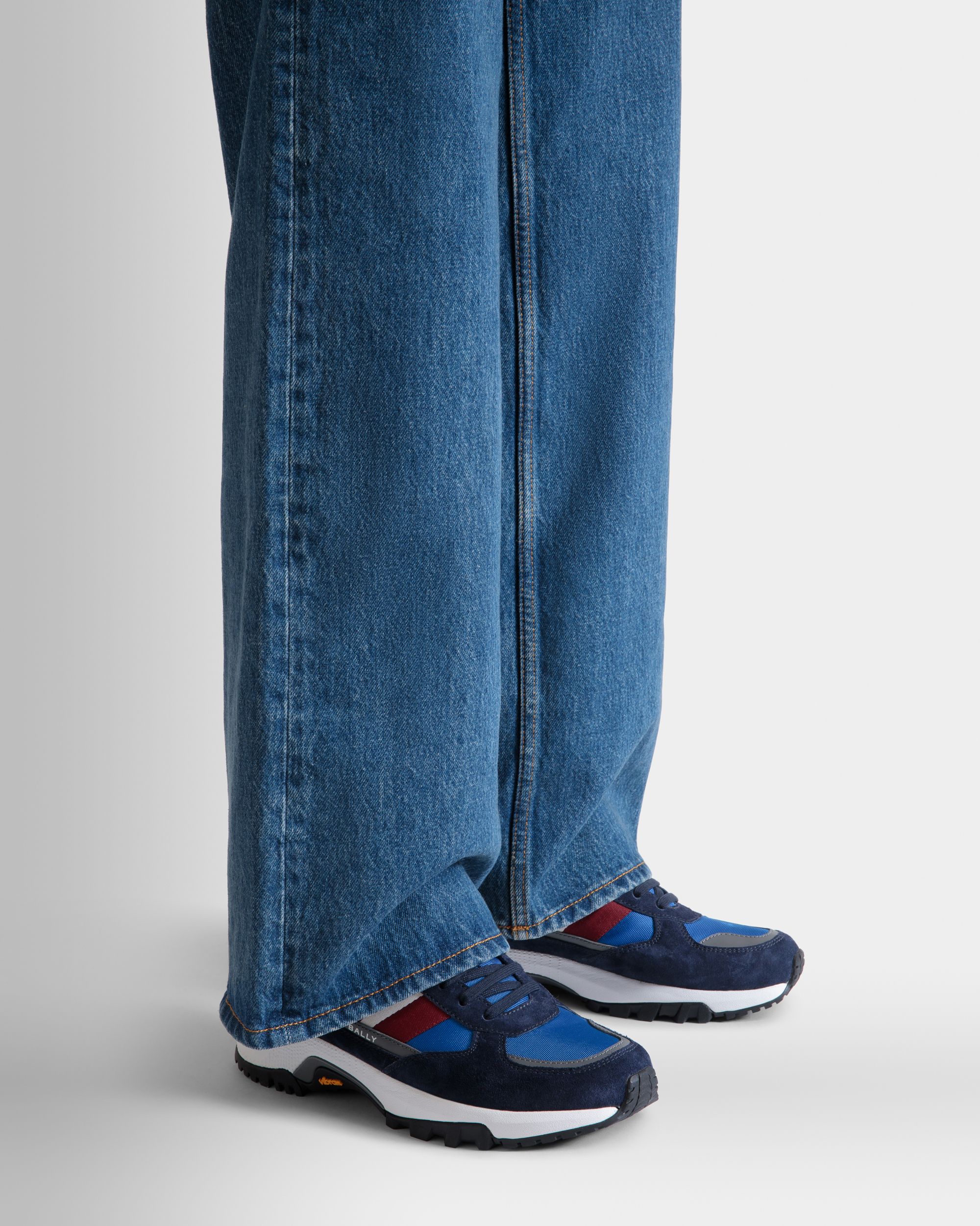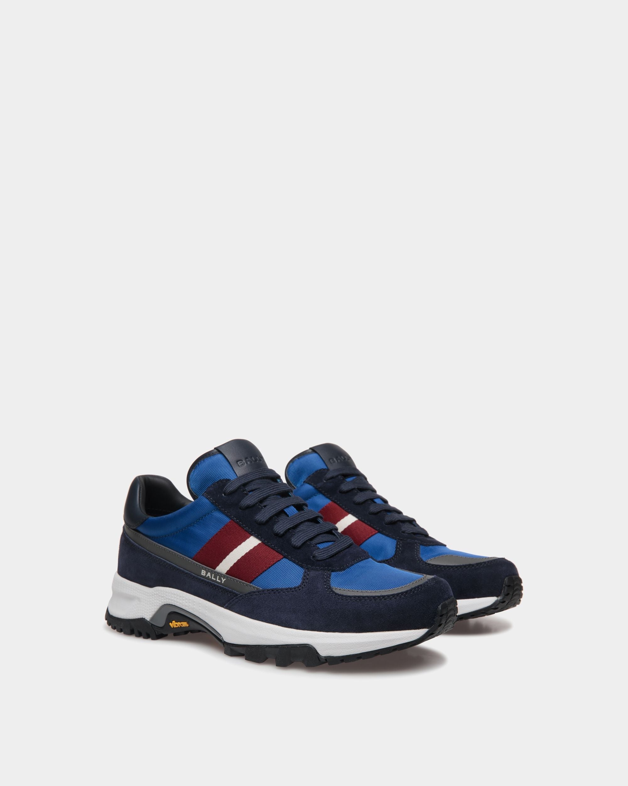 This lace-up Faster sneaker combines blue suede and nylon, enriched by a red and white Bally Ribbon at the side. The Vibram running sole in rubber provides advanced grip on any terrain.