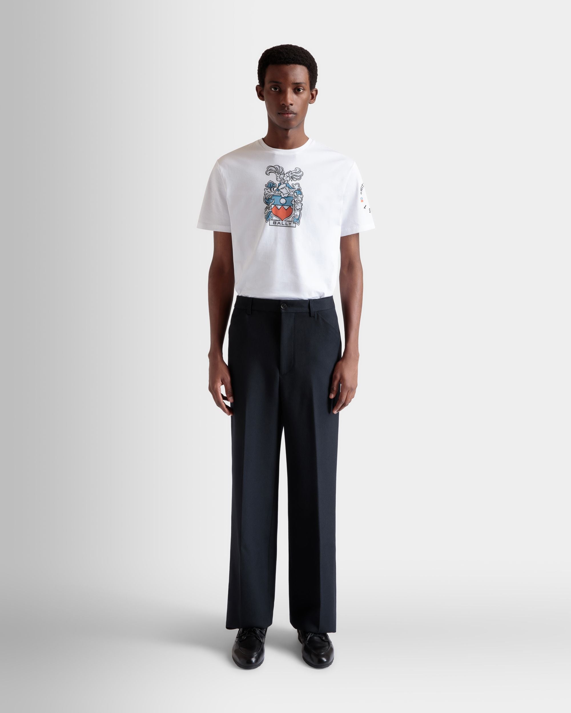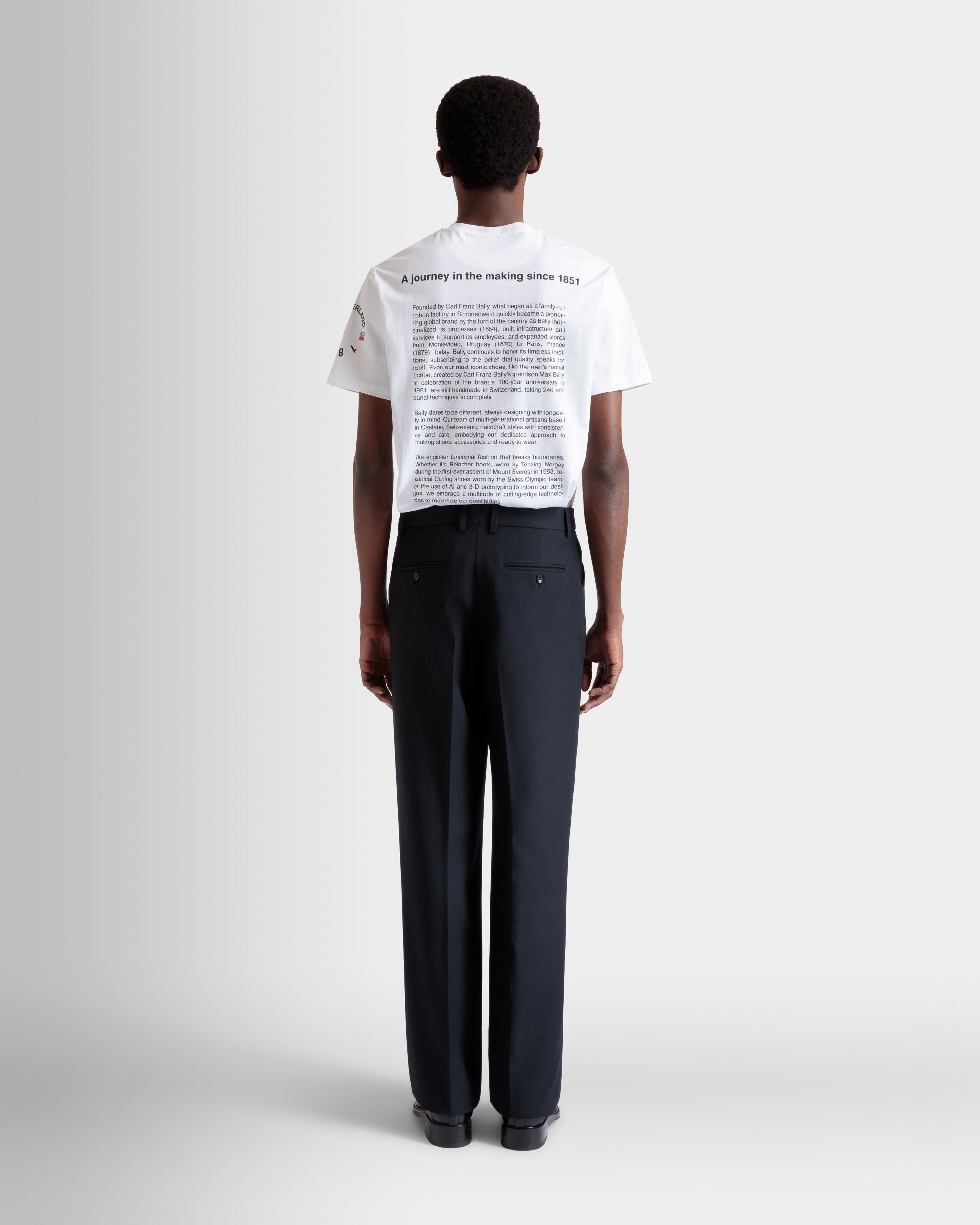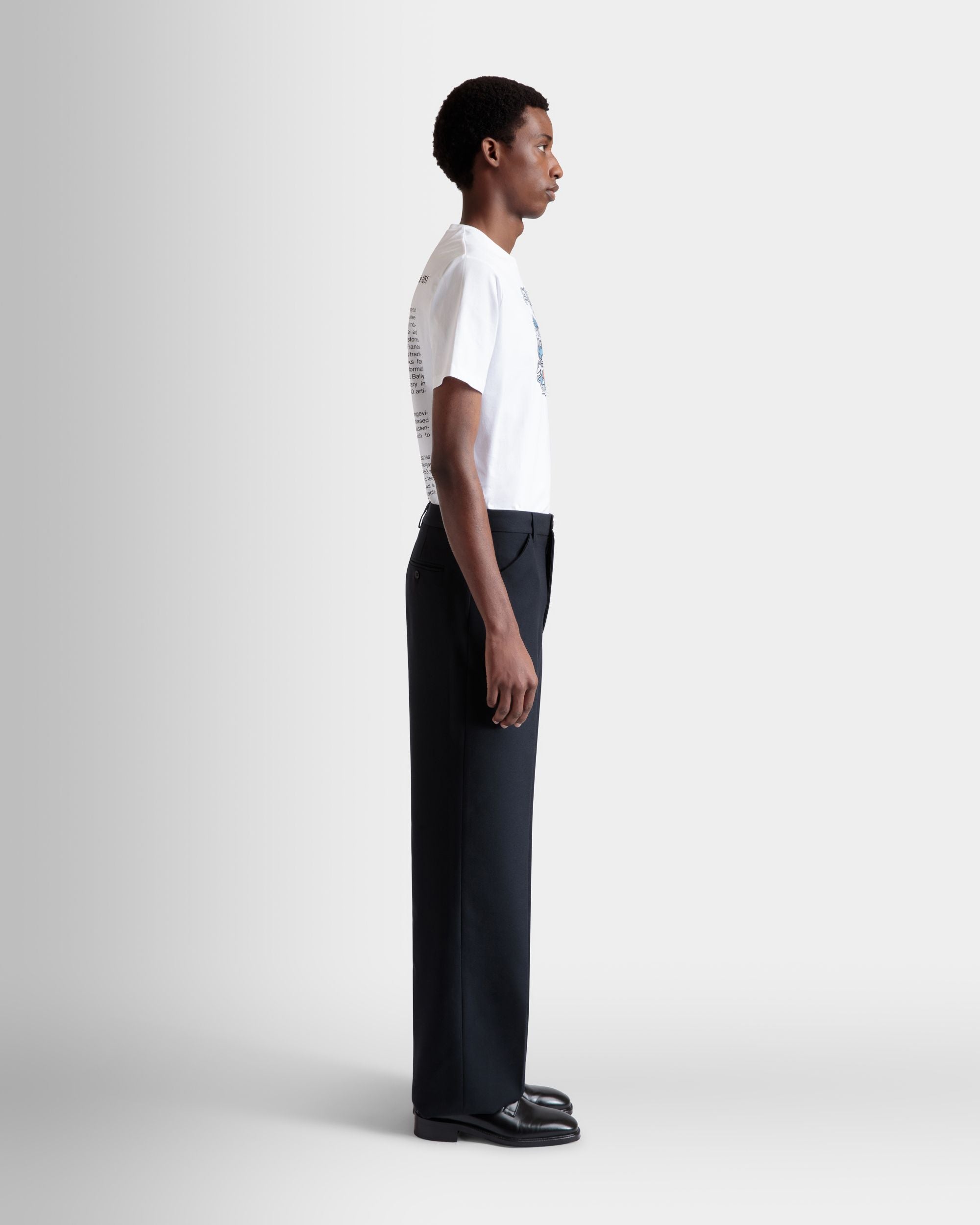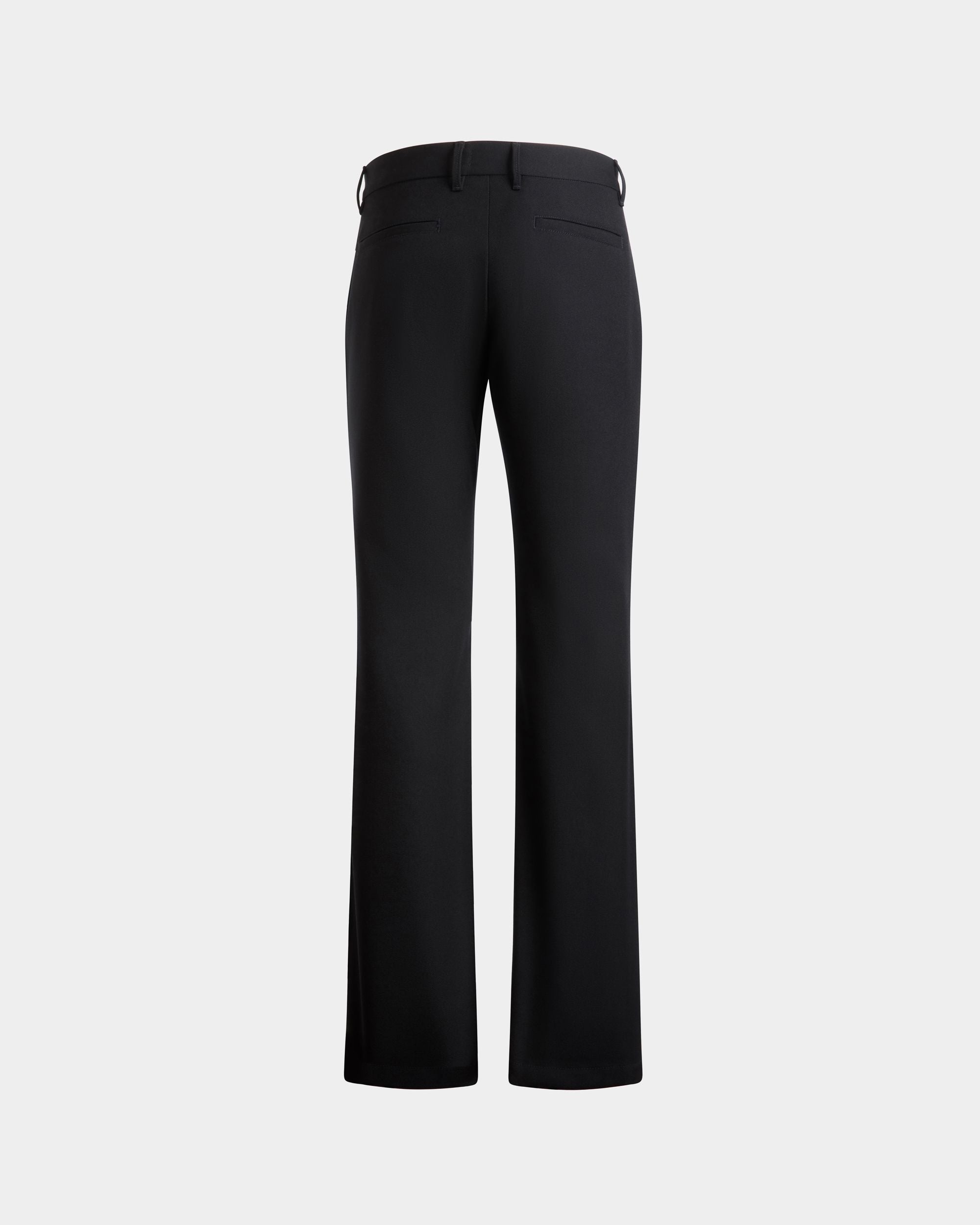 These pants in navy blue woven wool cloth have a flat front and a slightly flared leg.