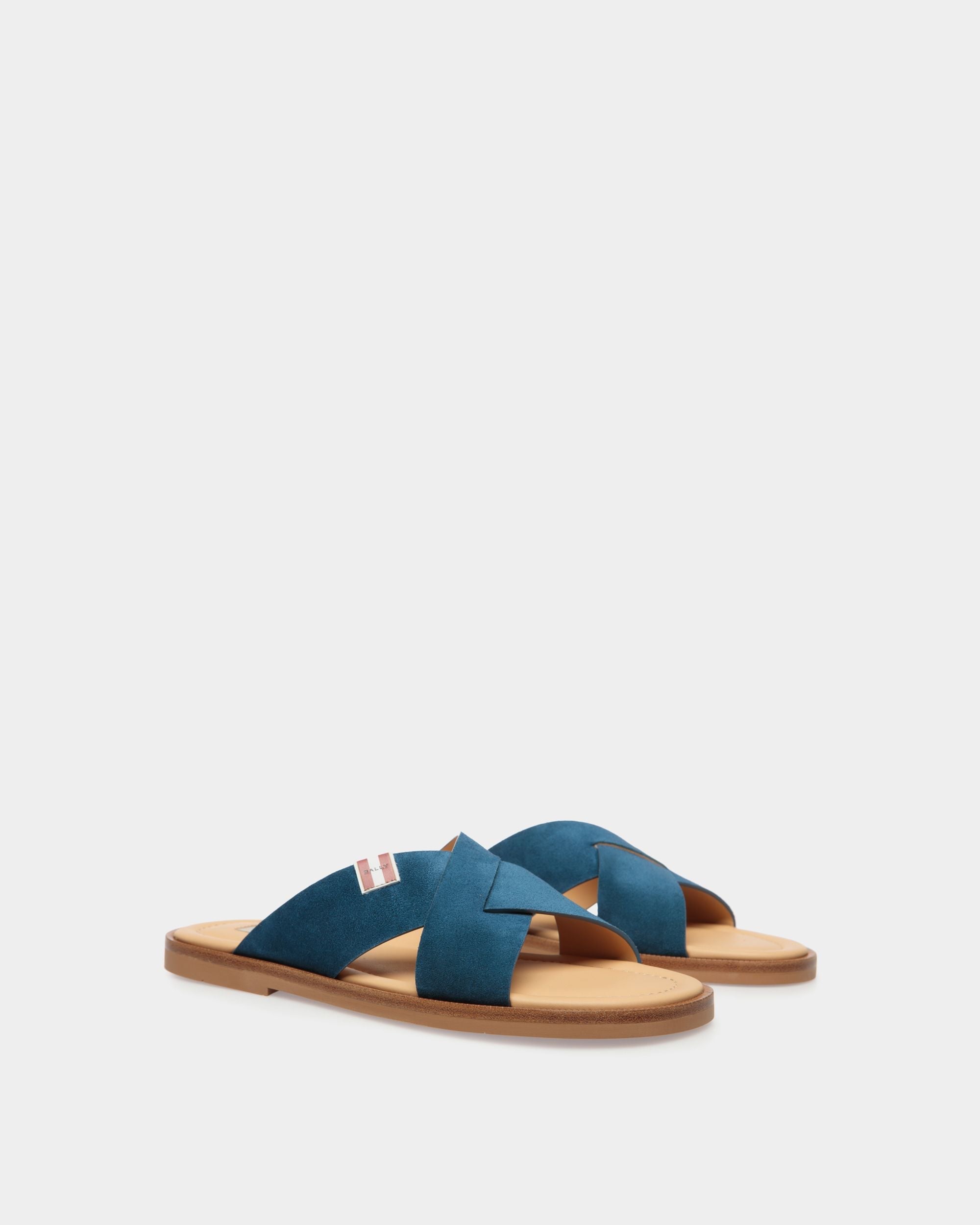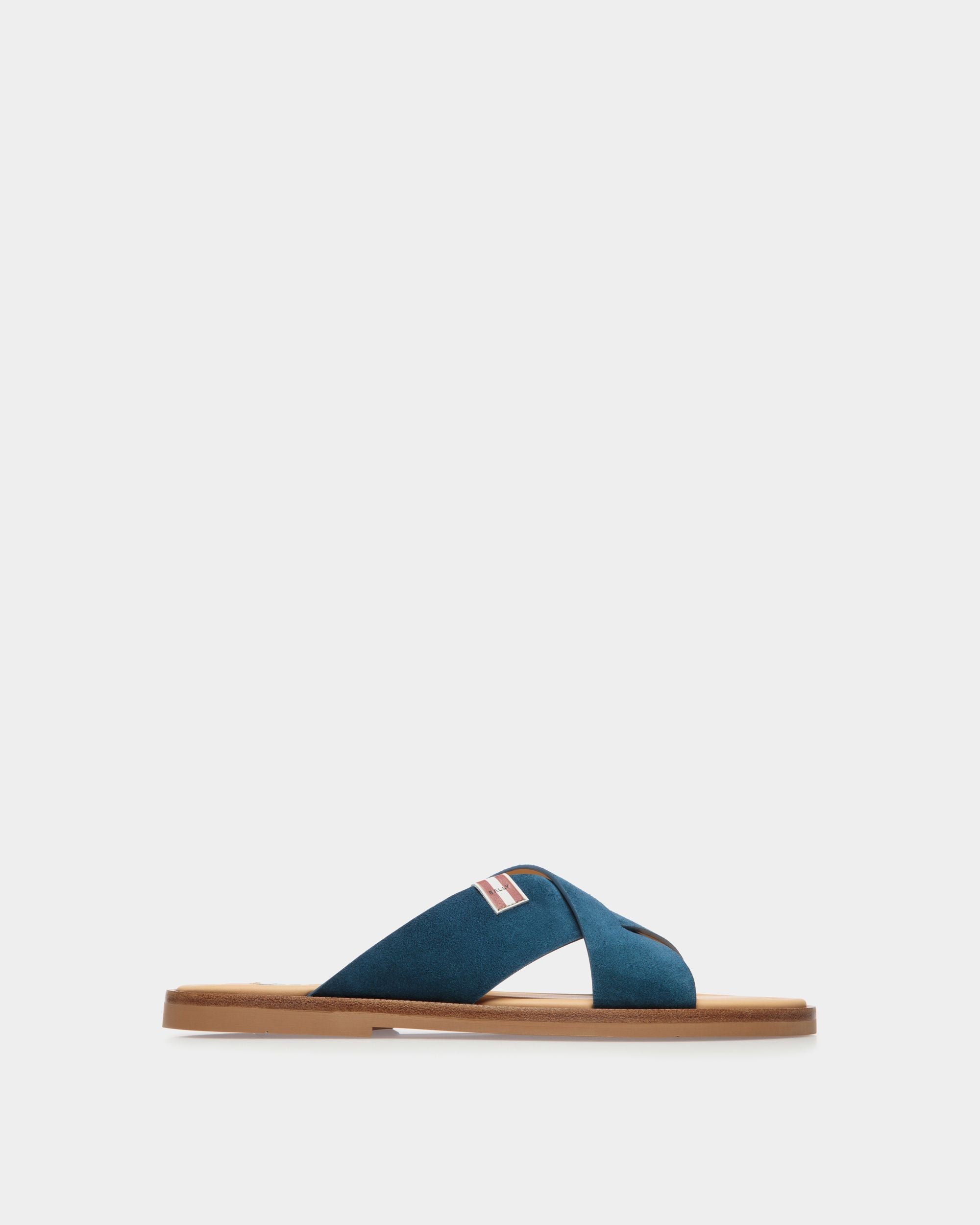 Two straps made of navy blue suede cross to form the upper of this Glide sandal, embellished by a Bally Flag label.