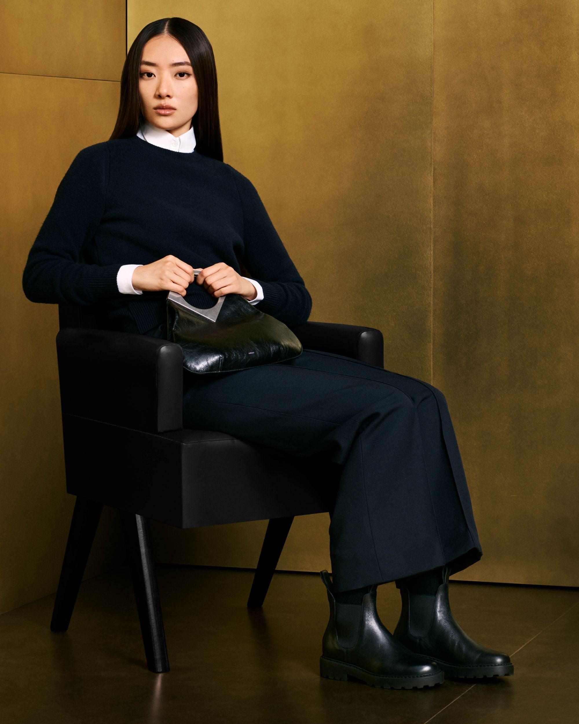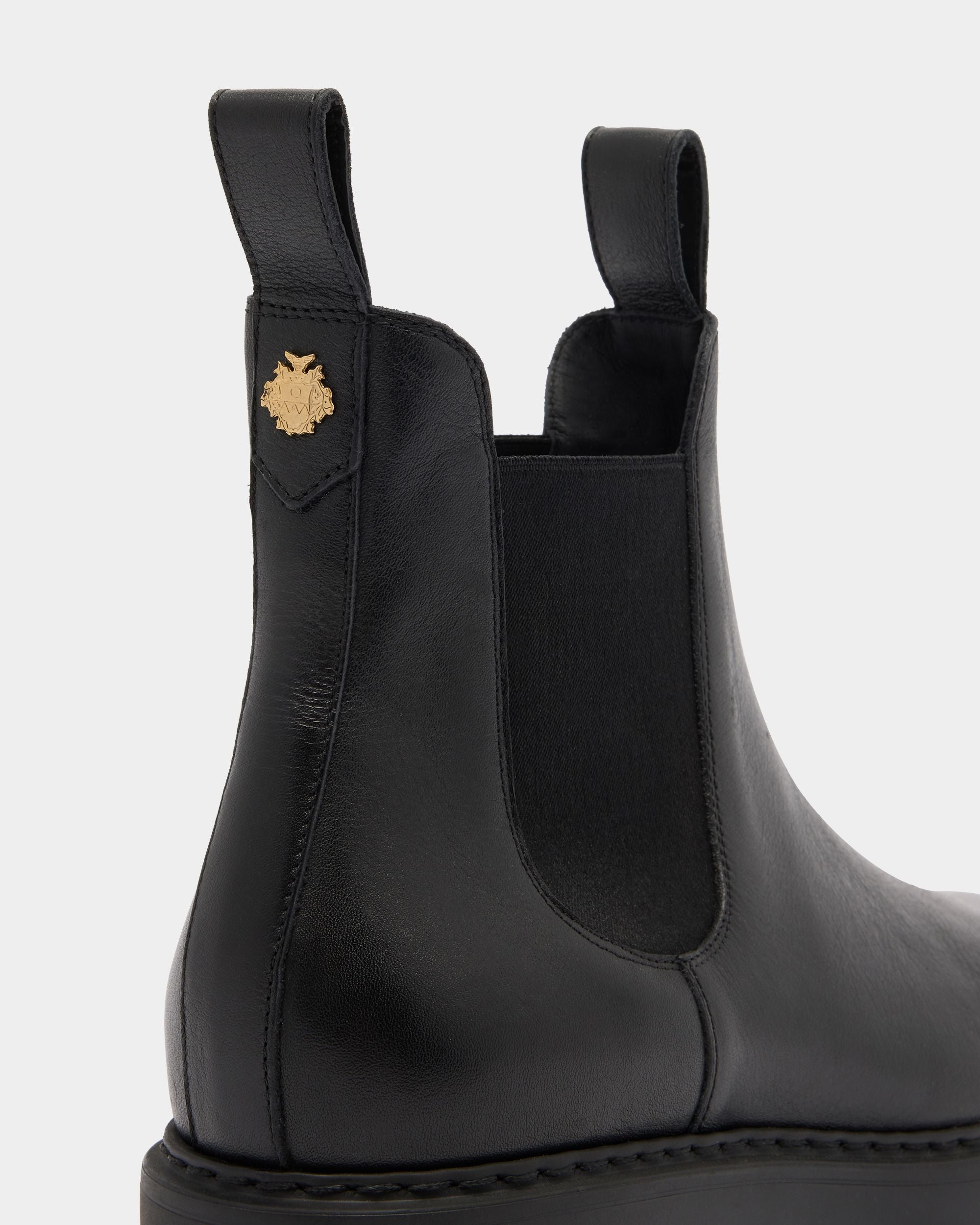 This round-toe Gusto Chelsea boot is in black leather with a semi-gloss textural finish and a chunky tank sole. A gold-tone metal Crest detail adds an iconic note to this classic style.