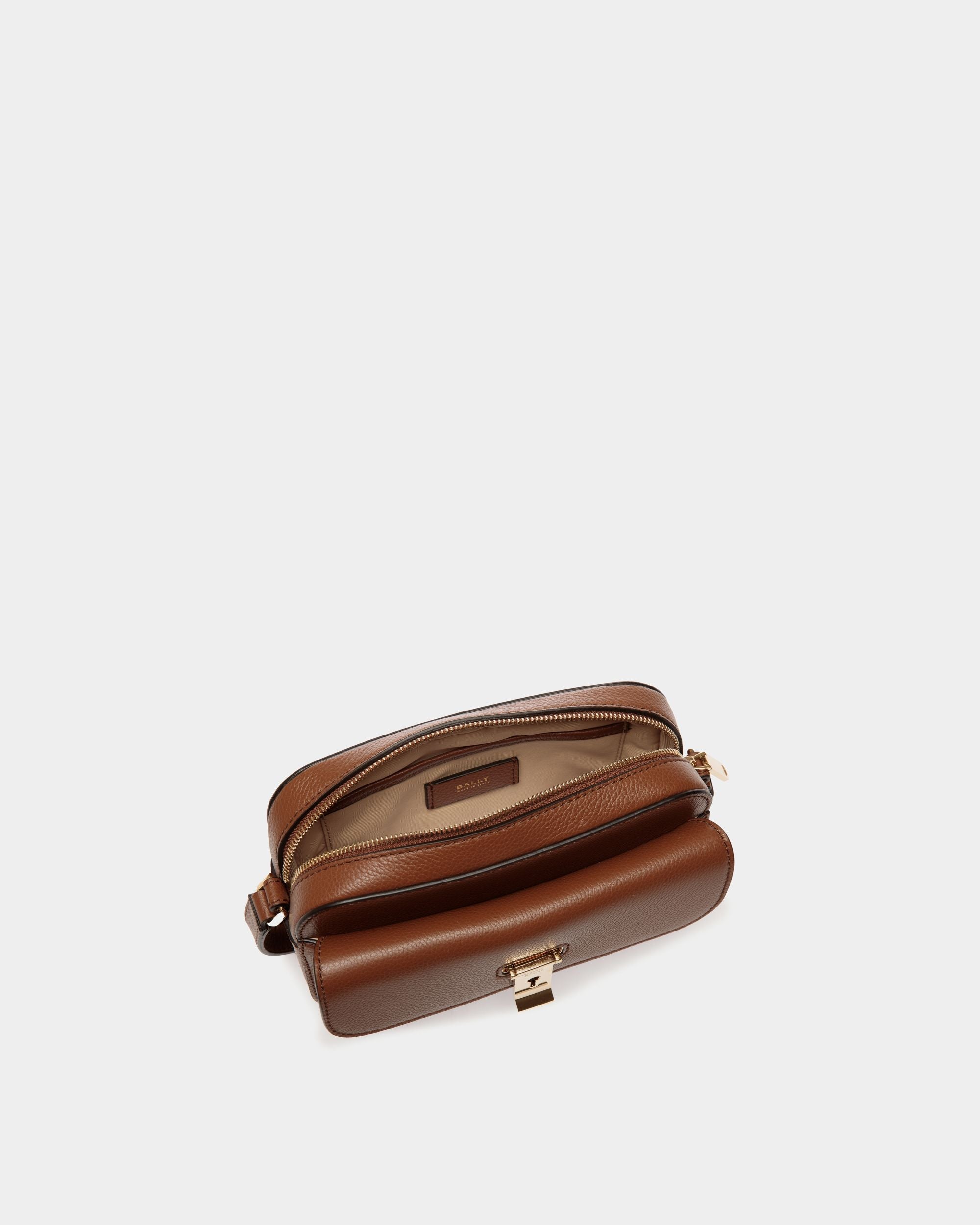This Lock Me small crossbody bag in brown grained leather is crafted into a soft rectangular silhouette and embellished by iconic Bally hardware with an engraved logo. The adjustable strap provides a choice between cross-body or shoulder portability.