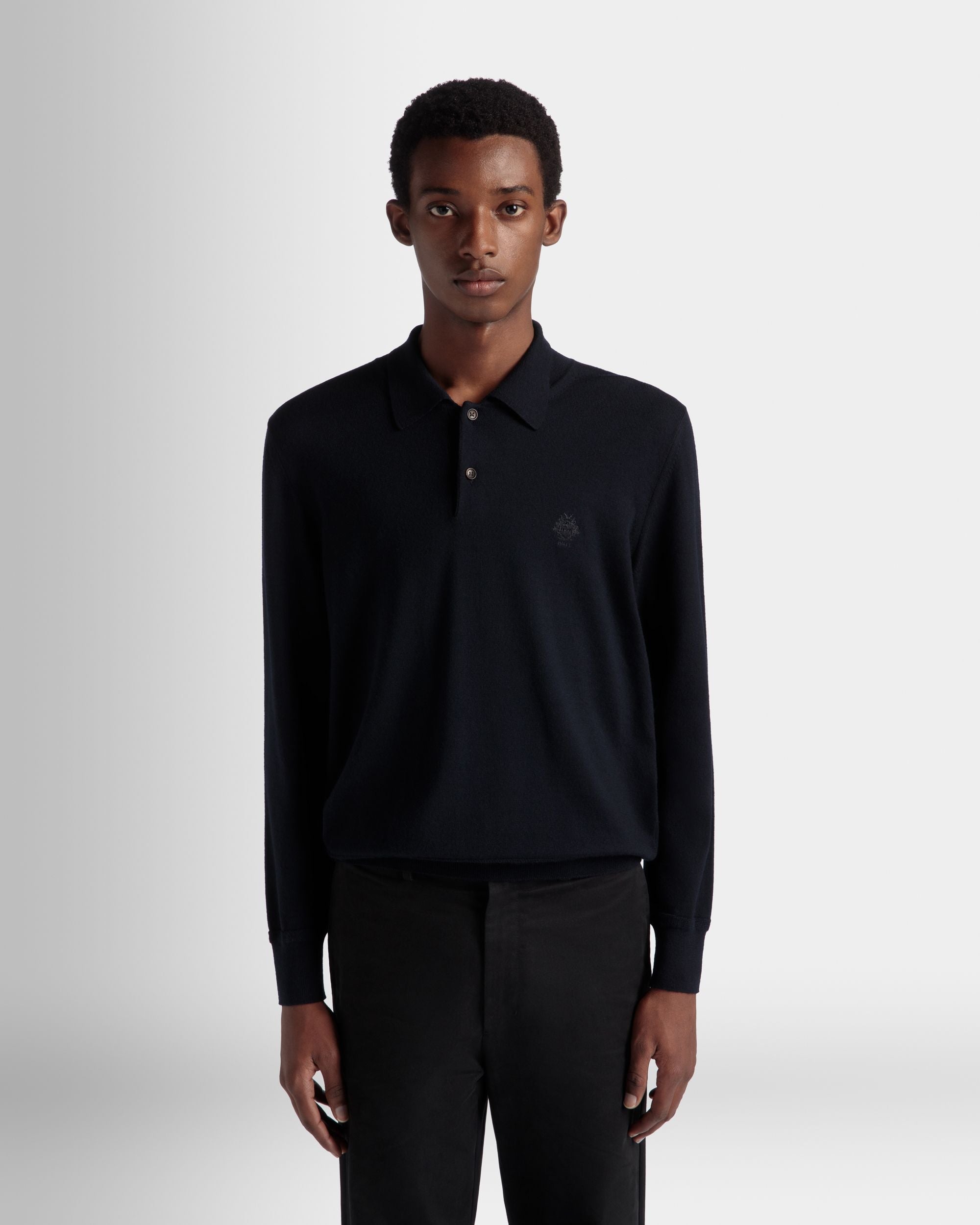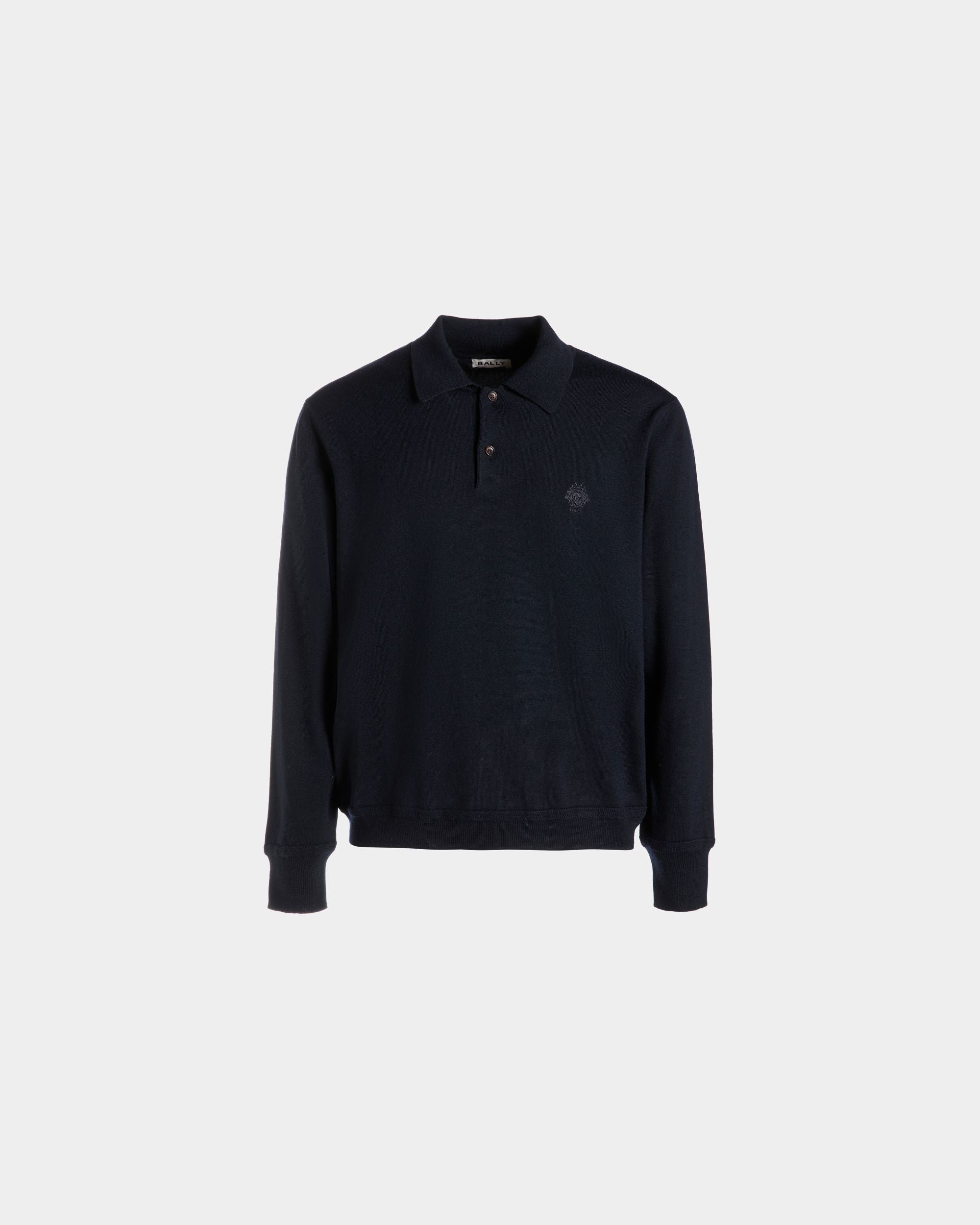Long Sleeve Polo With Bally Crest Logo In Navy Blue Wool