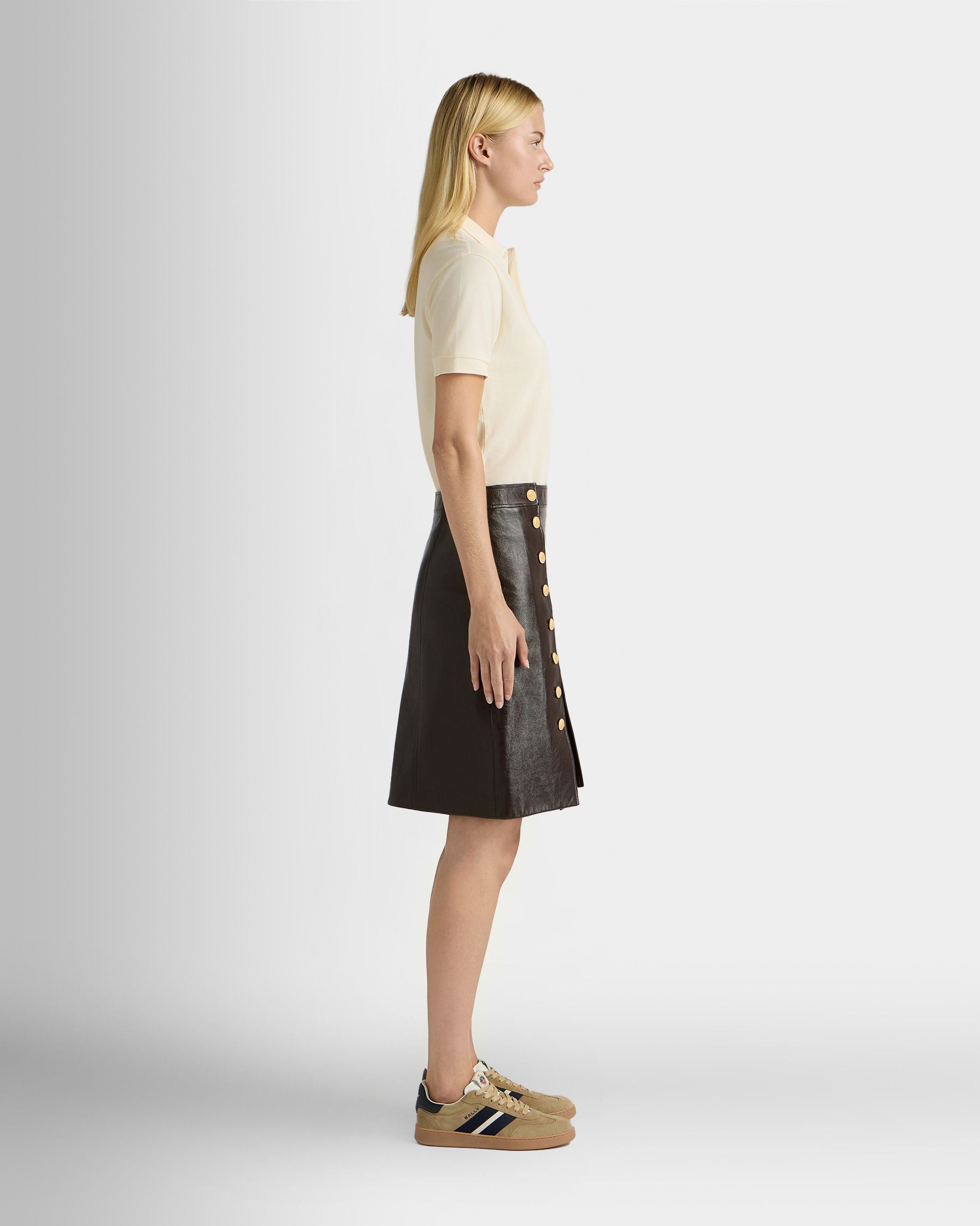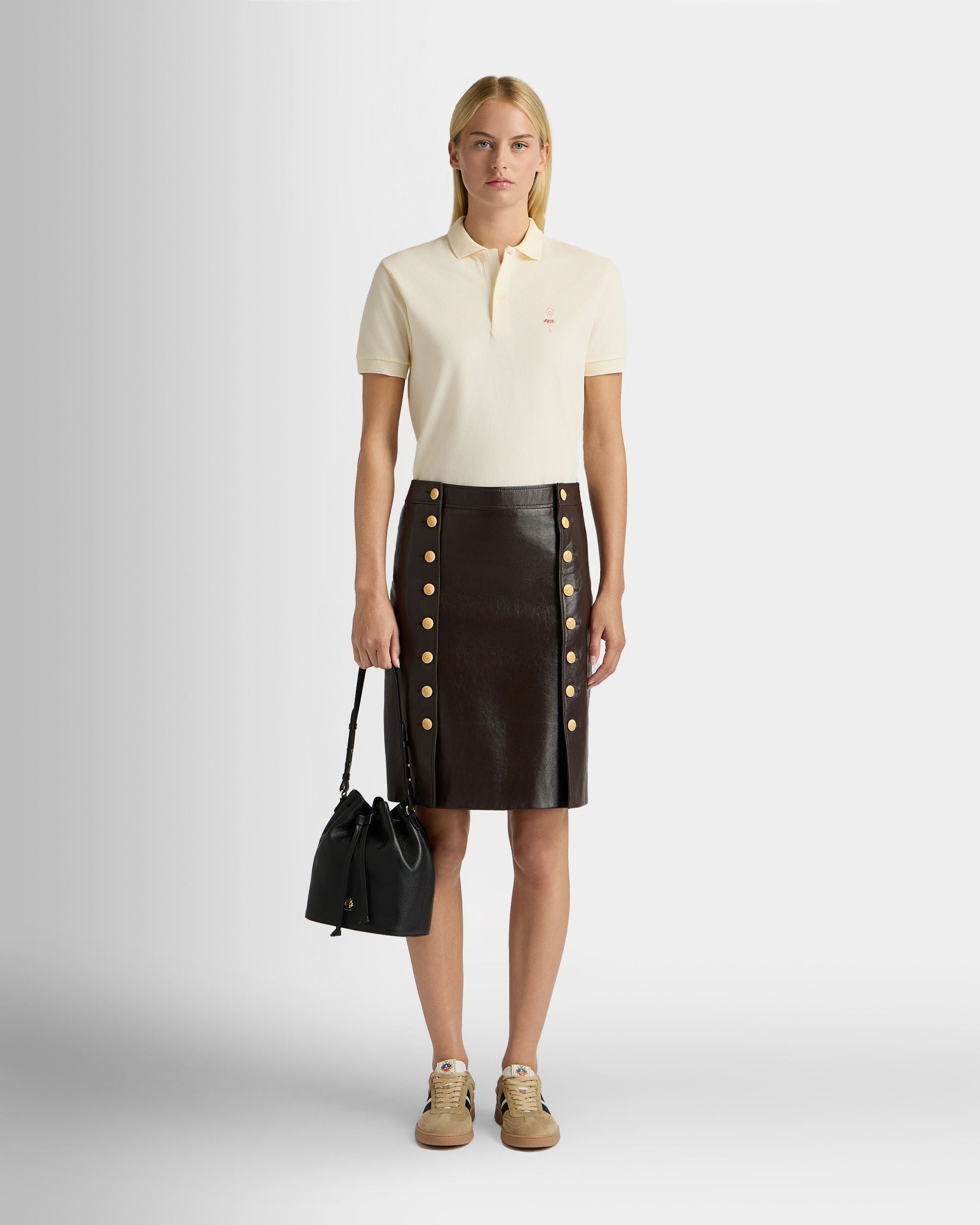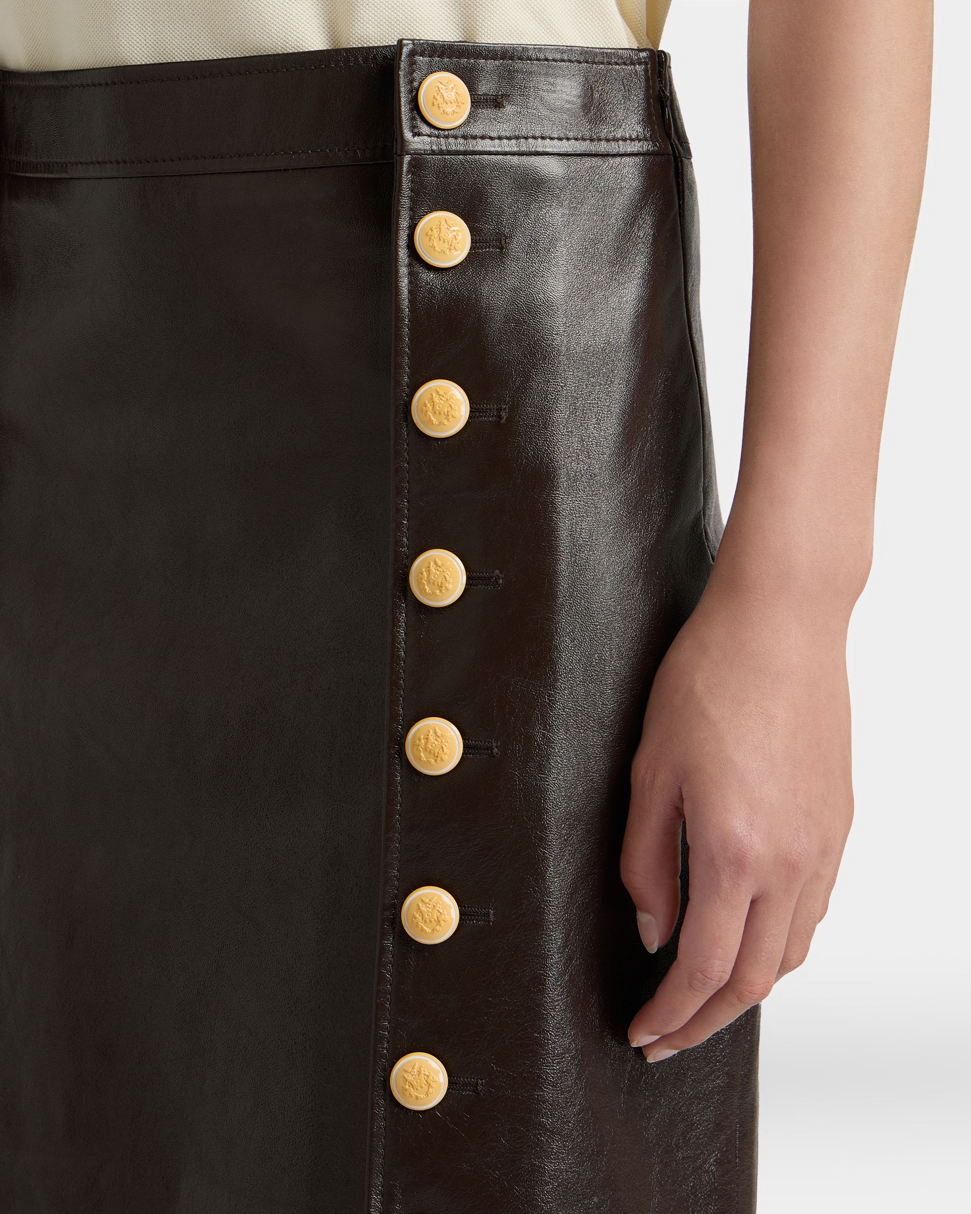 This midi-length skirt in soft lambskin is defined by two columns of Bally Crest buttons in pale yellow galalith, uniting the lateral panels with the front of the skirt.
