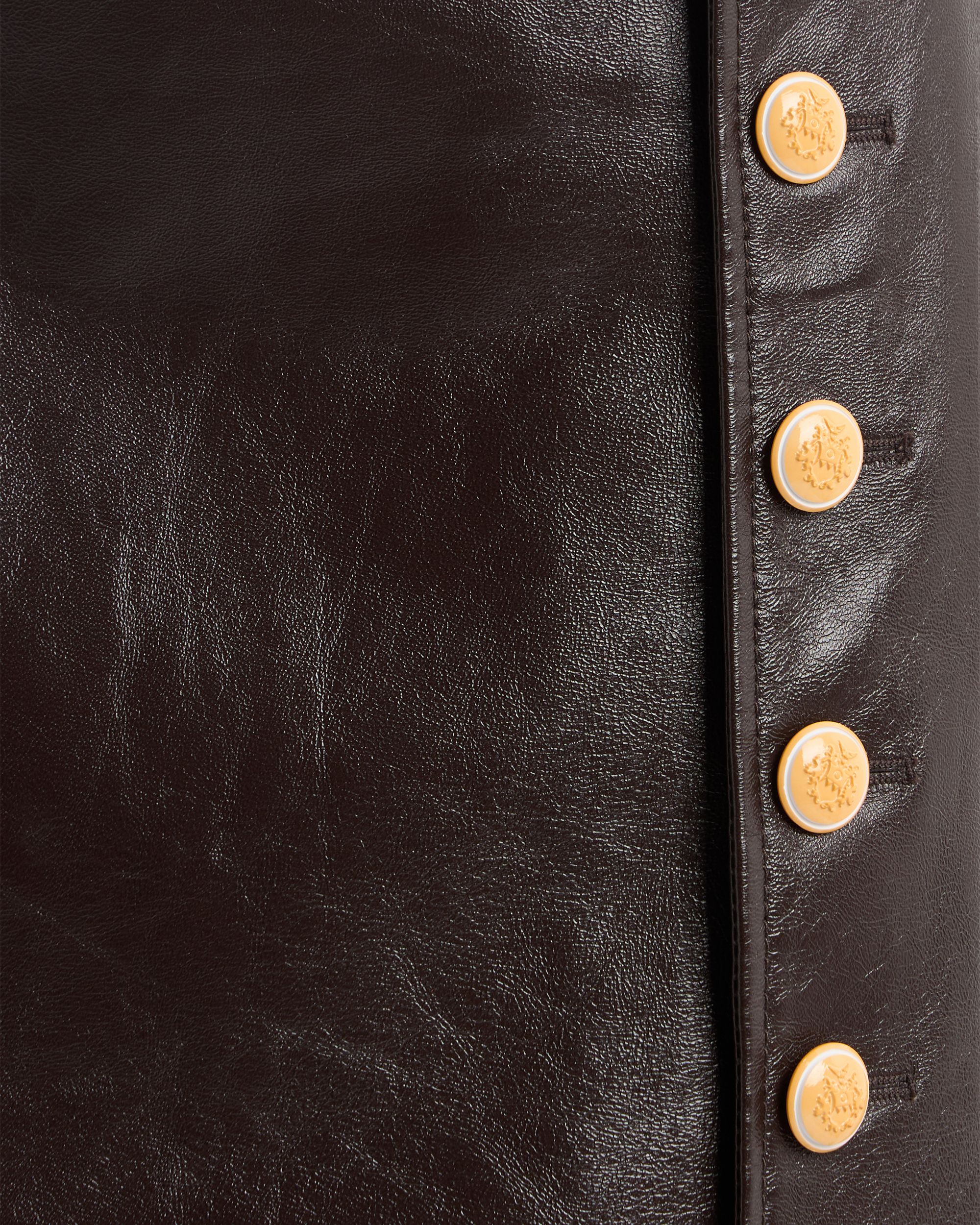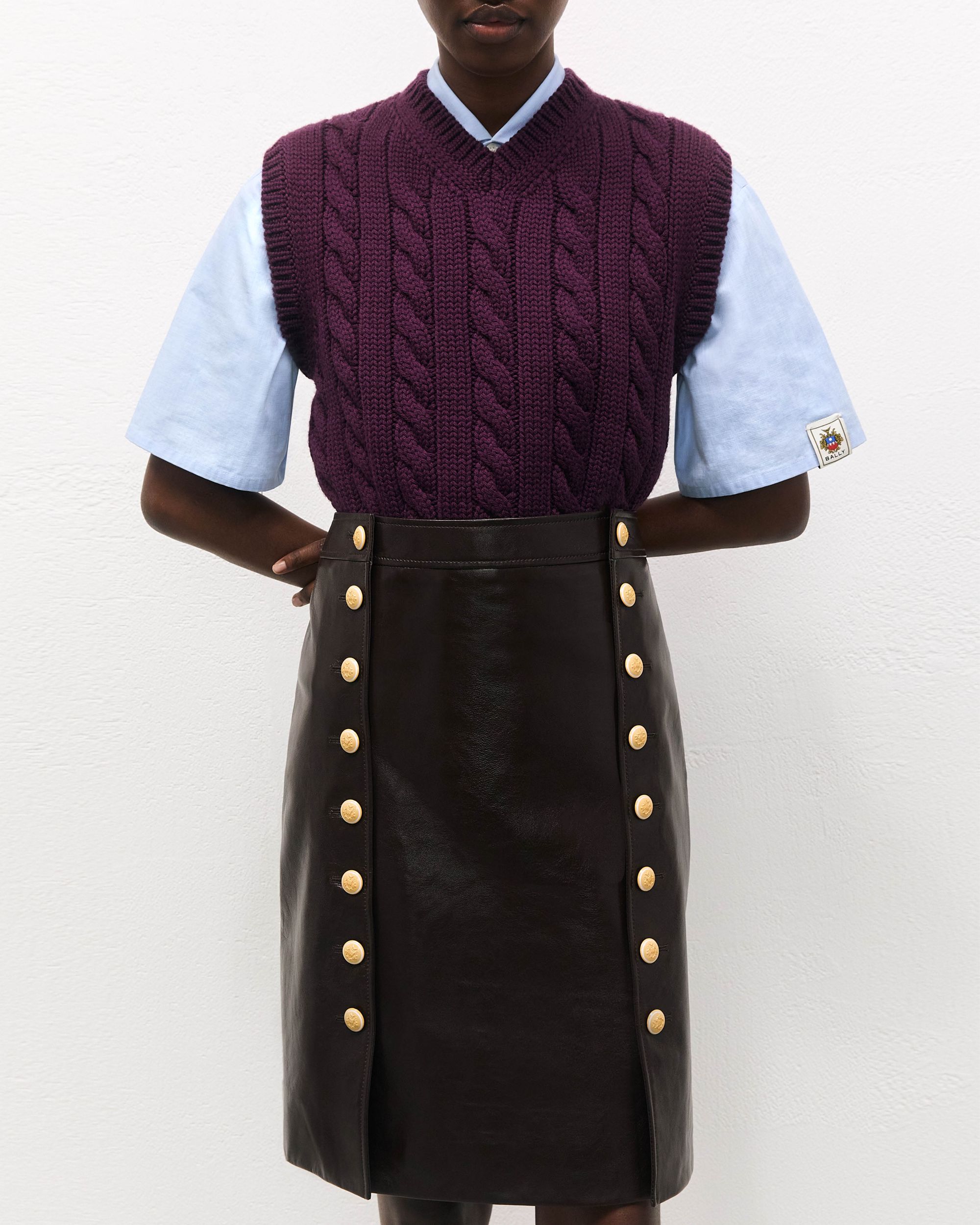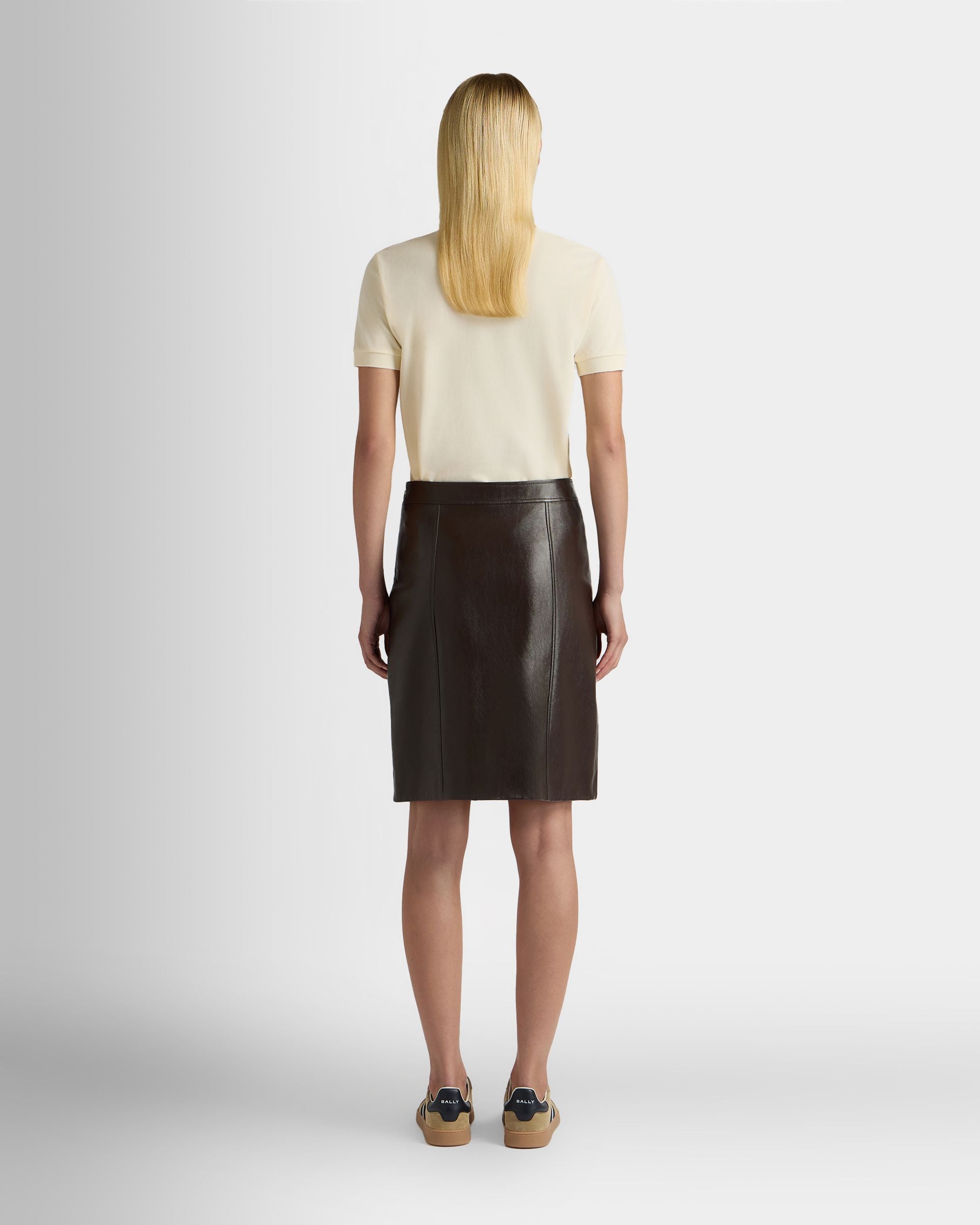 This midi-length skirt in soft lambskin is defined by two columns of Bally Crest buttons in pale yellow galalith, uniting the lateral panels with the front of the skirt.