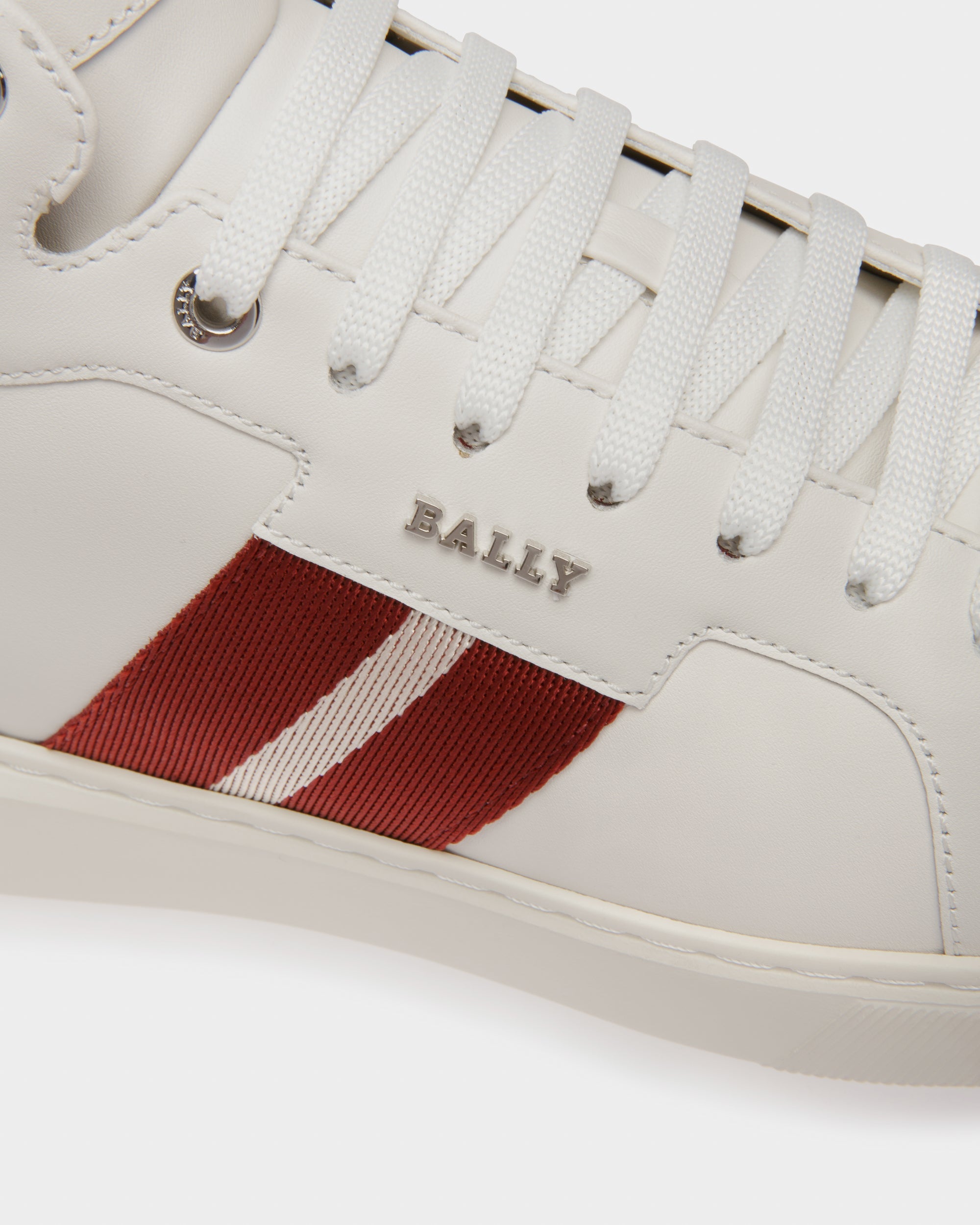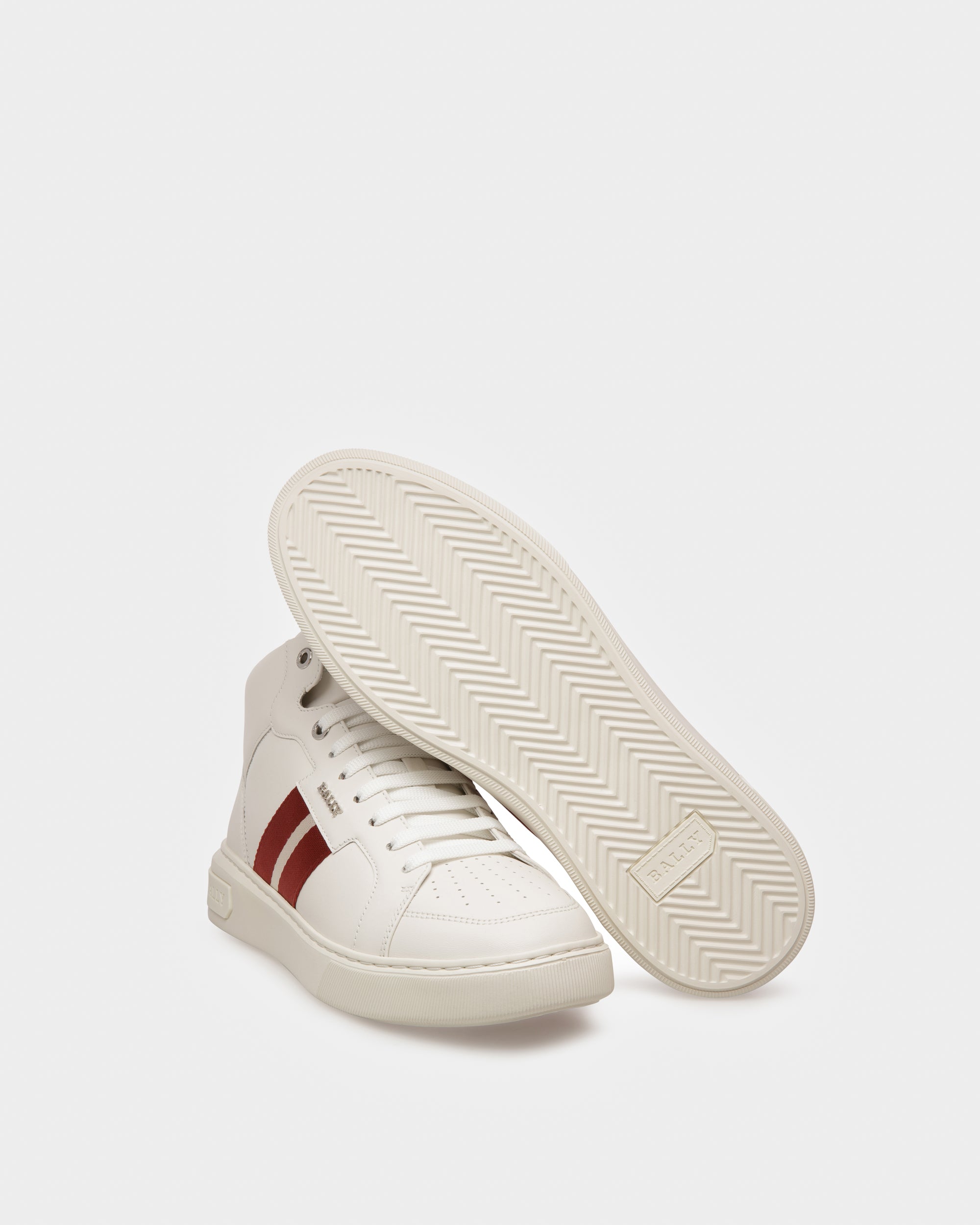 A super lightweight rubber sole gives the Bally Lift sneaker collection its gravity-defying name and enduring comfort, presented here across the Myles; a mid-cut, lace-up style in white leather with Bally Stripe detailing.