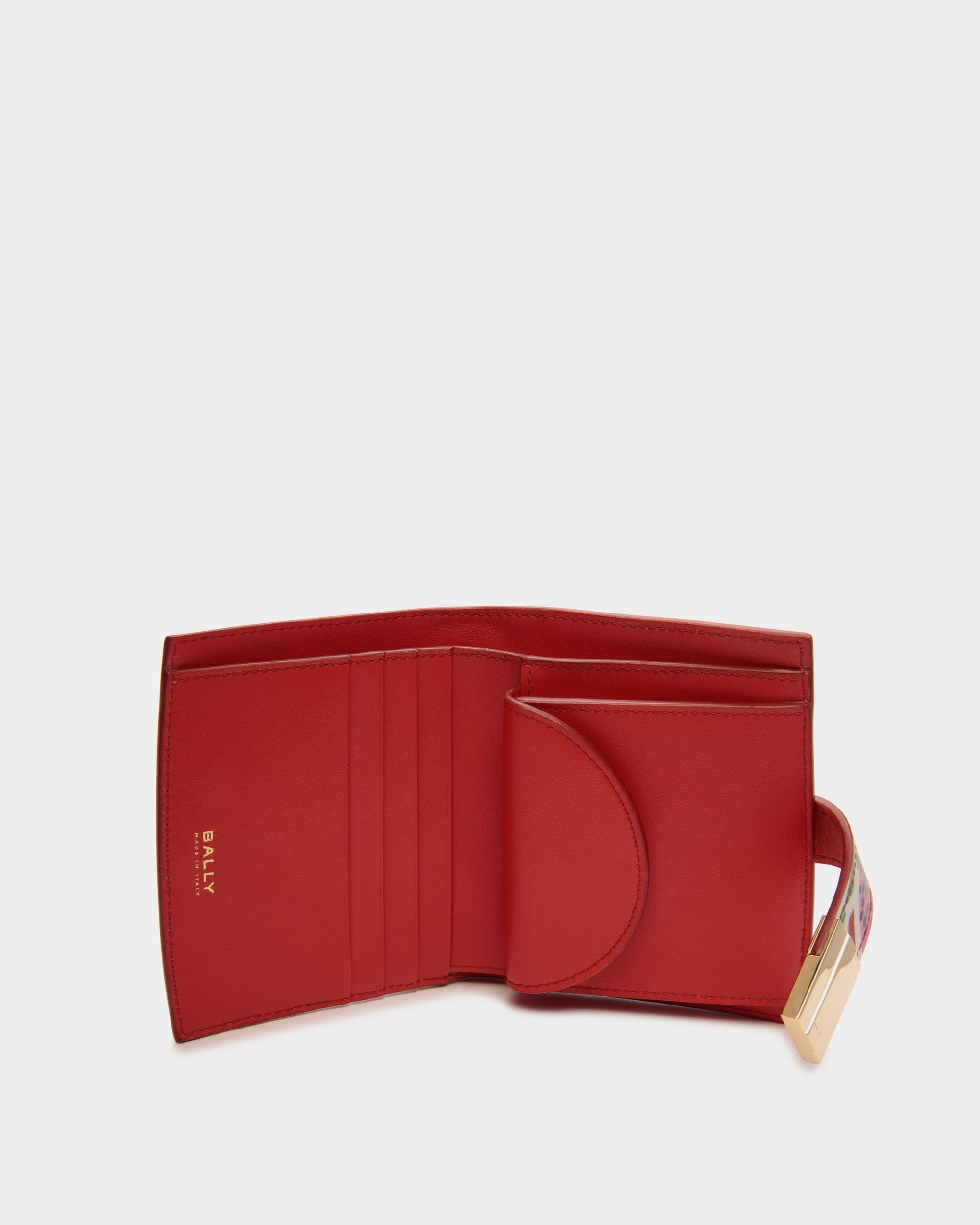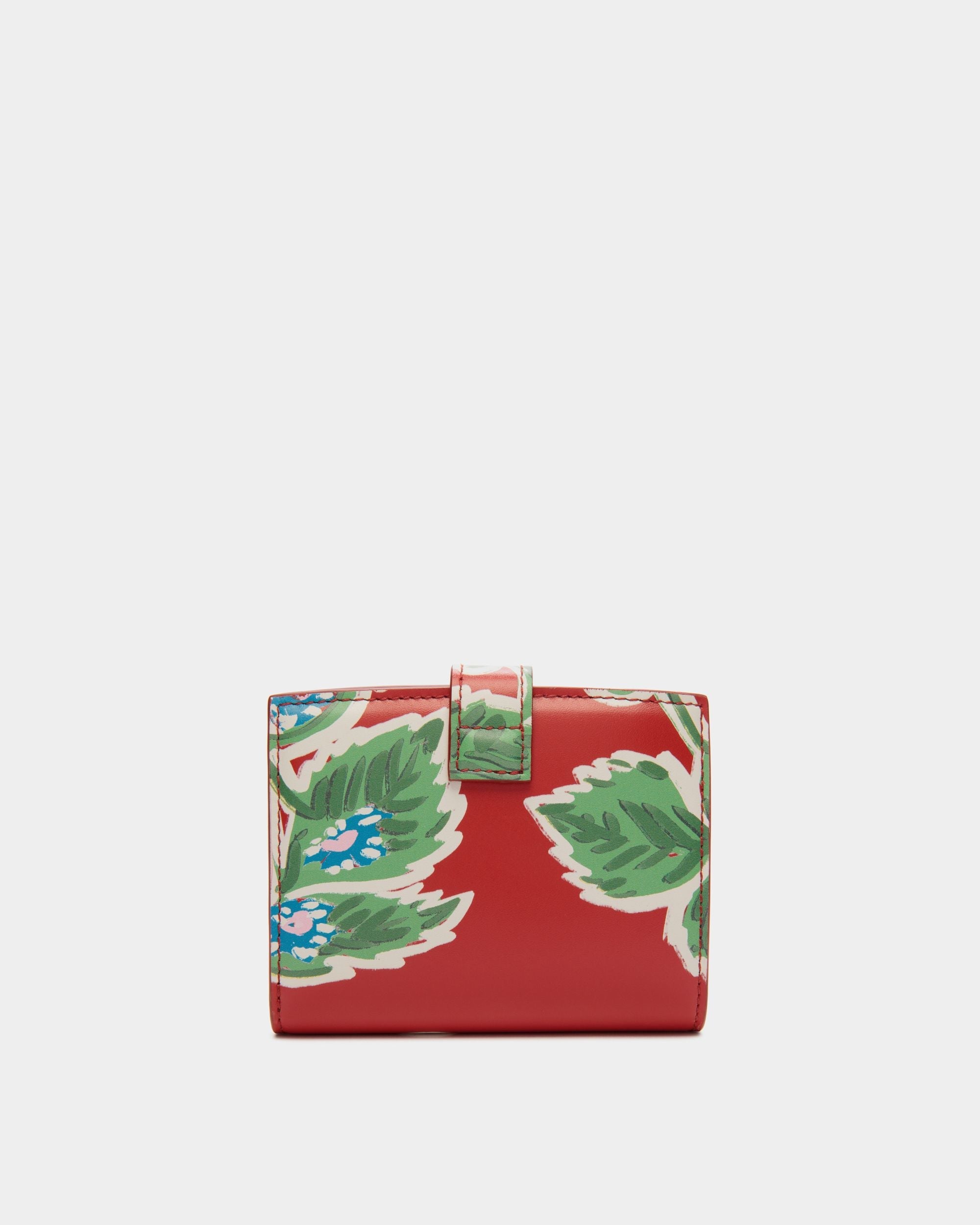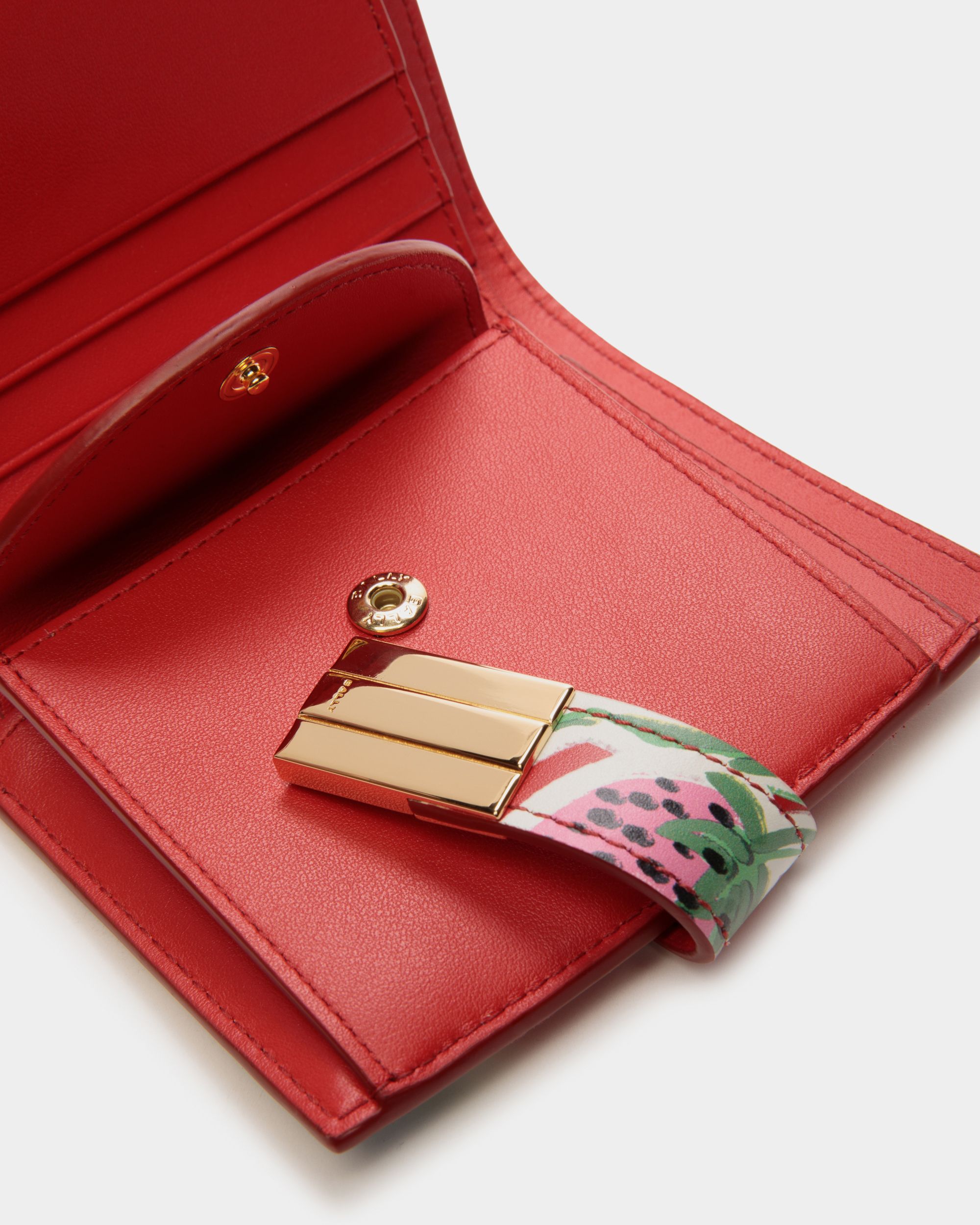 Ollam wallet in Strawberry Print red leather with gold-tone metal hardware. Compact yet perfectly organized, this accessory exudes timeless elegance and offers practicality with multiple card slots and compartments.