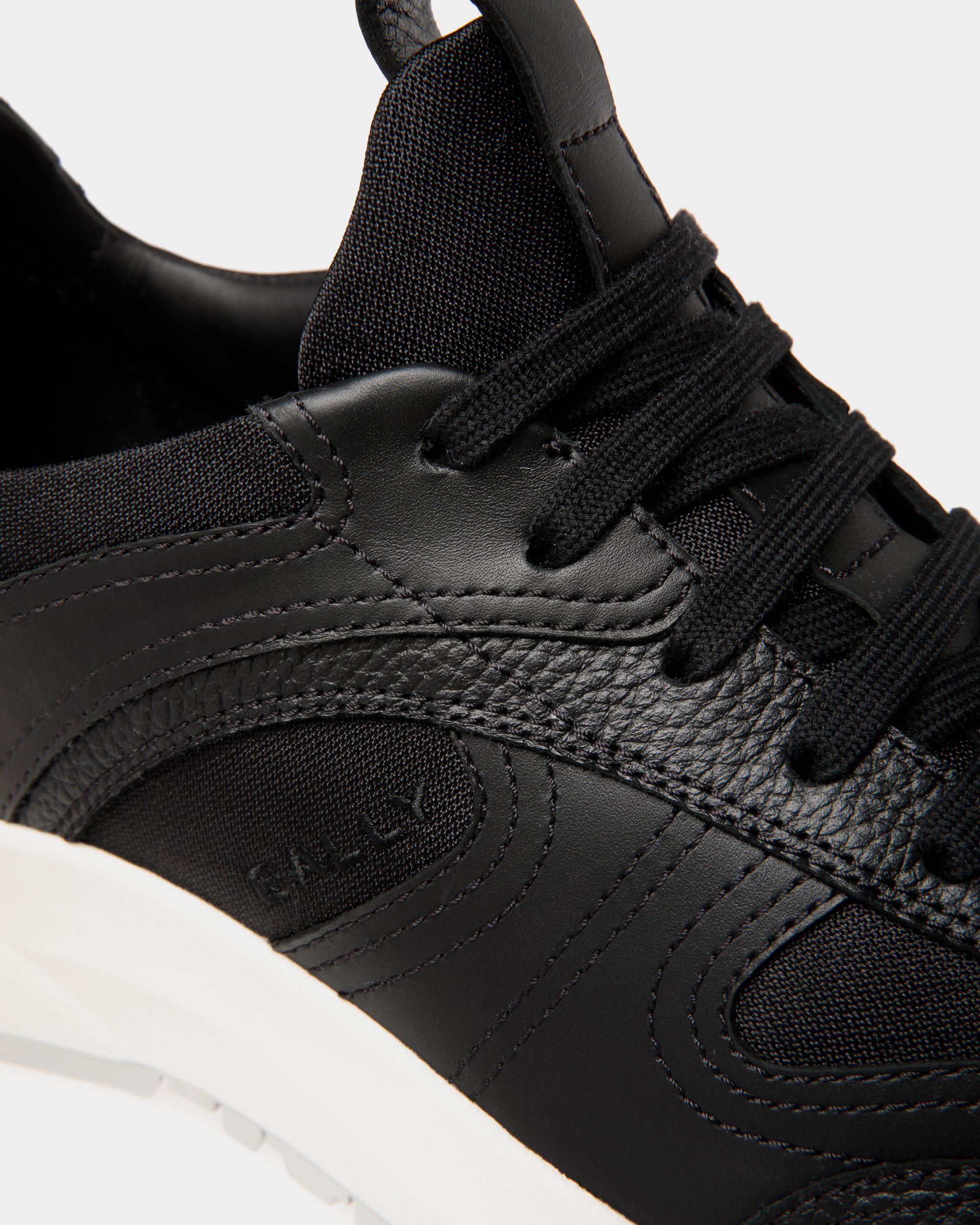 This Outline sneaker combines black leather and nylon. The thick rubber sole interprets classic running looks, complete with Bally grip tread on the Vibram outsole.