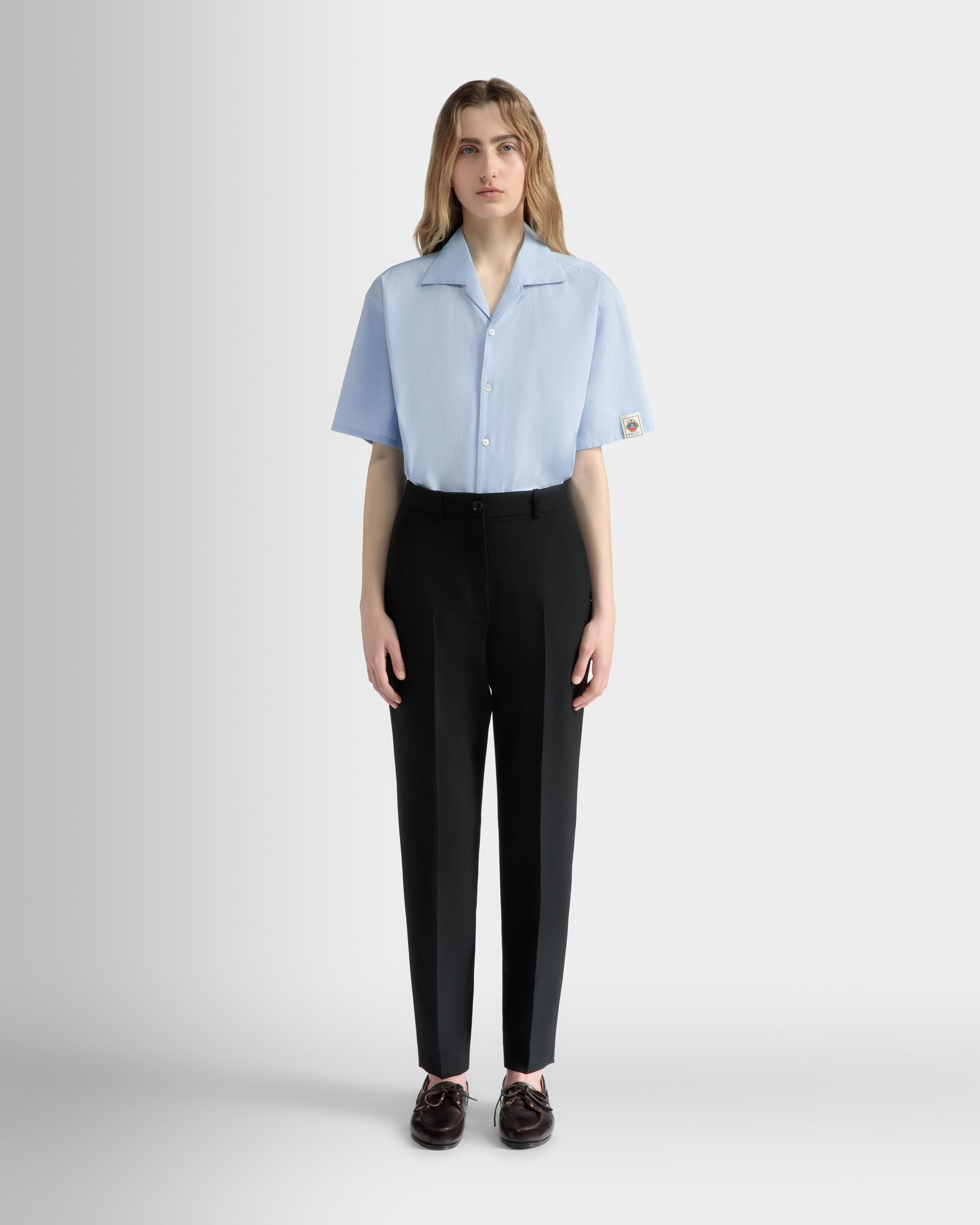 Light blue oversized cotton shirt with a point collar and an embroidered Bally Crest tab on one sleeve. Crafted for comfort and style, a must-have piece for your modern wardrobe.