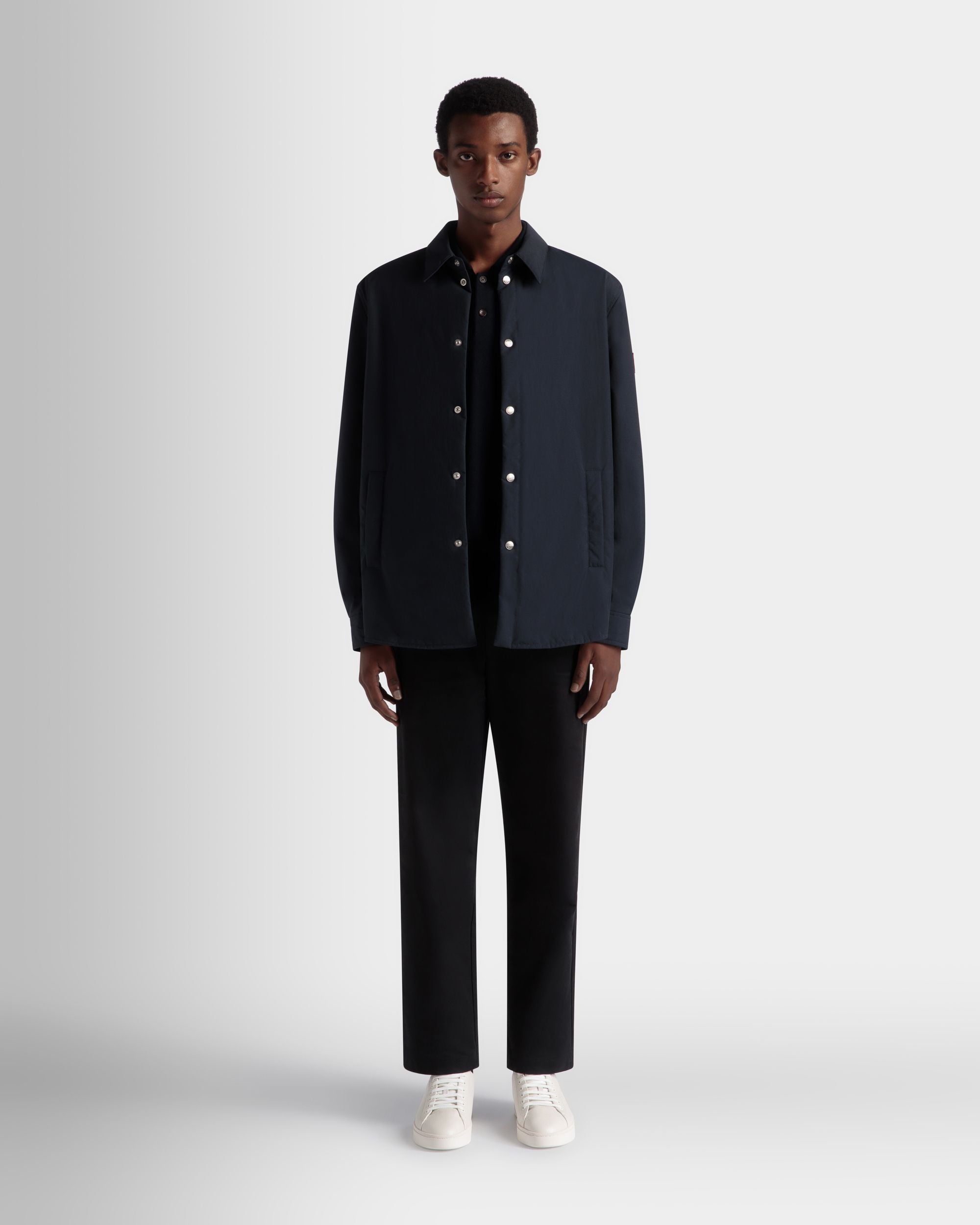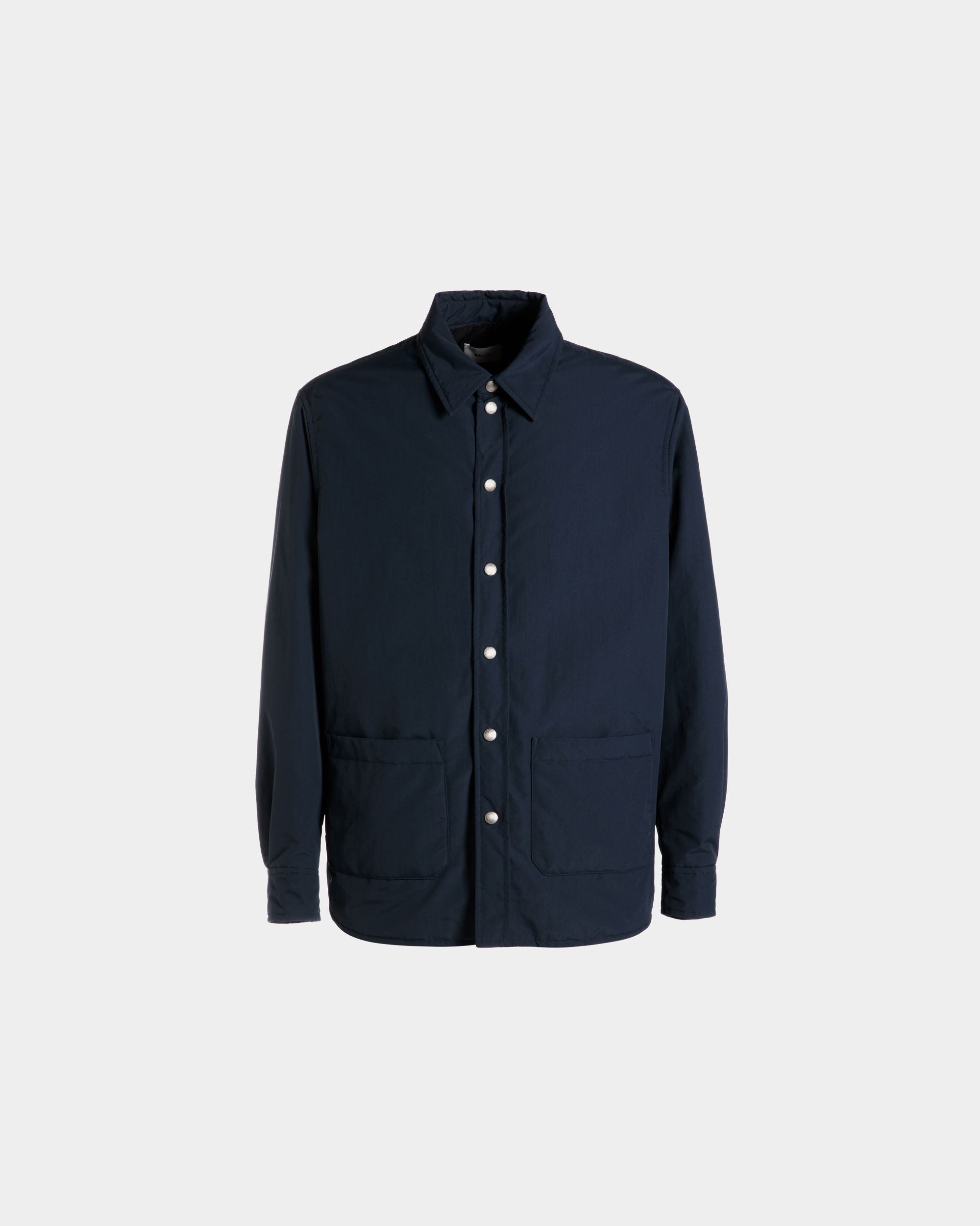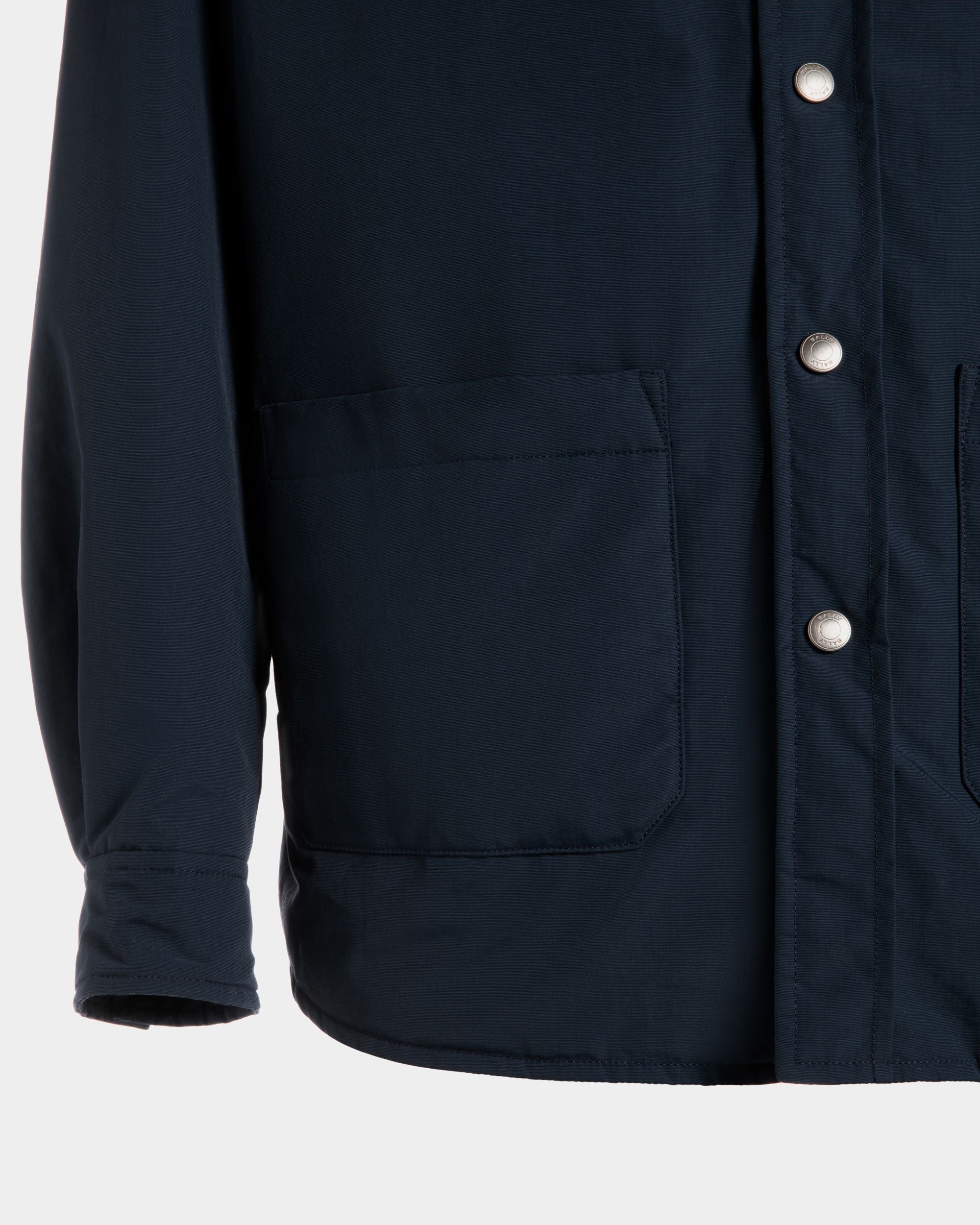 In navy blue nylon fabric, this padded shirt jacket has a snap button fastening down the front for varied styling options. Two ample patch pockets keep essentials on hand. Matching snaps adjust the fit of the cuffs.