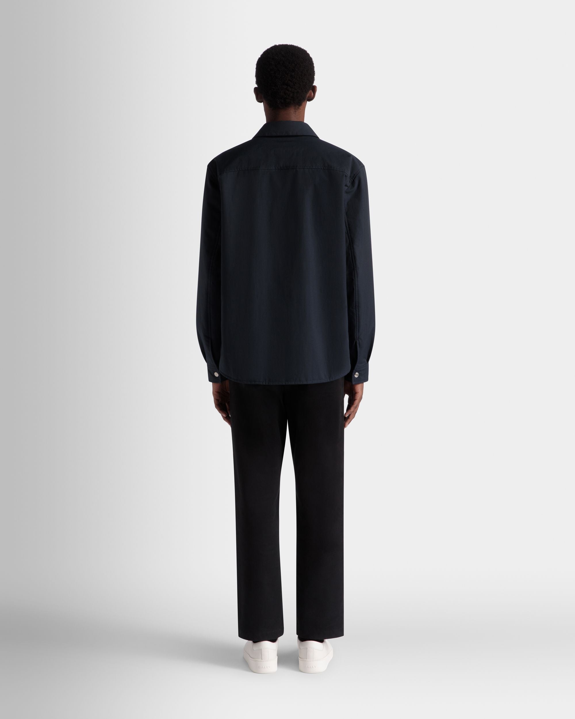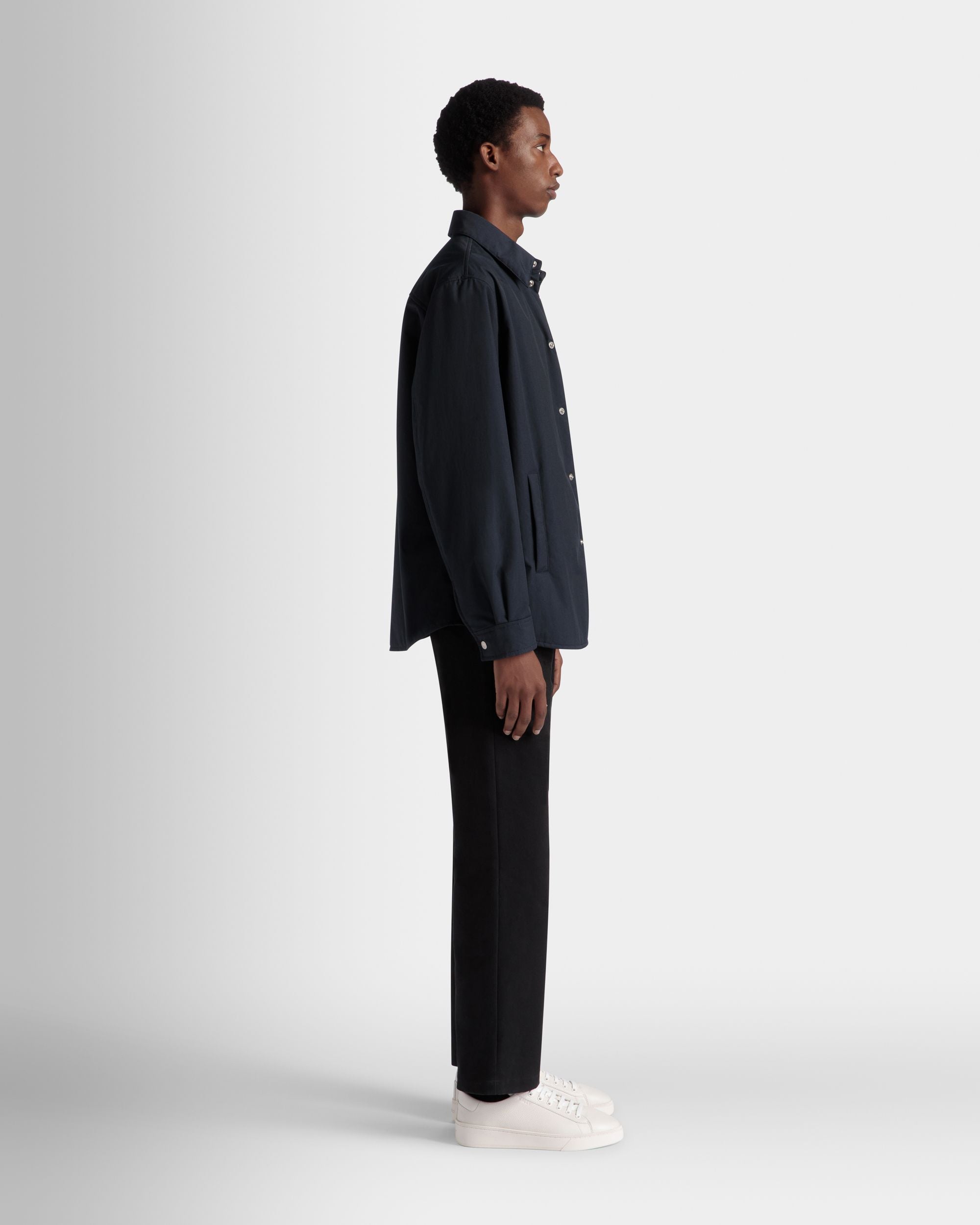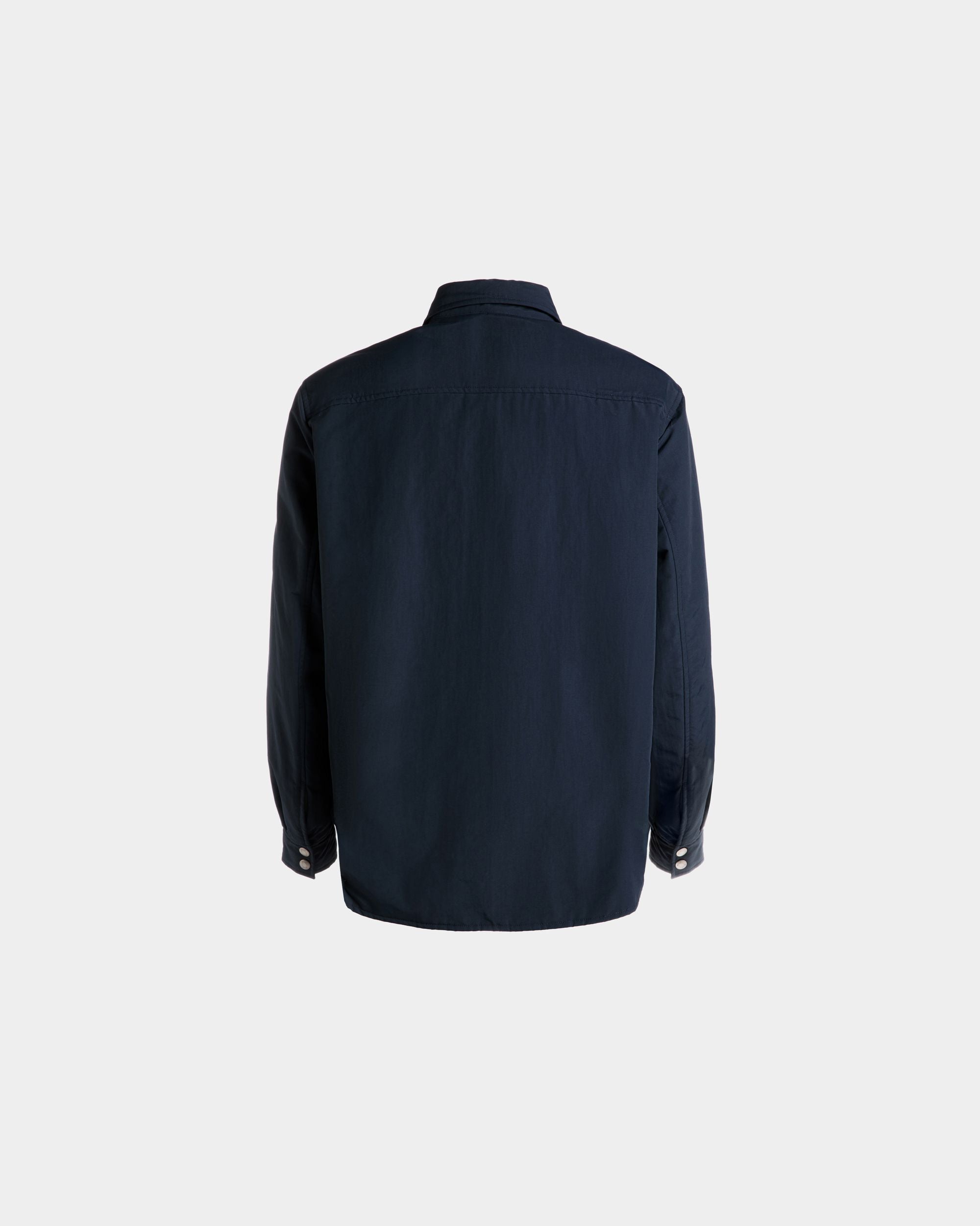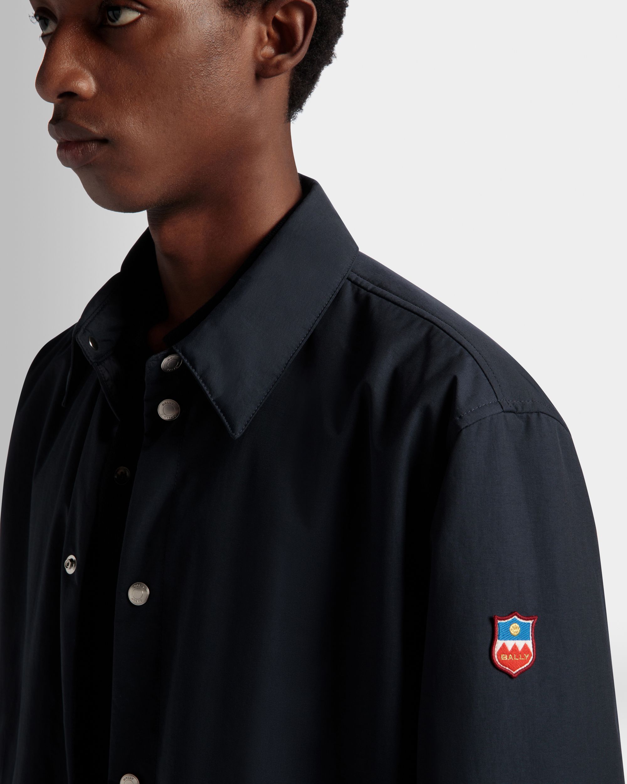 In navy blue nylon fabric, this padded shirt jacket has a snap button fastening down the front for varied styling options. Two ample patch pockets keep essentials on hand. Matching snaps adjust the fit of the cuffs.