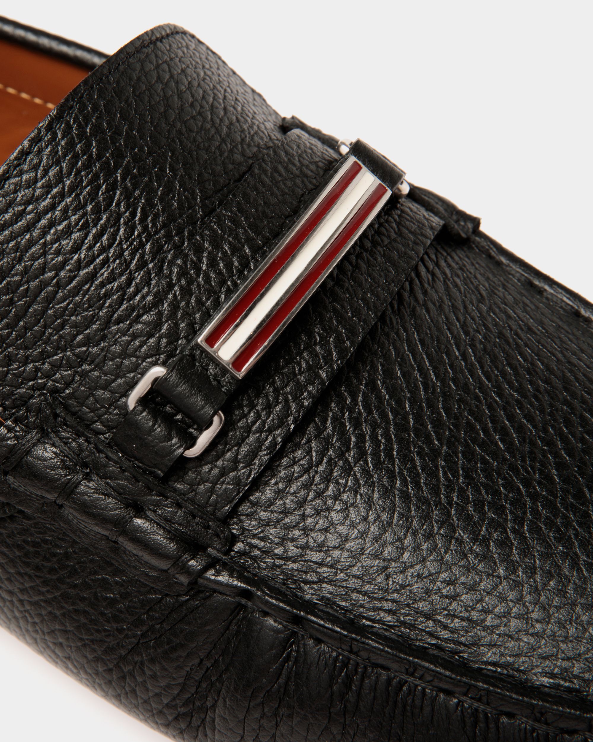 Classic and timeless, this Pilot driver in black grained leather is trimmed by a metal and enamel Bally Ribbon horse bit across the top of the vamp. Tubular Blake construction and a rubber split sole ensure step-in comfort.