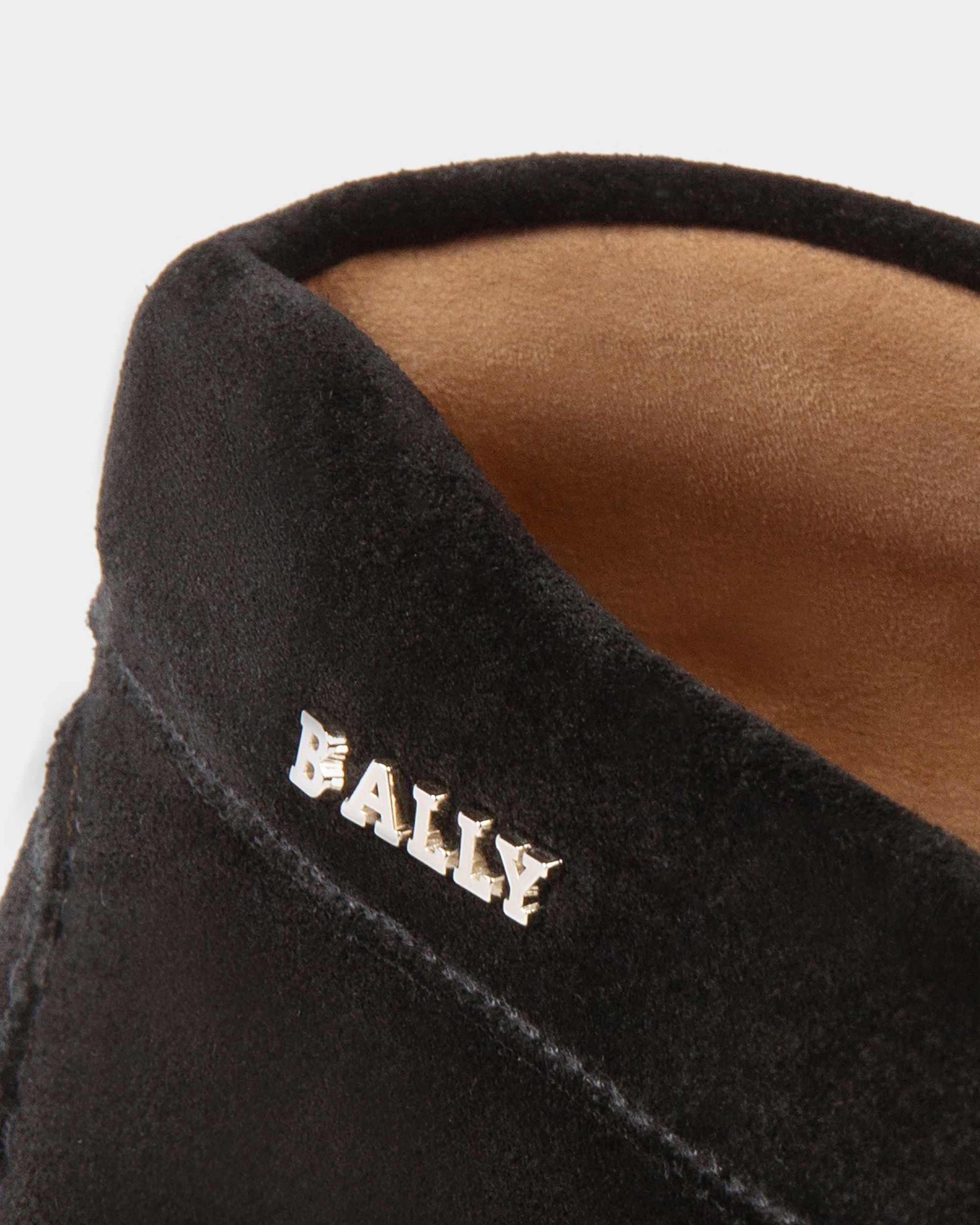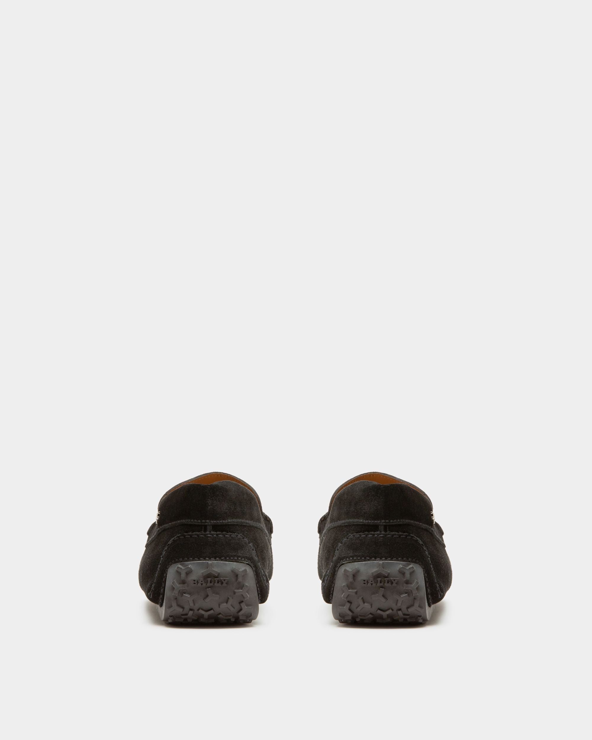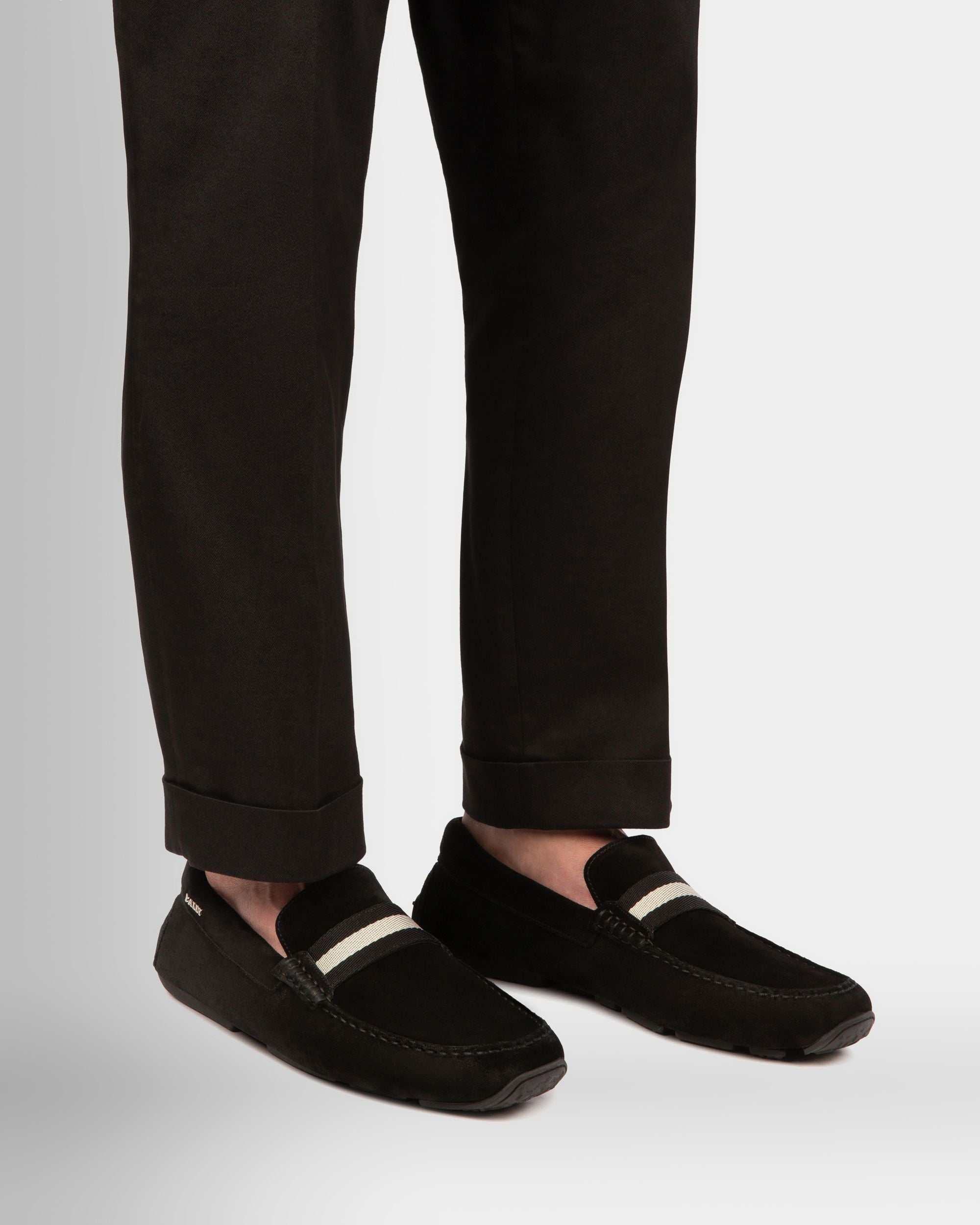 Comfort is a true luxury with these exquisitely crafted slip-on drivers. In softest black suede with a split rubber sole for flexibility, a Bally ribbon extends across the top of these shoes, in an expression of their essential aesthetic.
