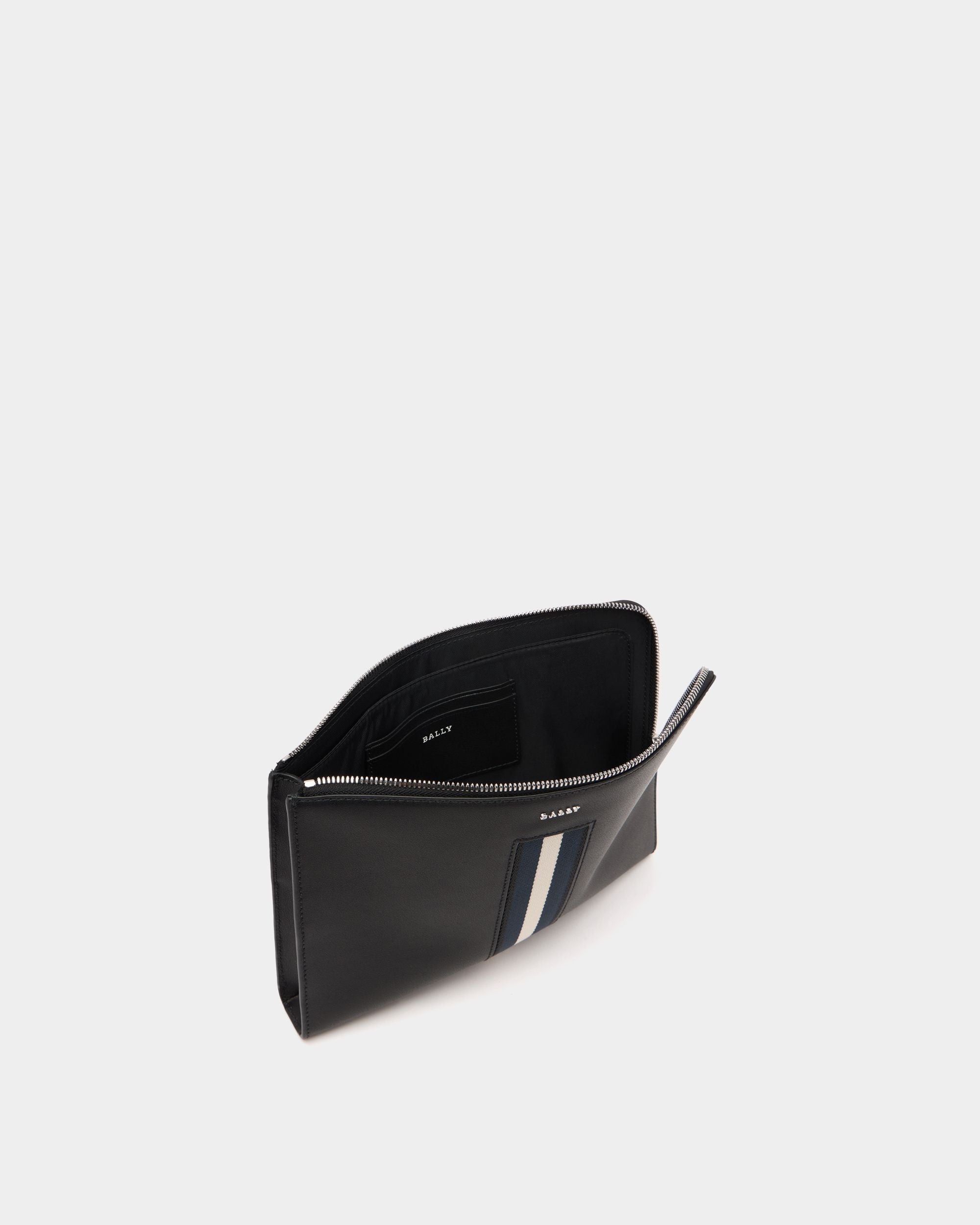 This pouch is designed into a rectangular silhouette in black leather with a fine grained finish. A Bally Ribbon in red and white grosgrain adds a distinct signifier to the front.