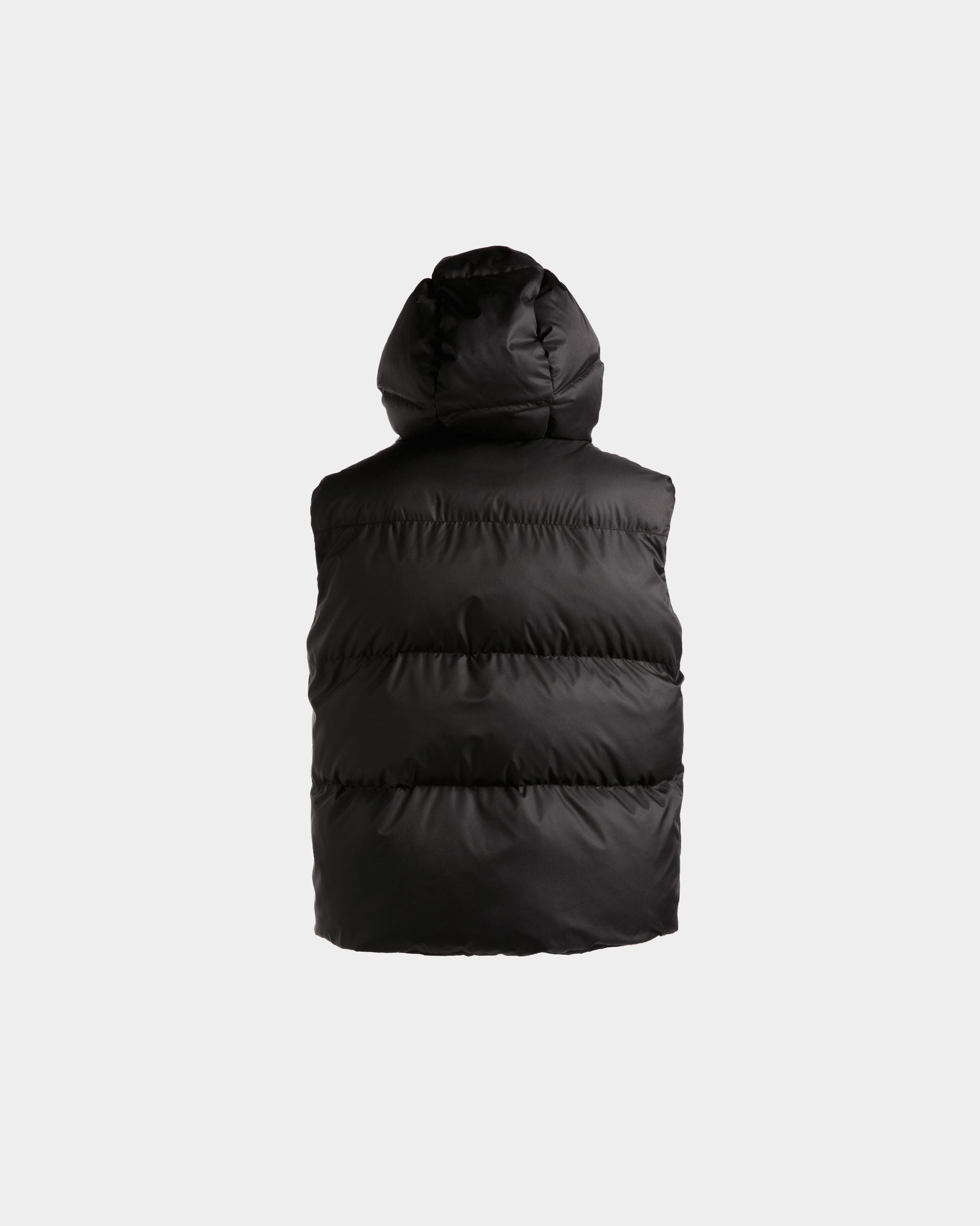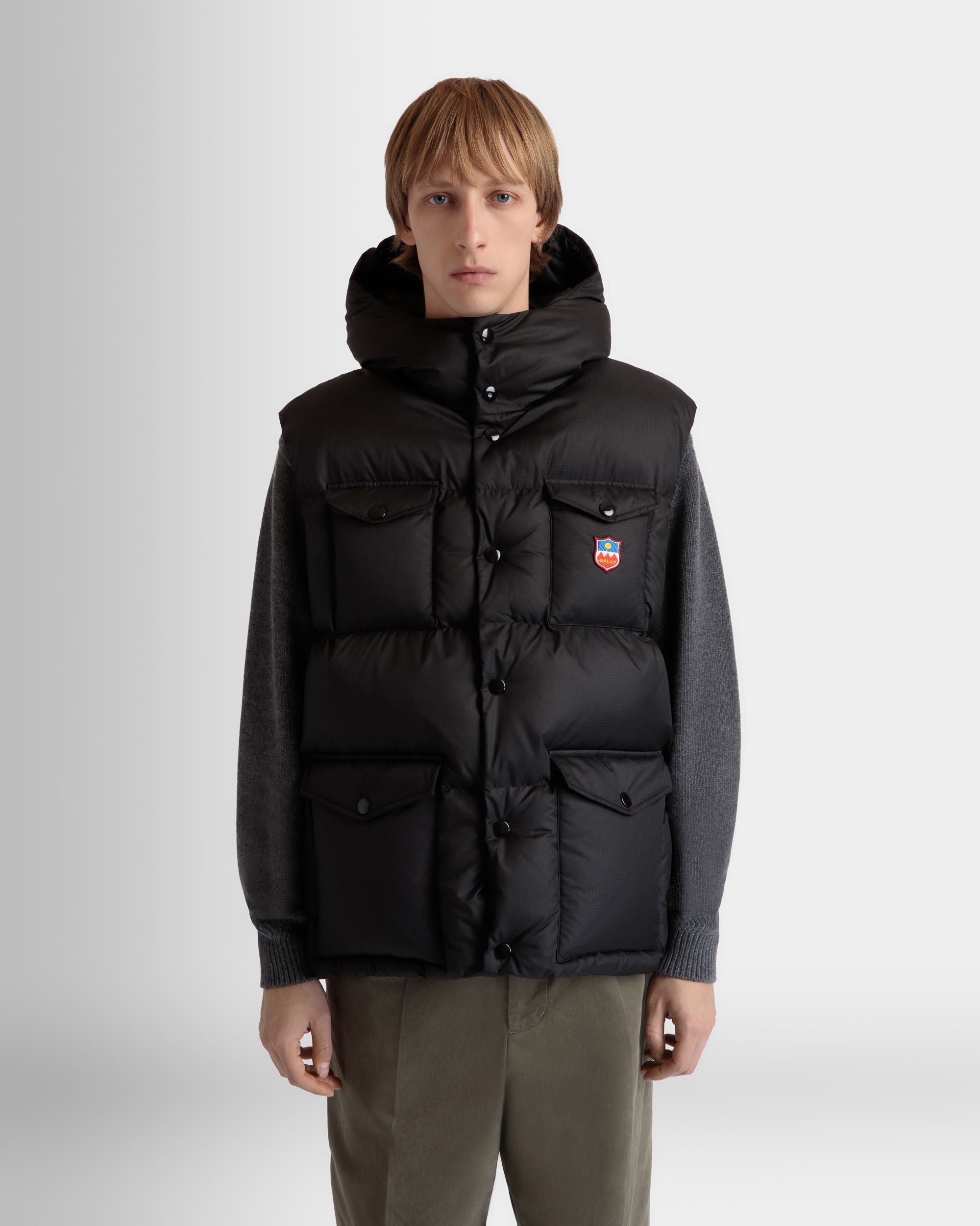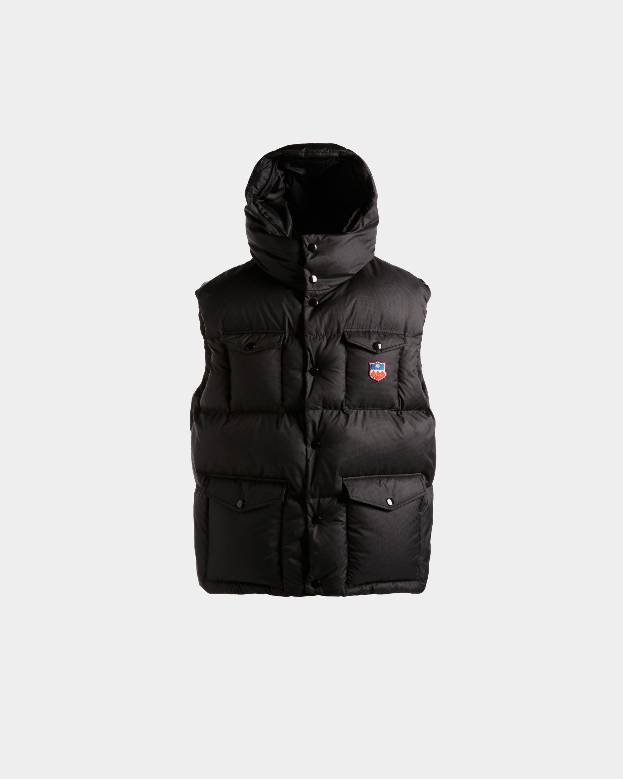 This hooded puffer vest with horizontal quilting is crafted with precision in water-repellent ripstop nylon. The front is completed by four patch pockets closed by snaps and a Bally Crest patch on the chest.