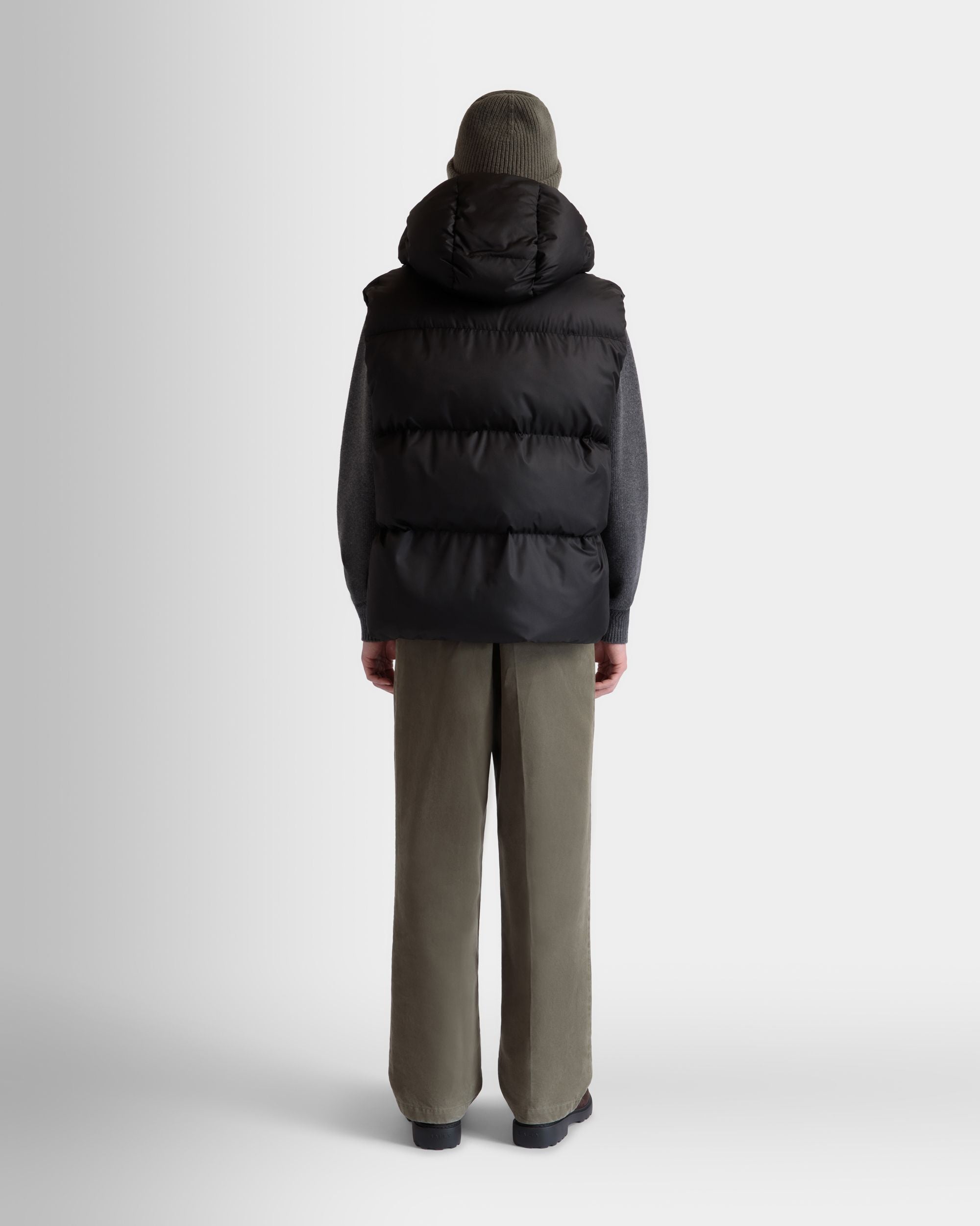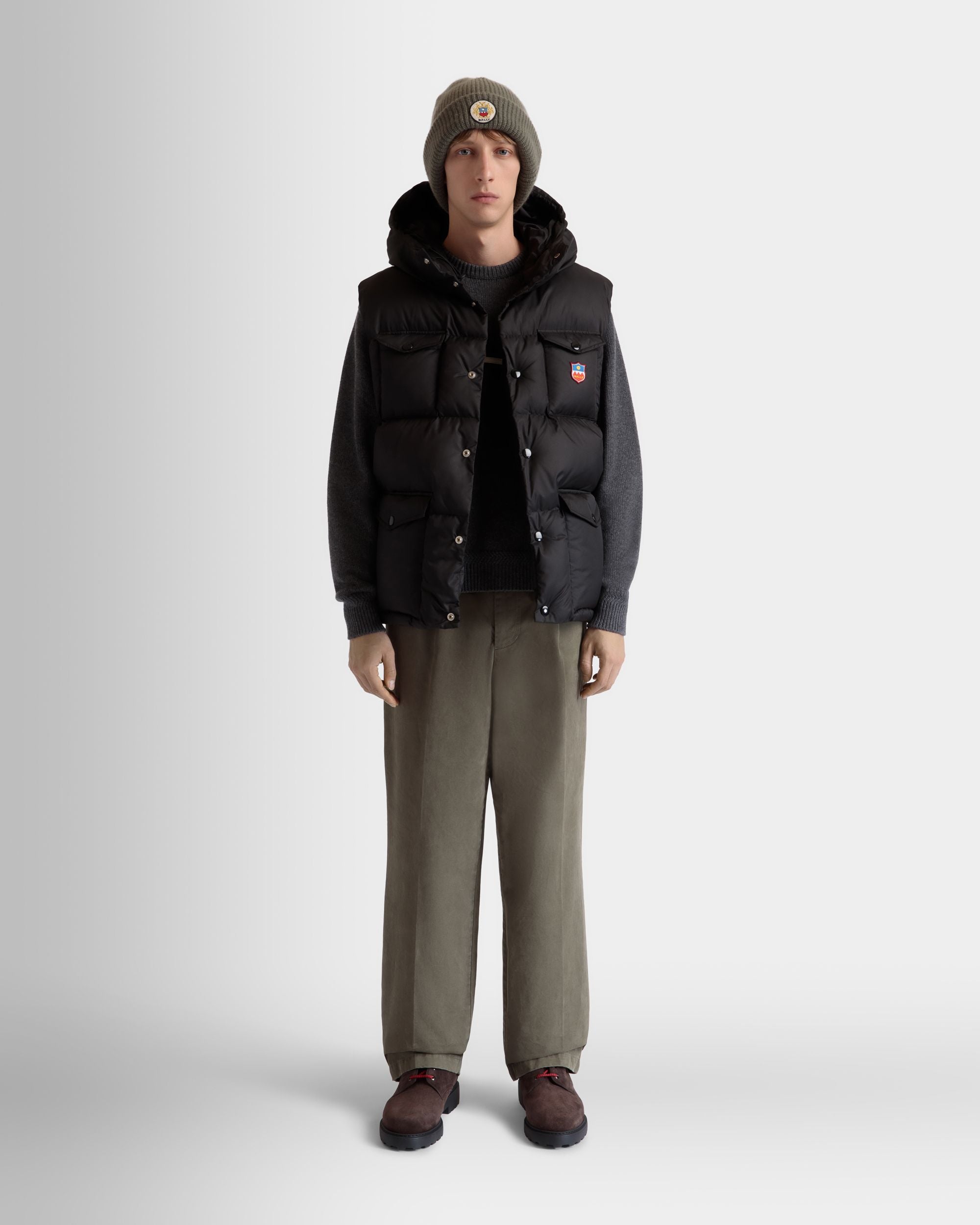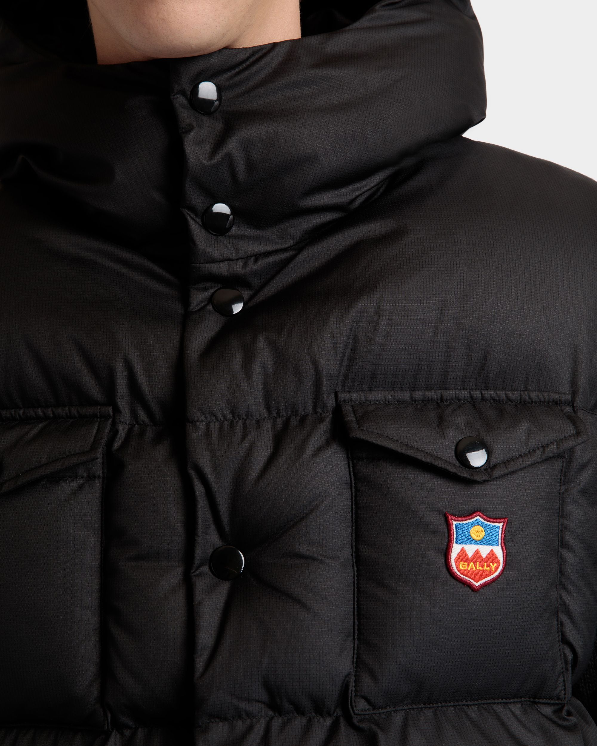 This hooded puffer vest with horizontal quilting is crafted with precision in water-repellent ripstop nylon. The front is completed by four patch pockets closed by snaps and a Bally Crest patch on the chest.