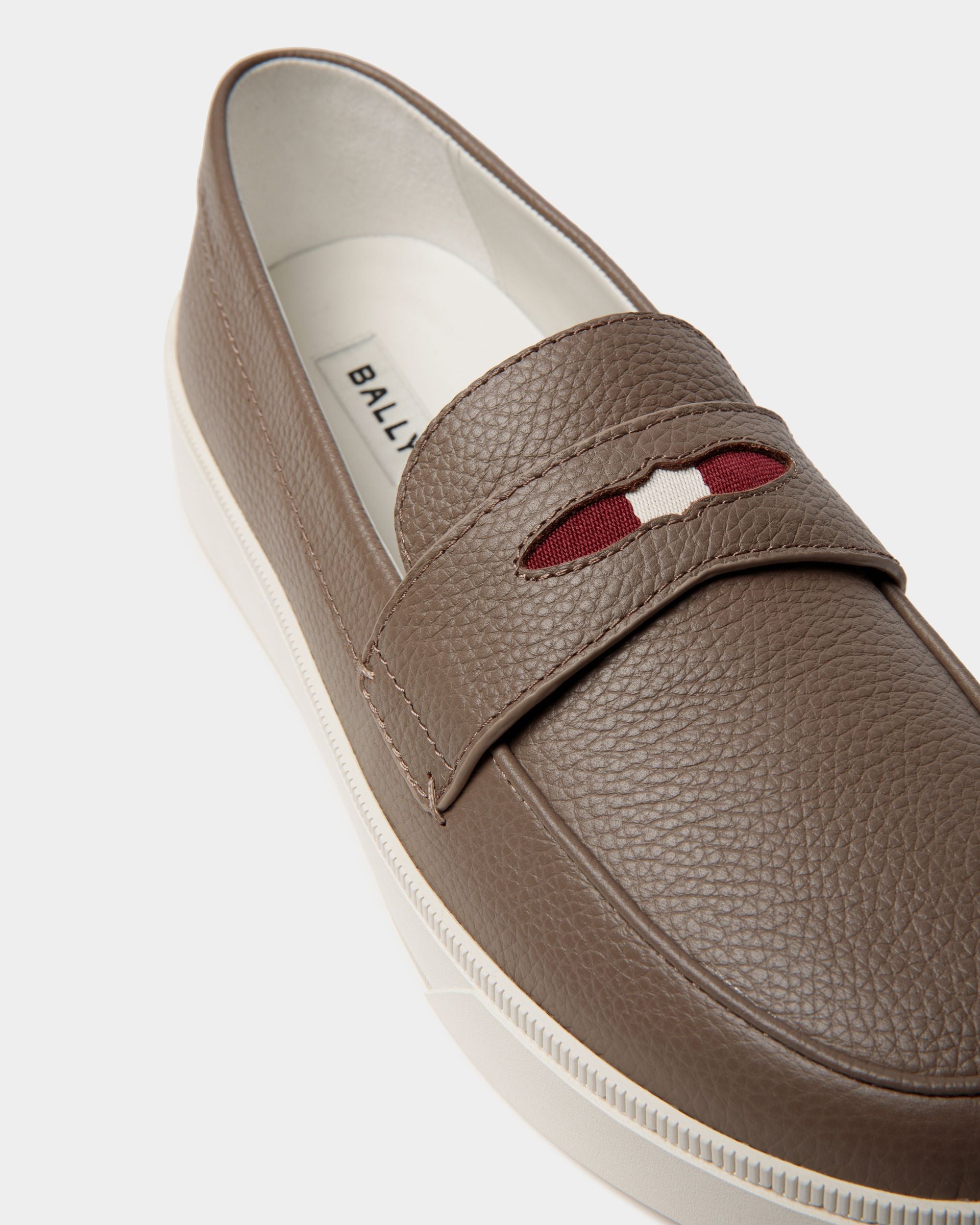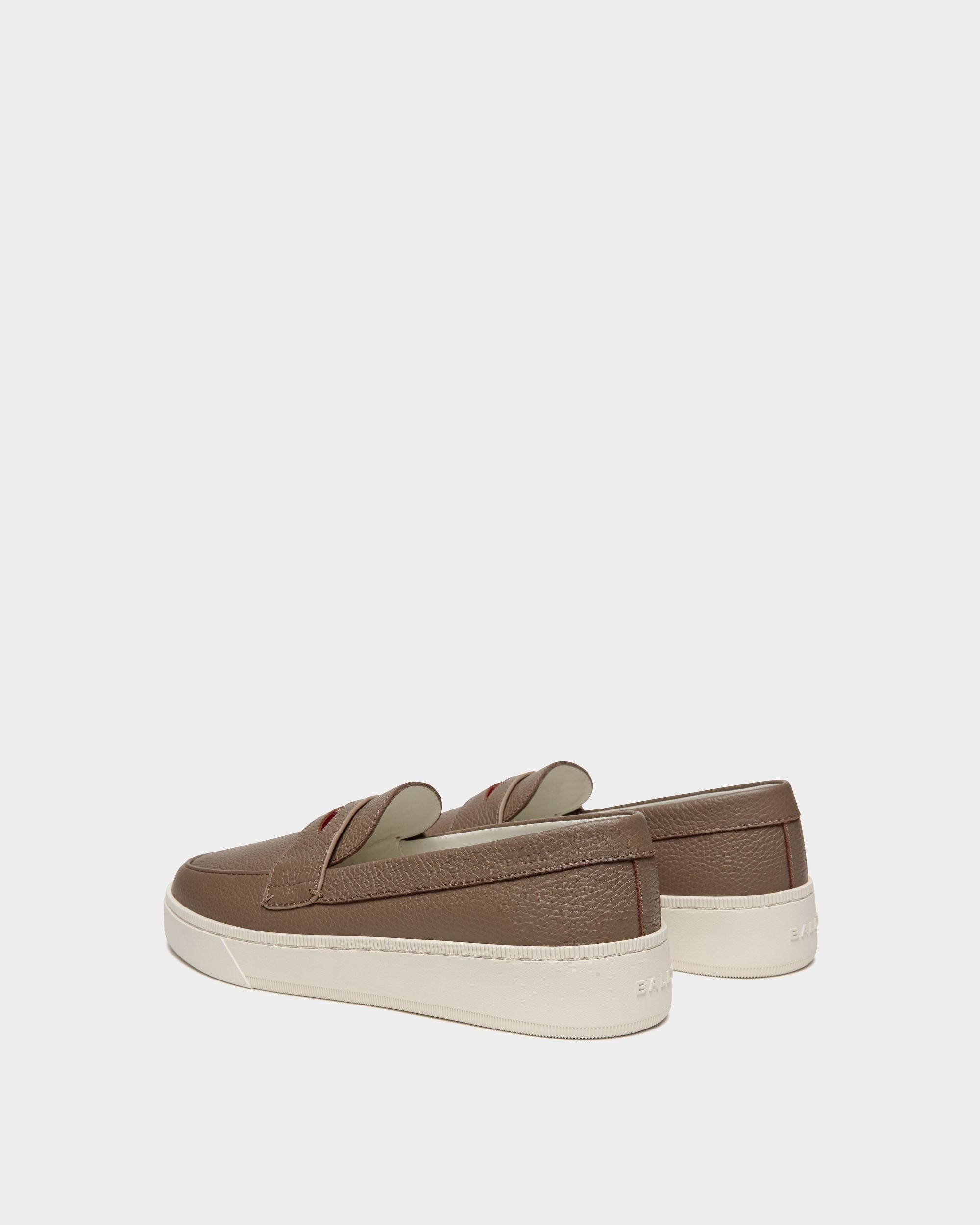 Inspired by slip-on loafers, this Raise sneaker is crafted from taupe grained leather, united with a thick rubber sole for a perfect blend of form and function. A Bally Ribbon peeks through the penny strap in an ode to Swiss heritage.