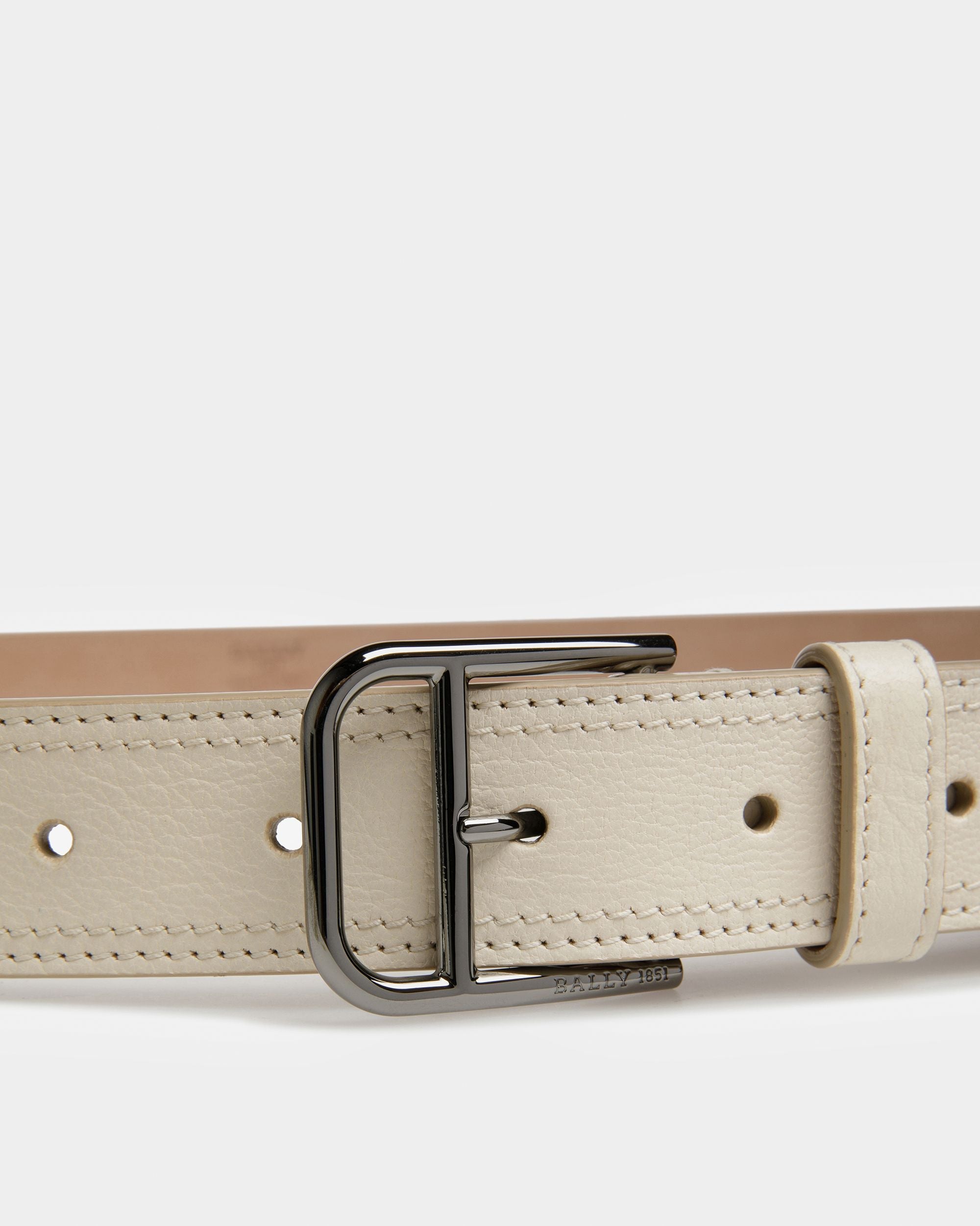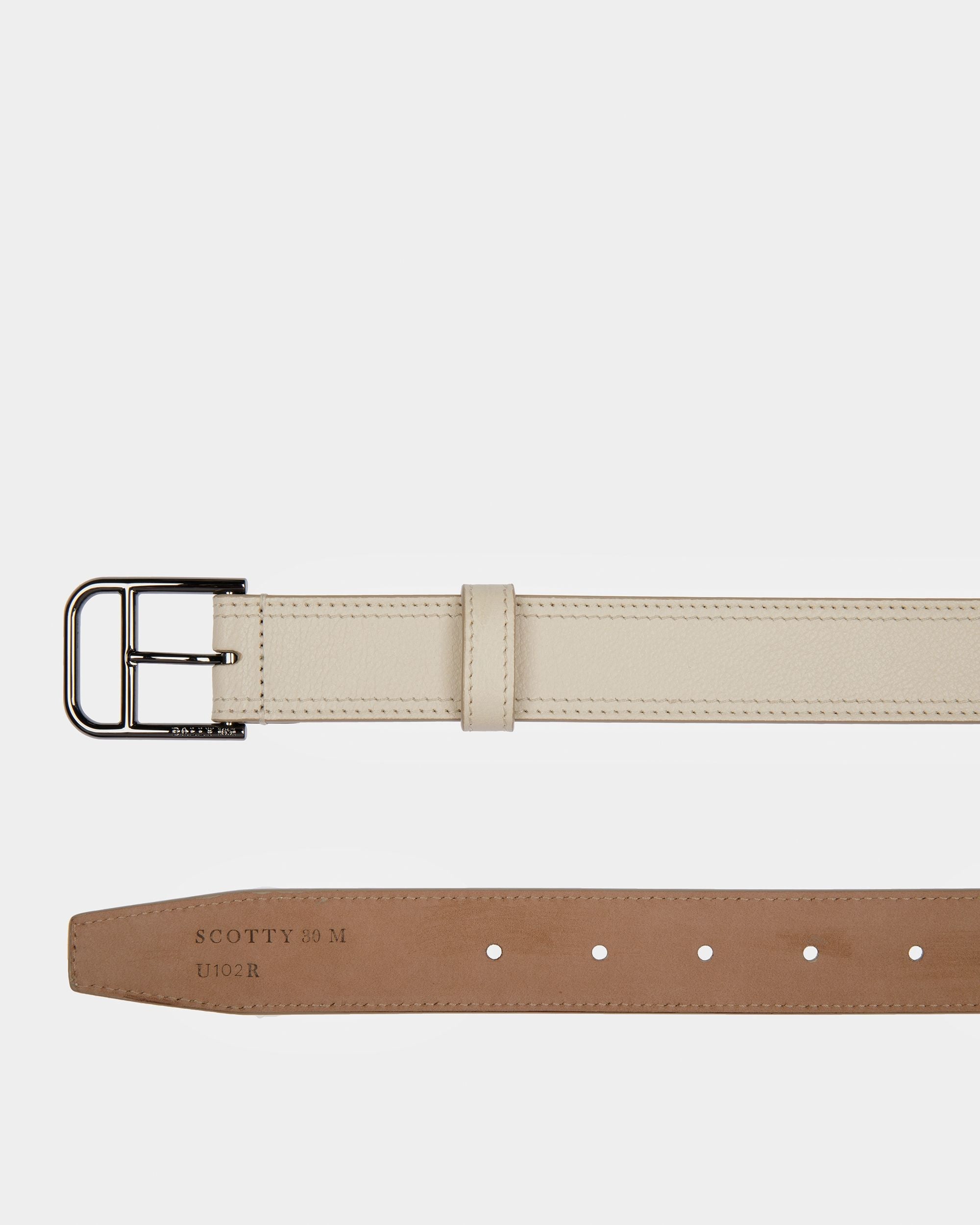 A true classic, the Scotty belt sees a matte metal buckle with soft nubuck goat leather in a bone-colored finish.