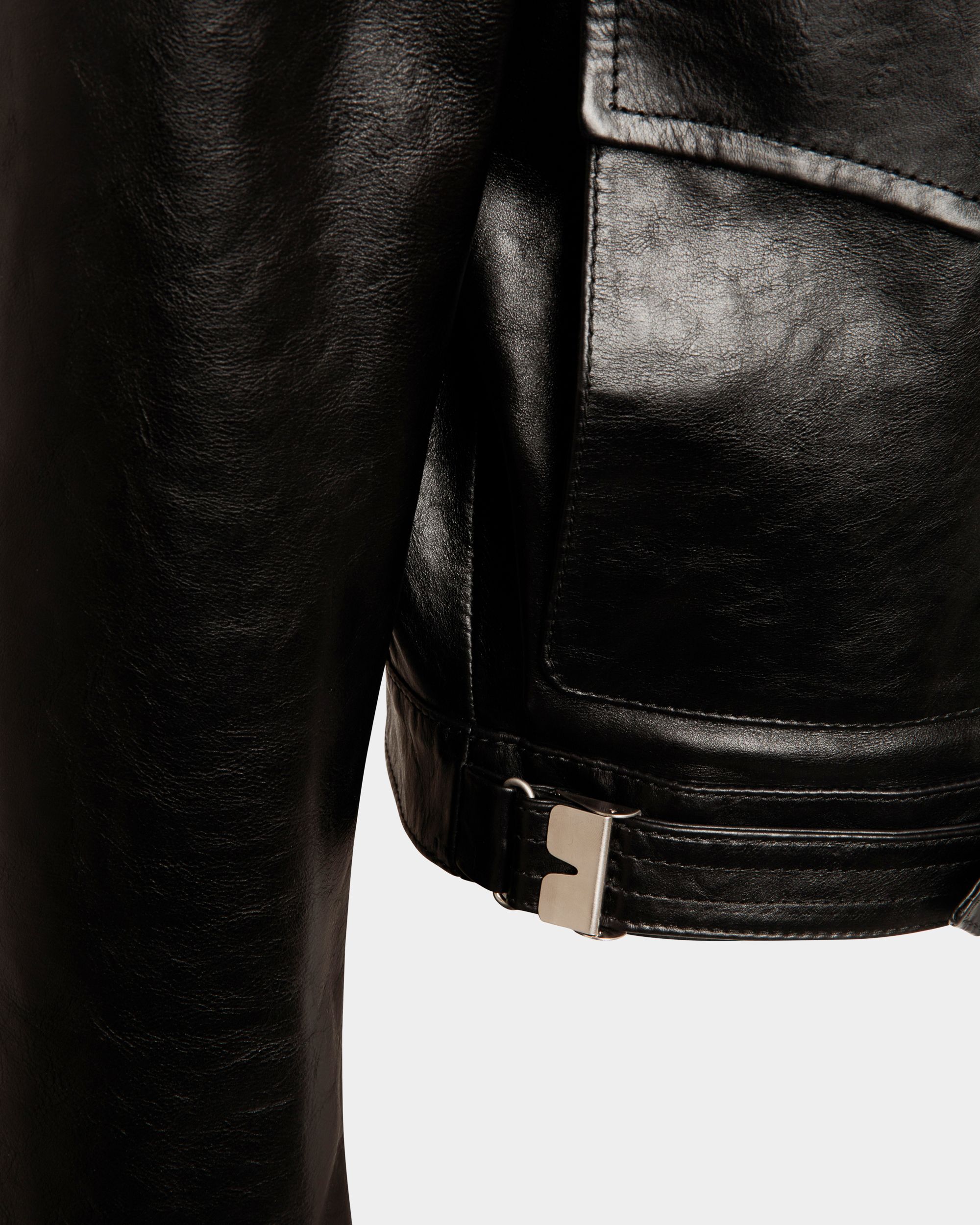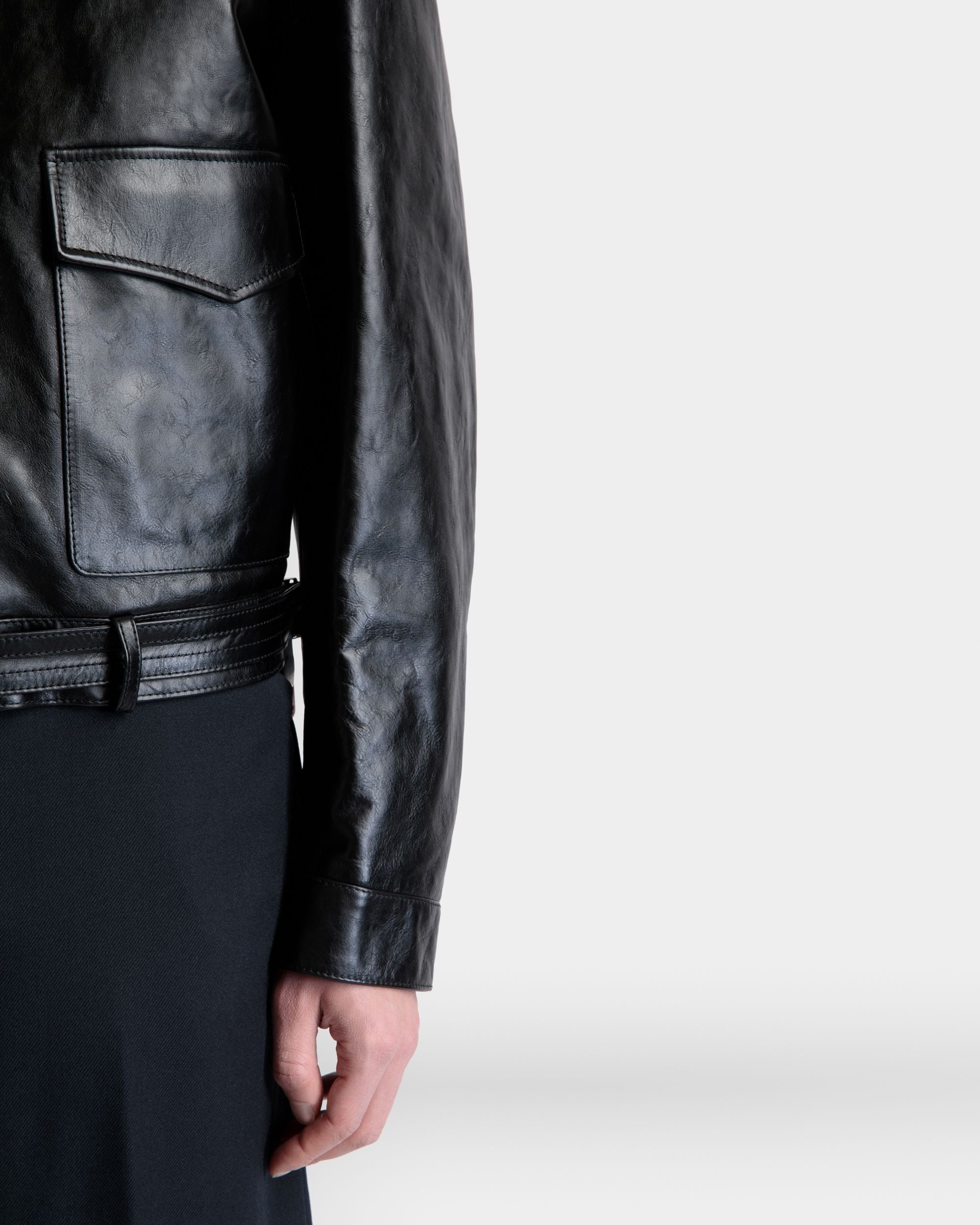In buttery soft Nappa calfskin, this zip-front leather jacket brings exacting tailoring to an eternally iconic piece. A belt with a square buckle in palladium-hue metal secures the waist, set below two large flap pockets.
