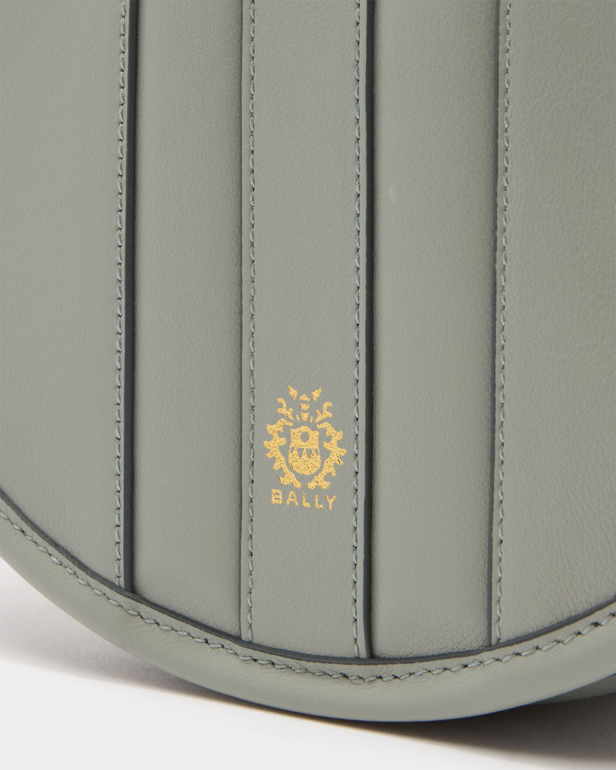 This Signature crossbody bag in Glacier grey calfskin has a modern half-circle silhouette enriched with a leather inlay Bally Ribbon and a gold-tone Crest to the front.