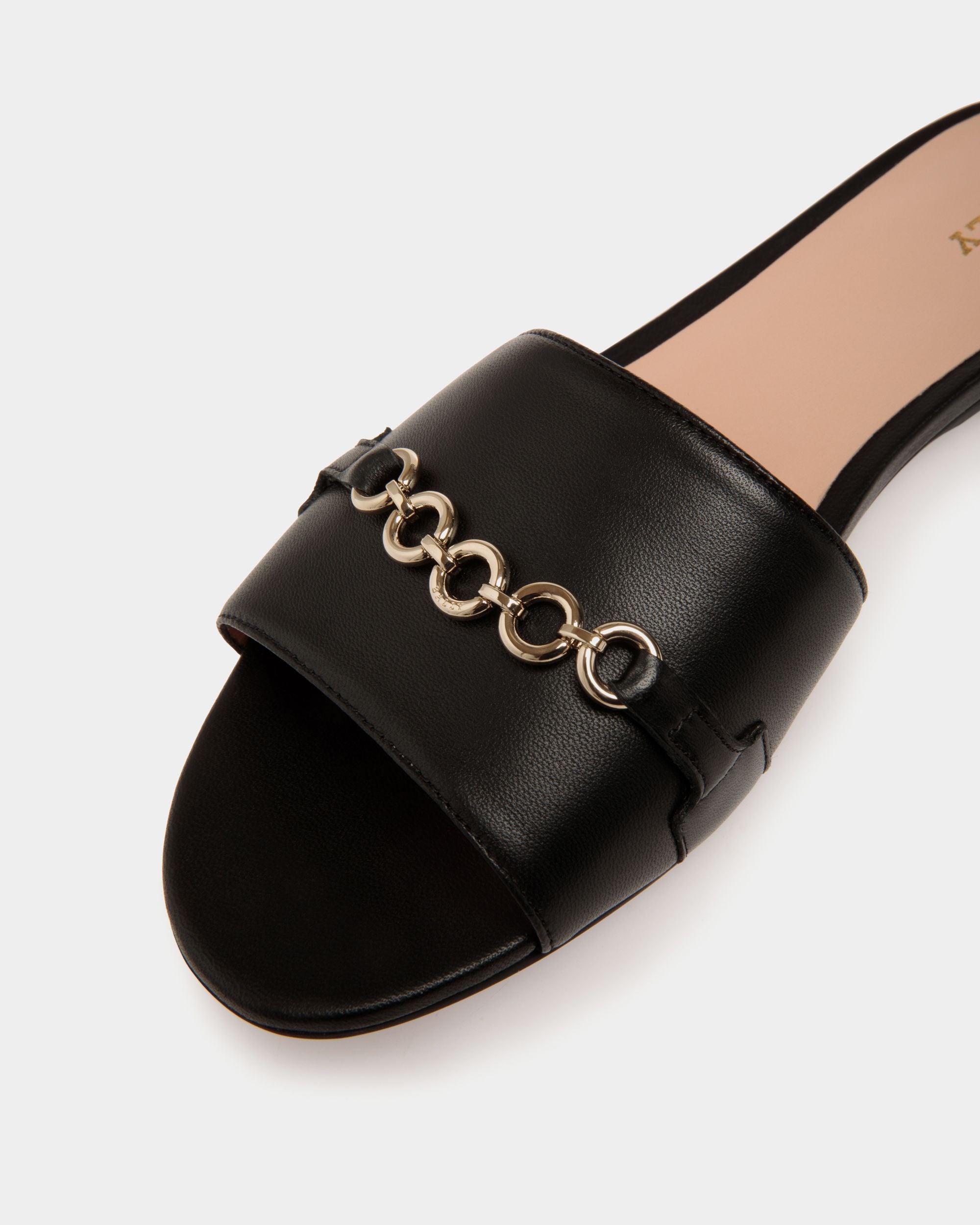 These slide sandals are made from supple leather. They are embellished with a metal chain detail on the front.