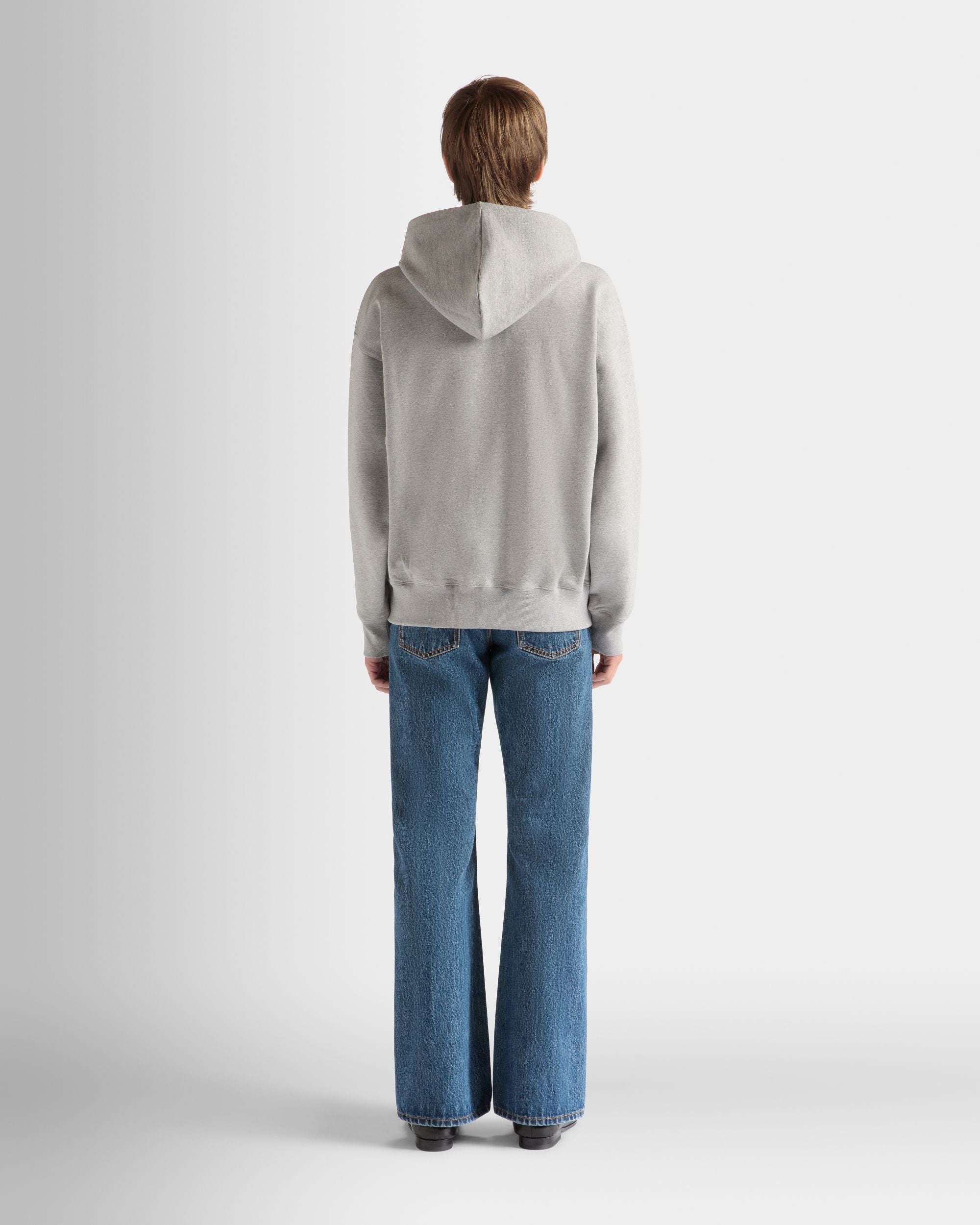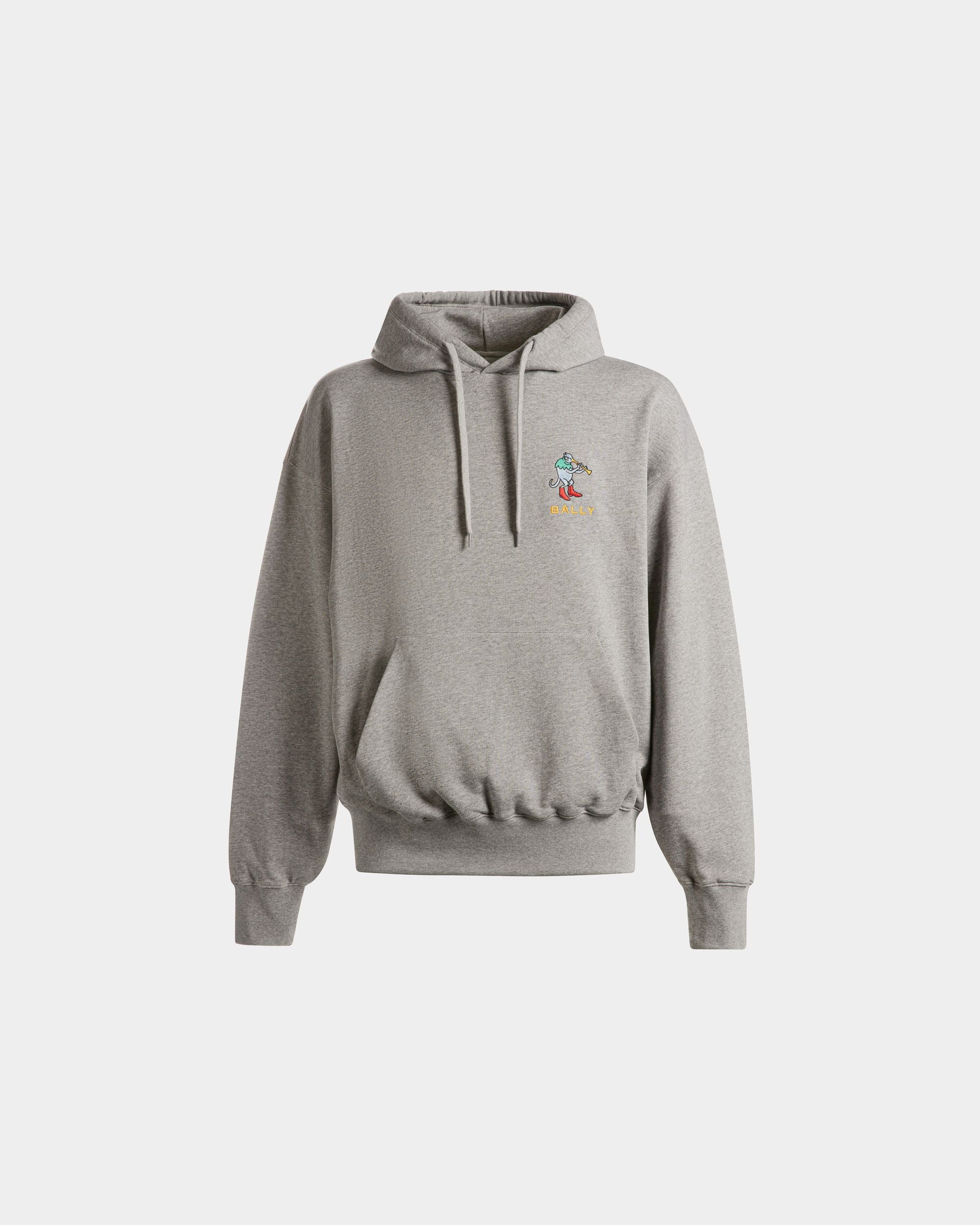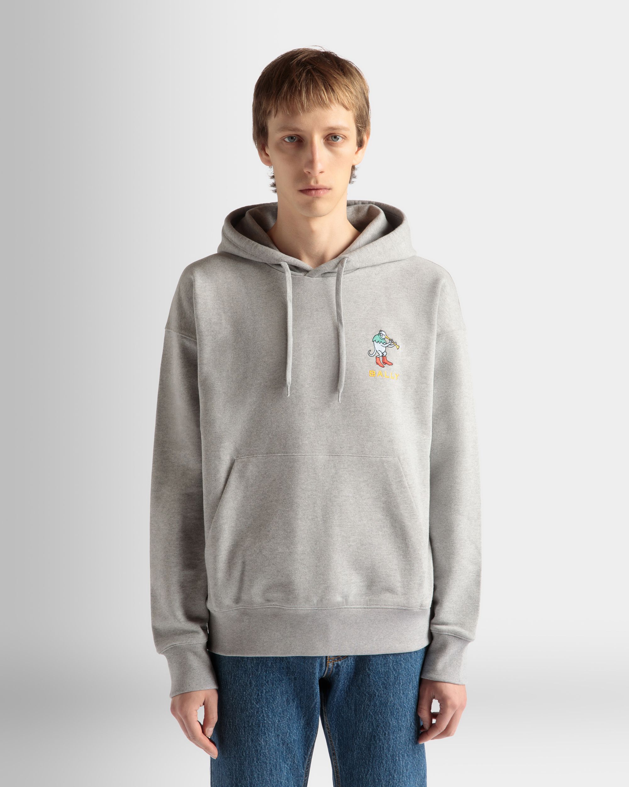 Soft and cozy grey mélange cotton hoodie with a front pouch pocket. Multicolor embroidery decorates the left chest, taking the shape of Naso Piffero, an imaginary resident of Monte Verita'. A drawstring adjusts the fit of the lined hood.