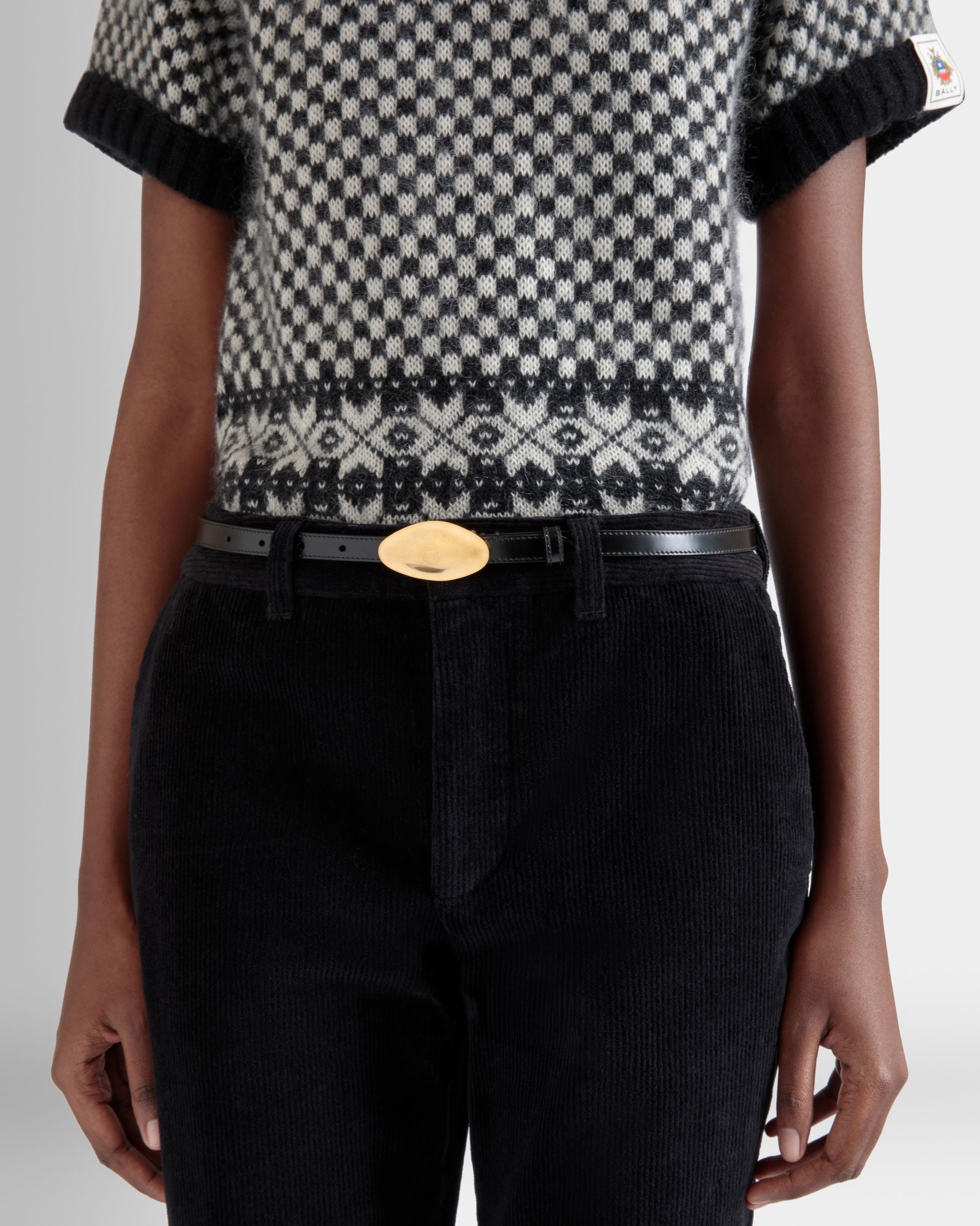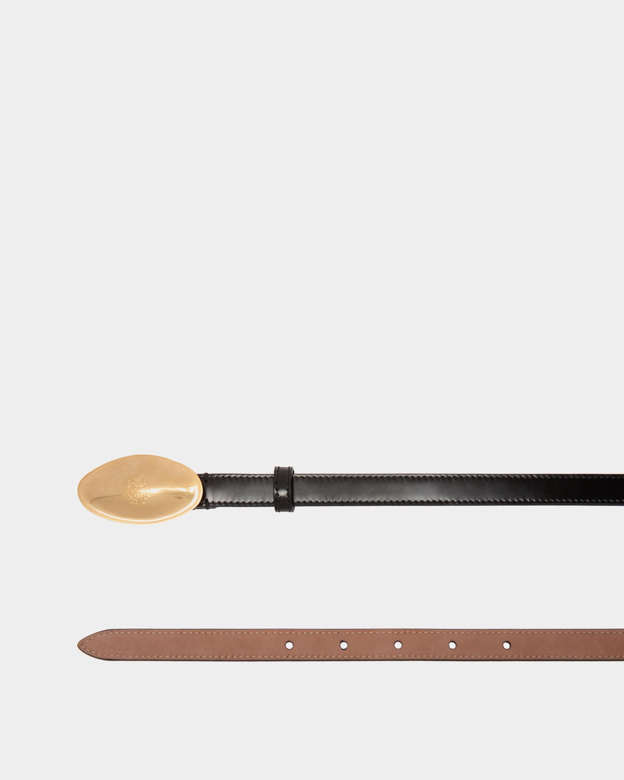 An oval buckle in gold-finish metal with an engraved Bally Crest sits to the front of this Swissness 15mm belt in black brushed leather.