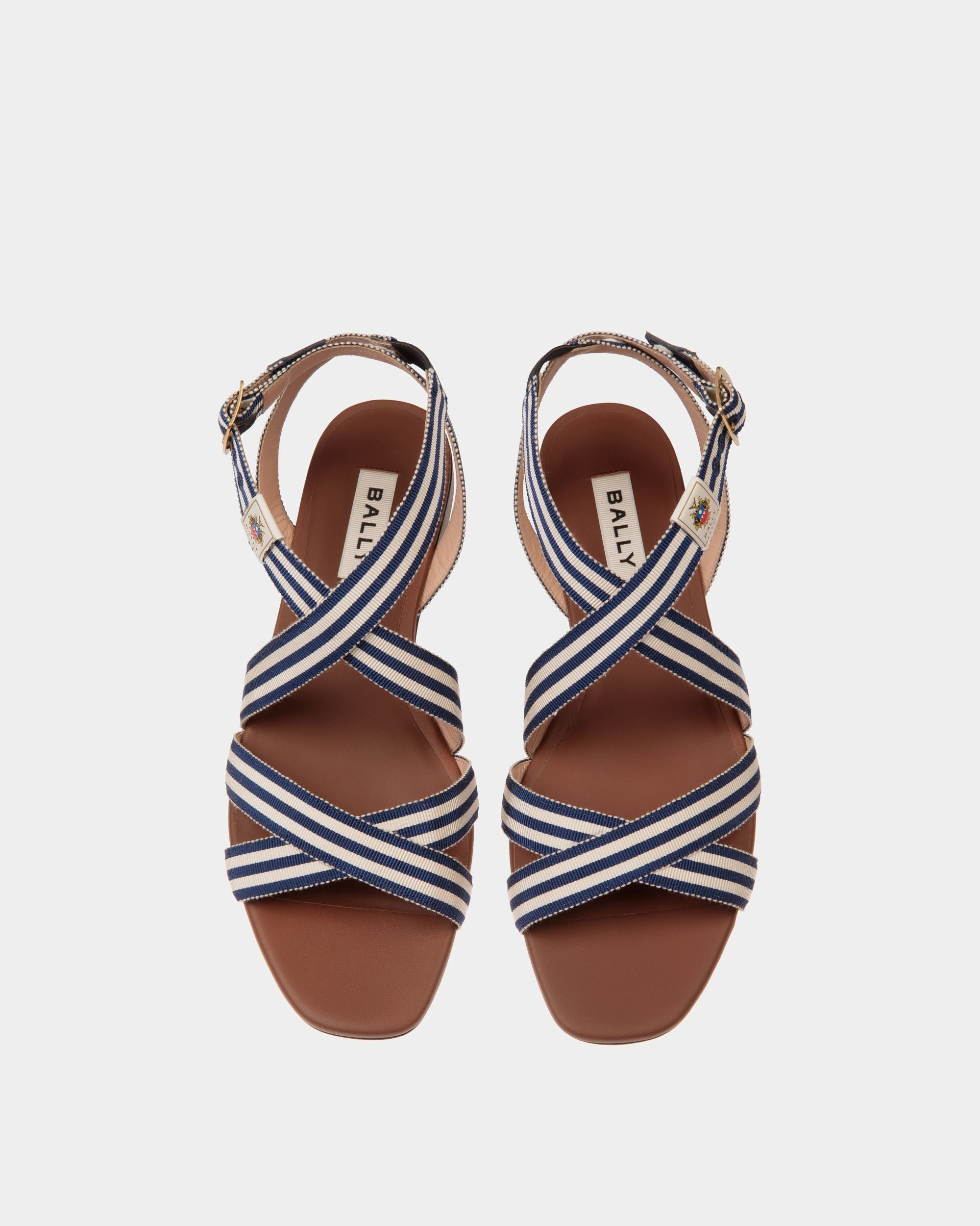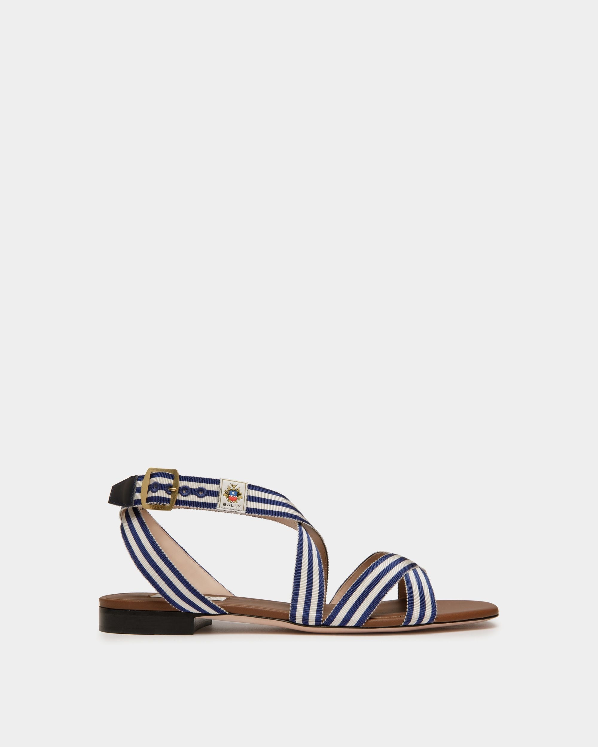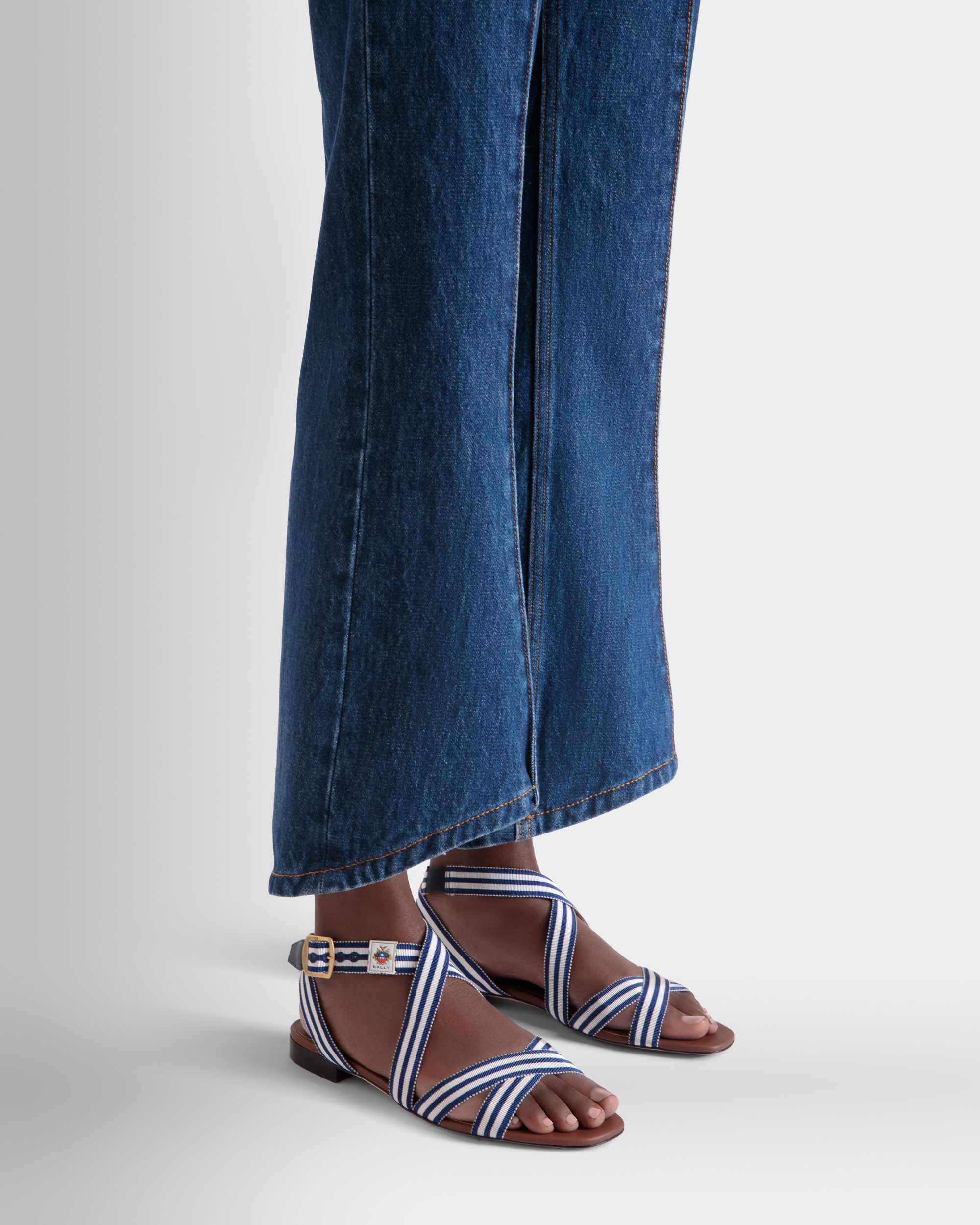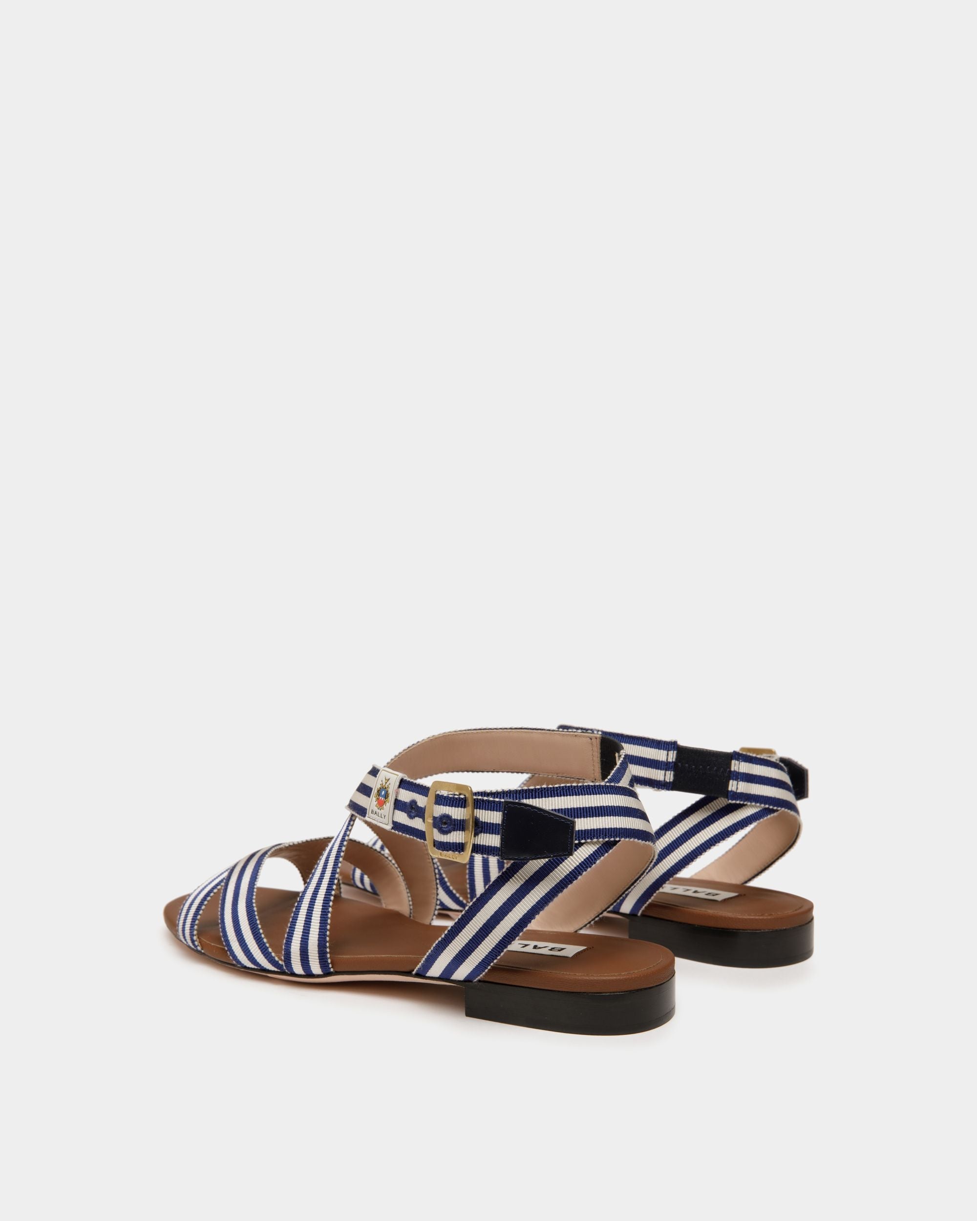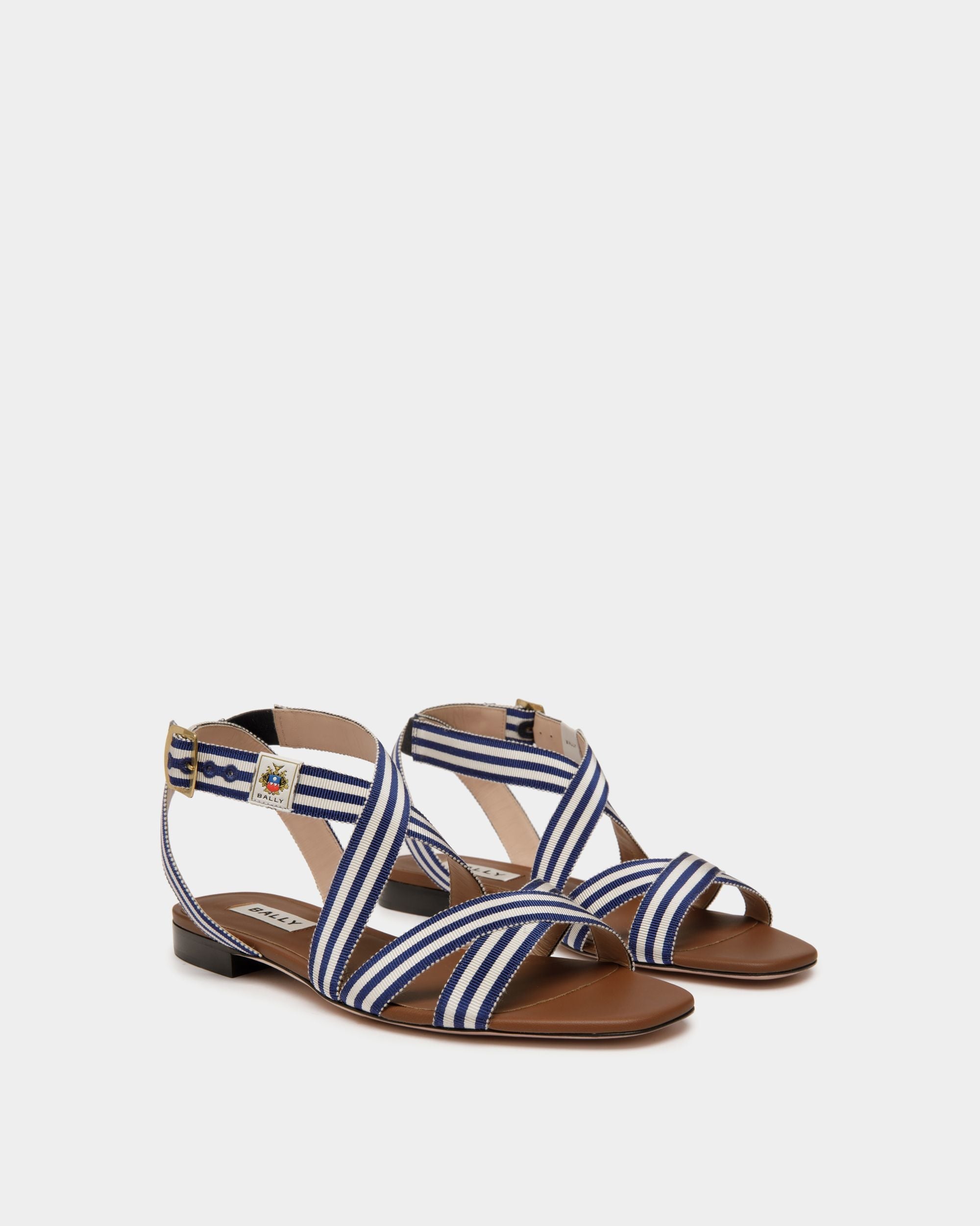 Criss-crossed straps in navy blue and white fabric define the upper of this Sylt flat sandal. A Bally Crest label in leather finishes the ankle strap, positioned to the side of the gold-tone metal buckle.
