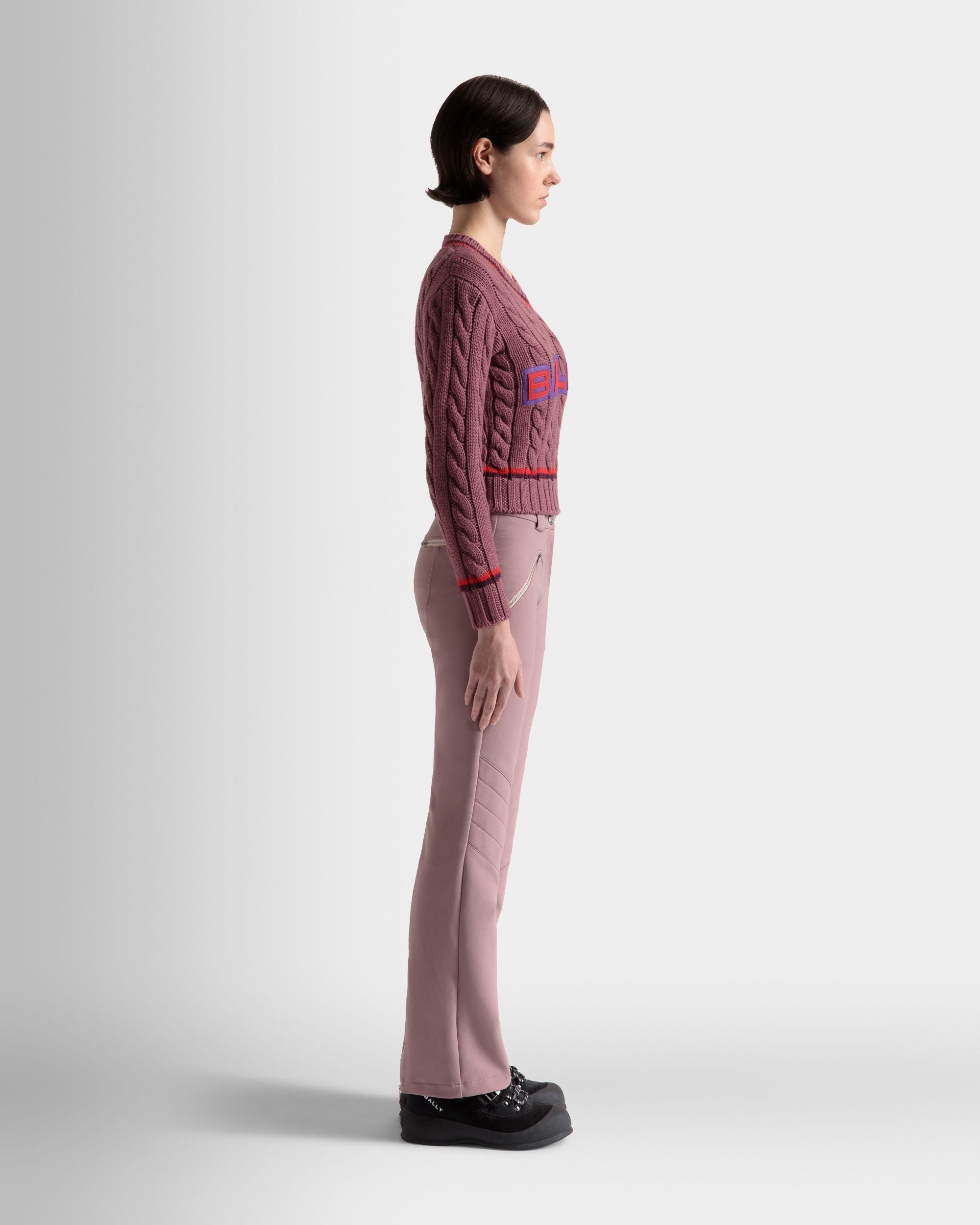 Made from premium wool knit into a cable pattern, this light mauve V-neck sweater exudes elegance and sophistication. Its lightweight construction ensures comfort, while the timeless silhouette adds a touch of refinement to any outfit.