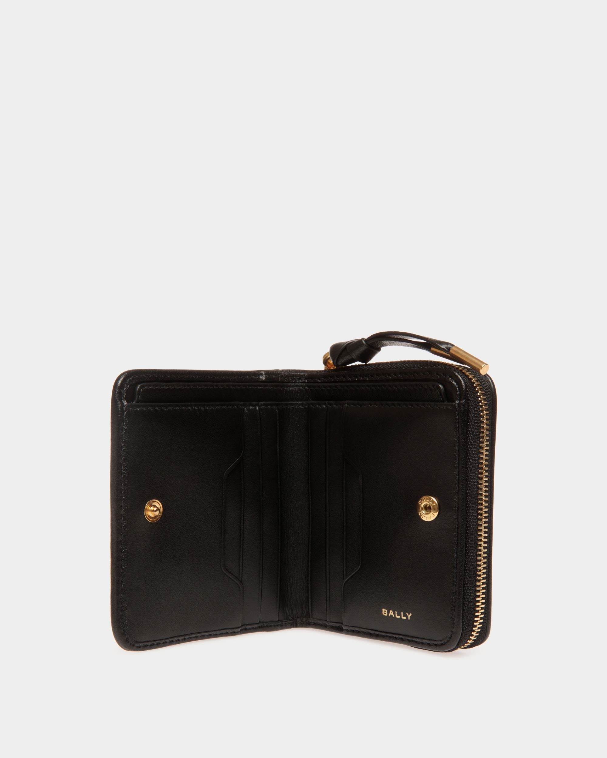 This Bally Essential wallet in black leather opens to reveal multiple card slots and two cash slots. The zipped coin pocket features accordion construction for maximum capacity. A gold-tone metal Bally Crest finishes the front.