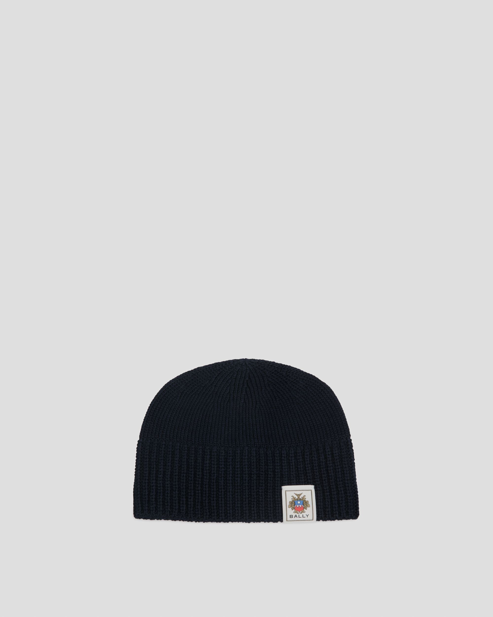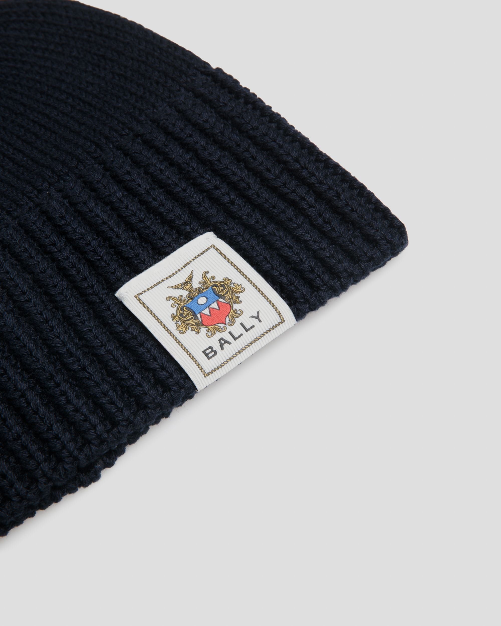 This essential navy blue cotton beanie has ribbing and a Bally Crest label along the lower edge.