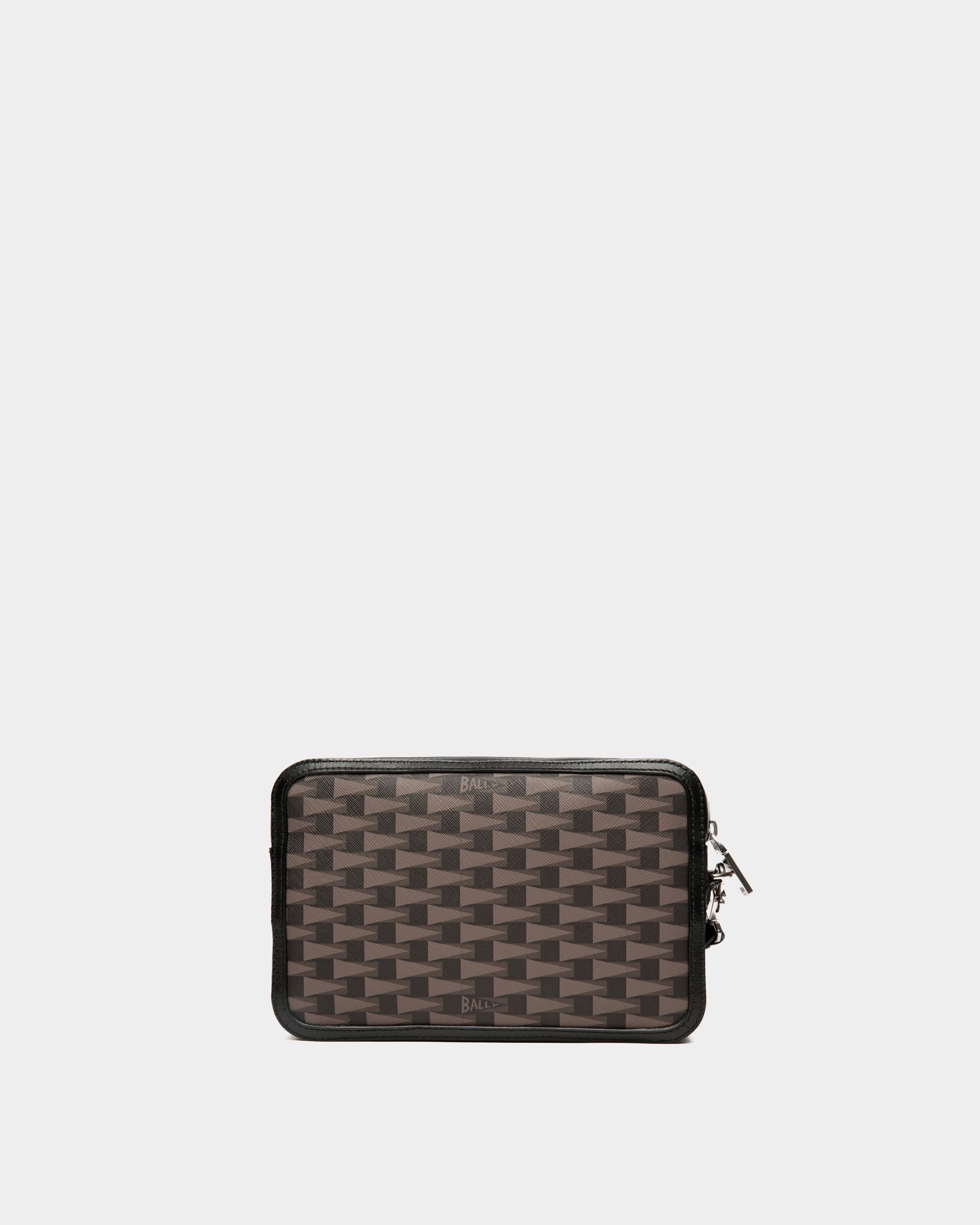 This pouch is distinguished by an all-over Pennant print, a modern reinterpretation of archival motifs. It's closed by a metal zipper, while a leather wristlet amplifies its portability options.