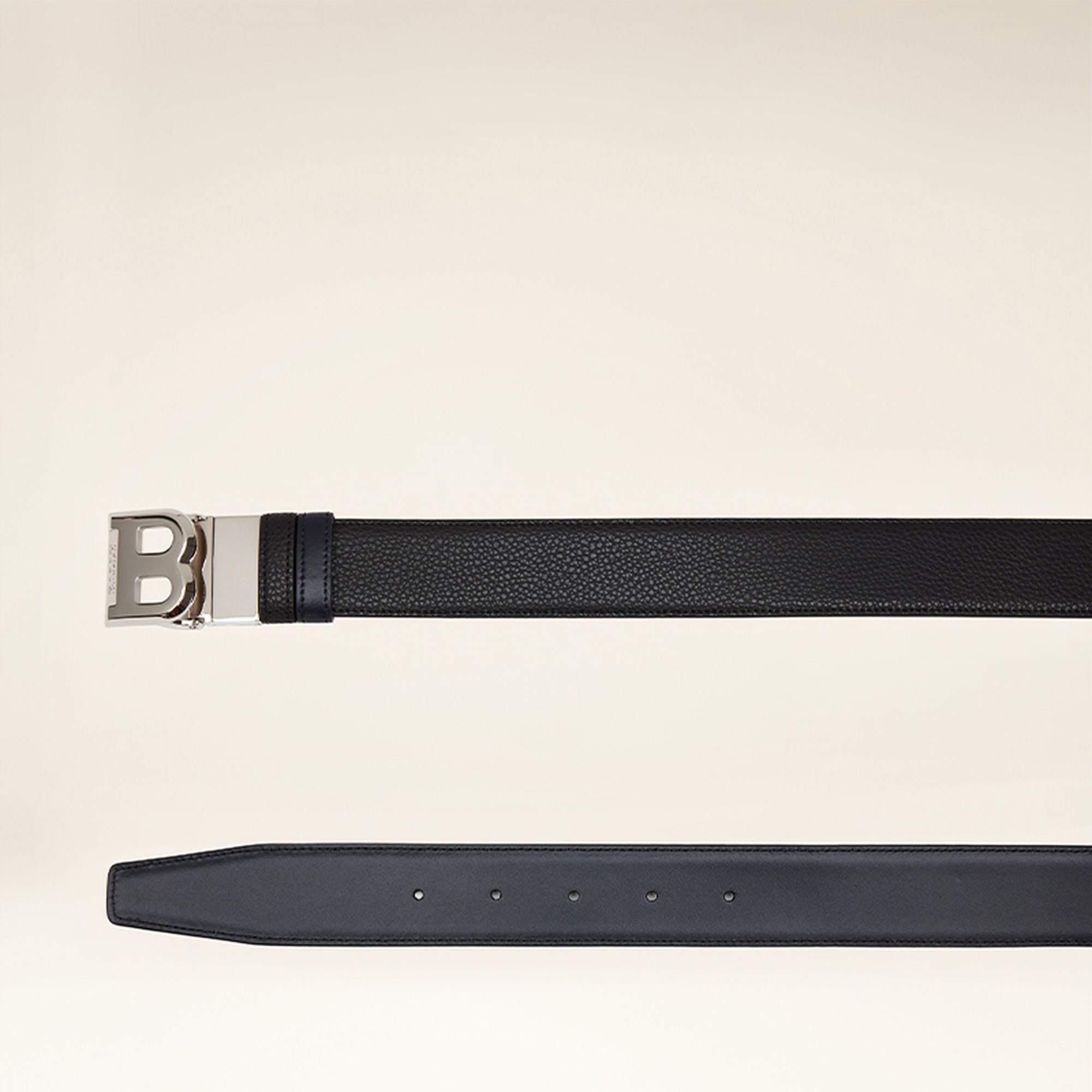 Este cinturón está confeccionado con piel granulada resistente. Se abrocha con una hebilla Bally B de metal pulido.