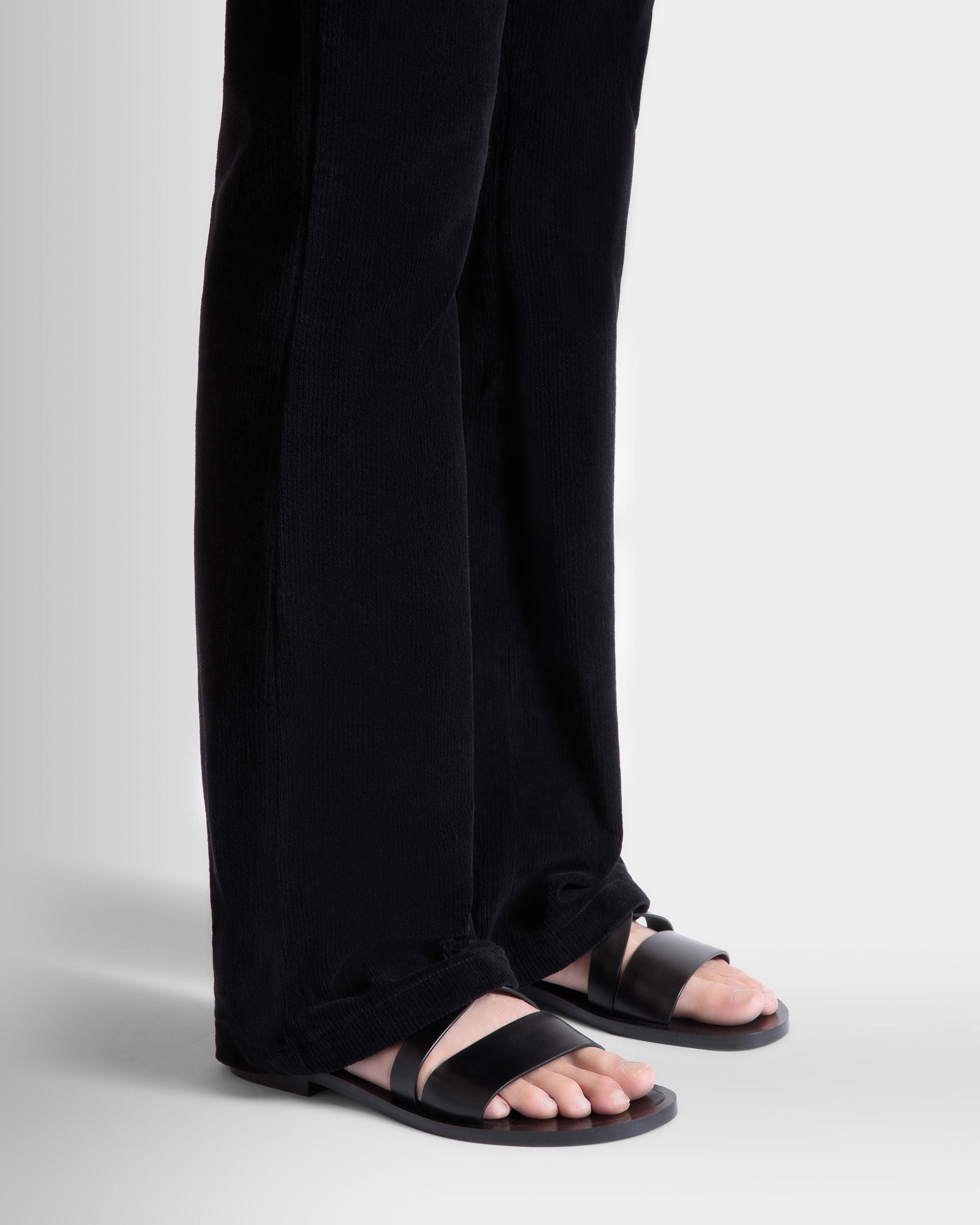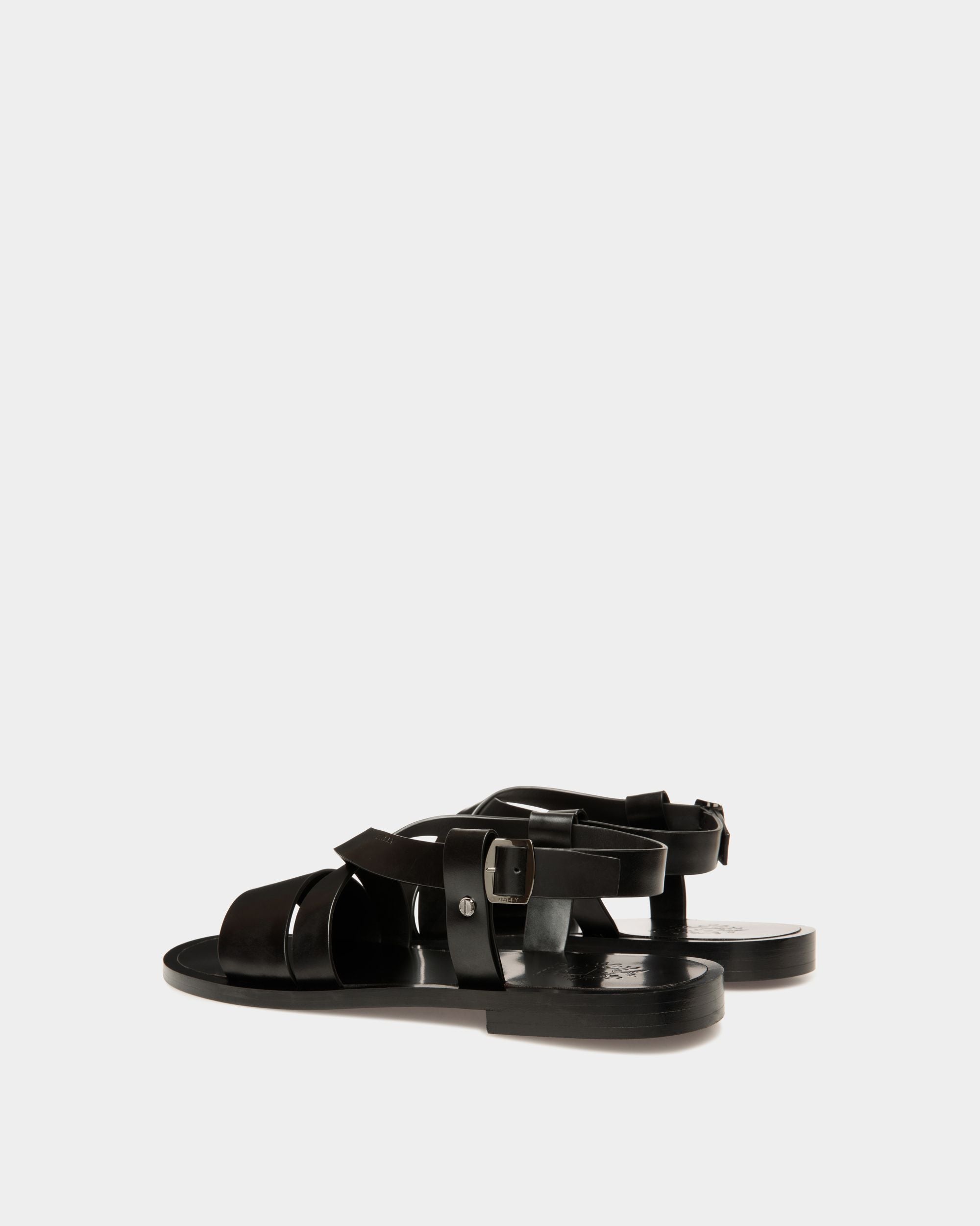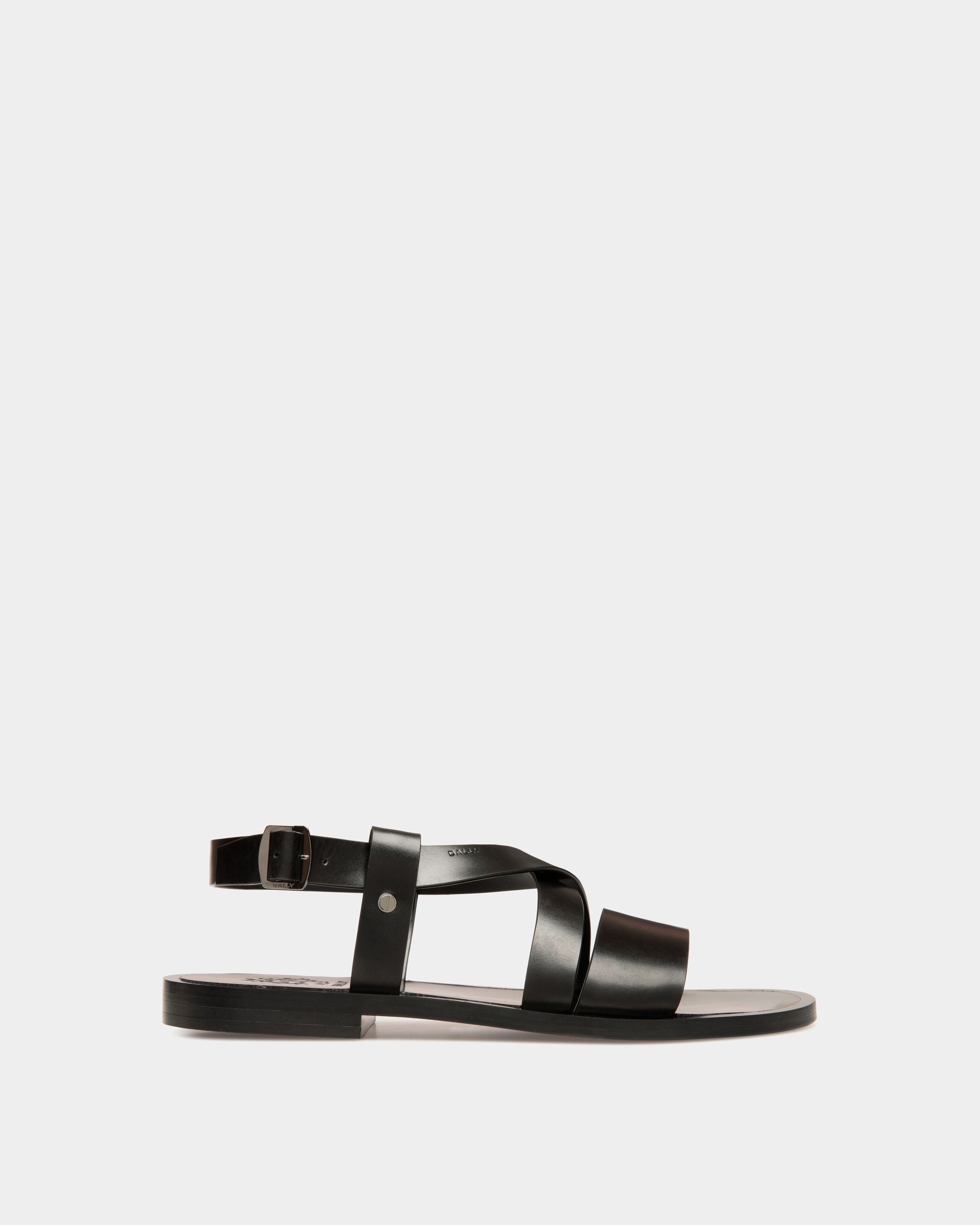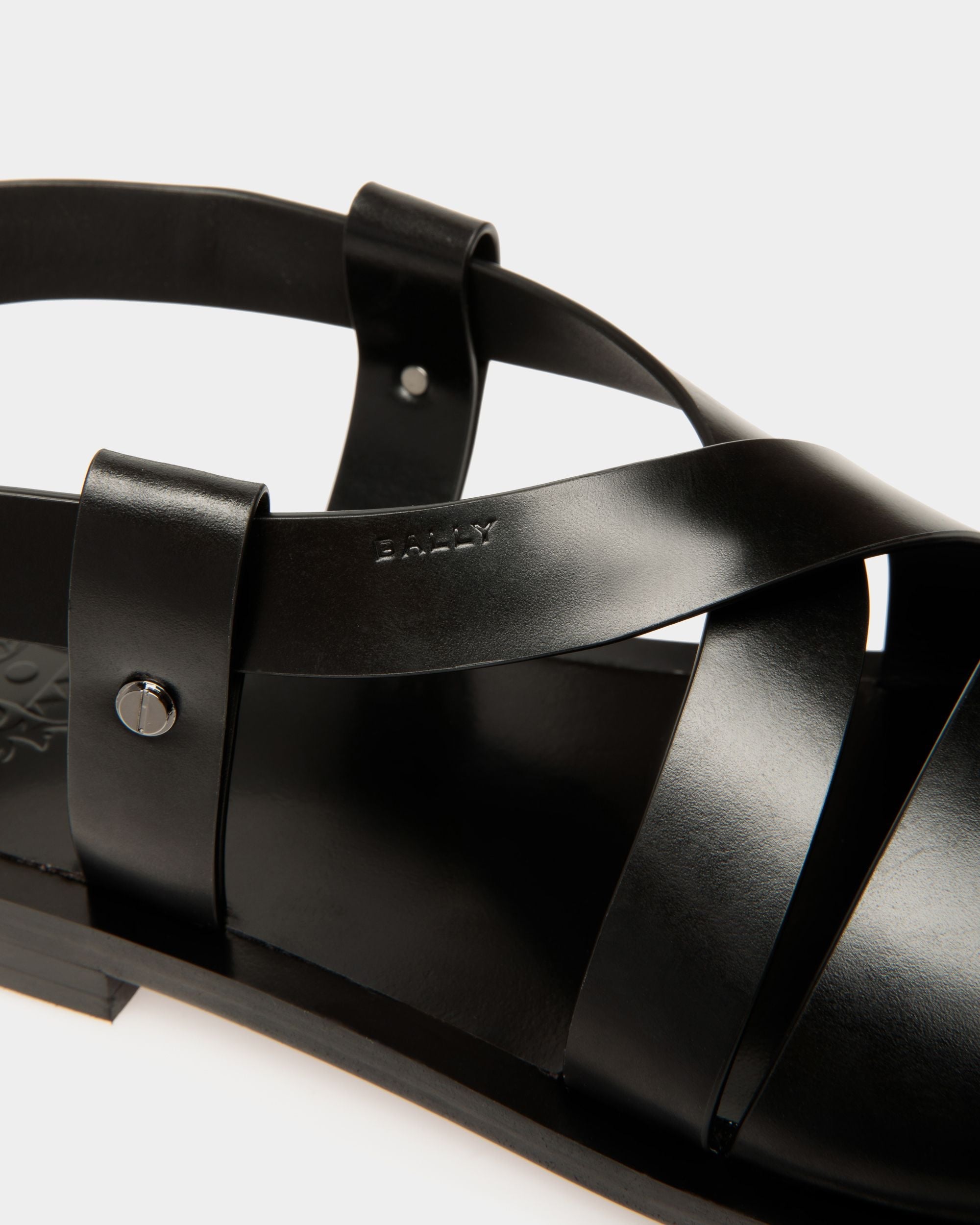 The black leather straps of the Salis sandal are embellished by metal hardware, including screw studs at the sides. Raw cut and without seams, the edges are waxed for a clean aesthetic.