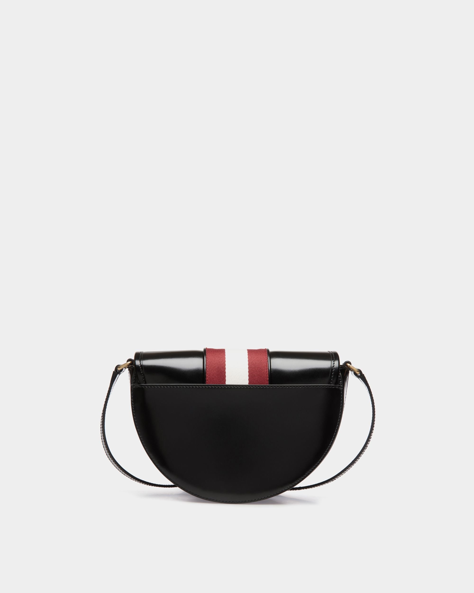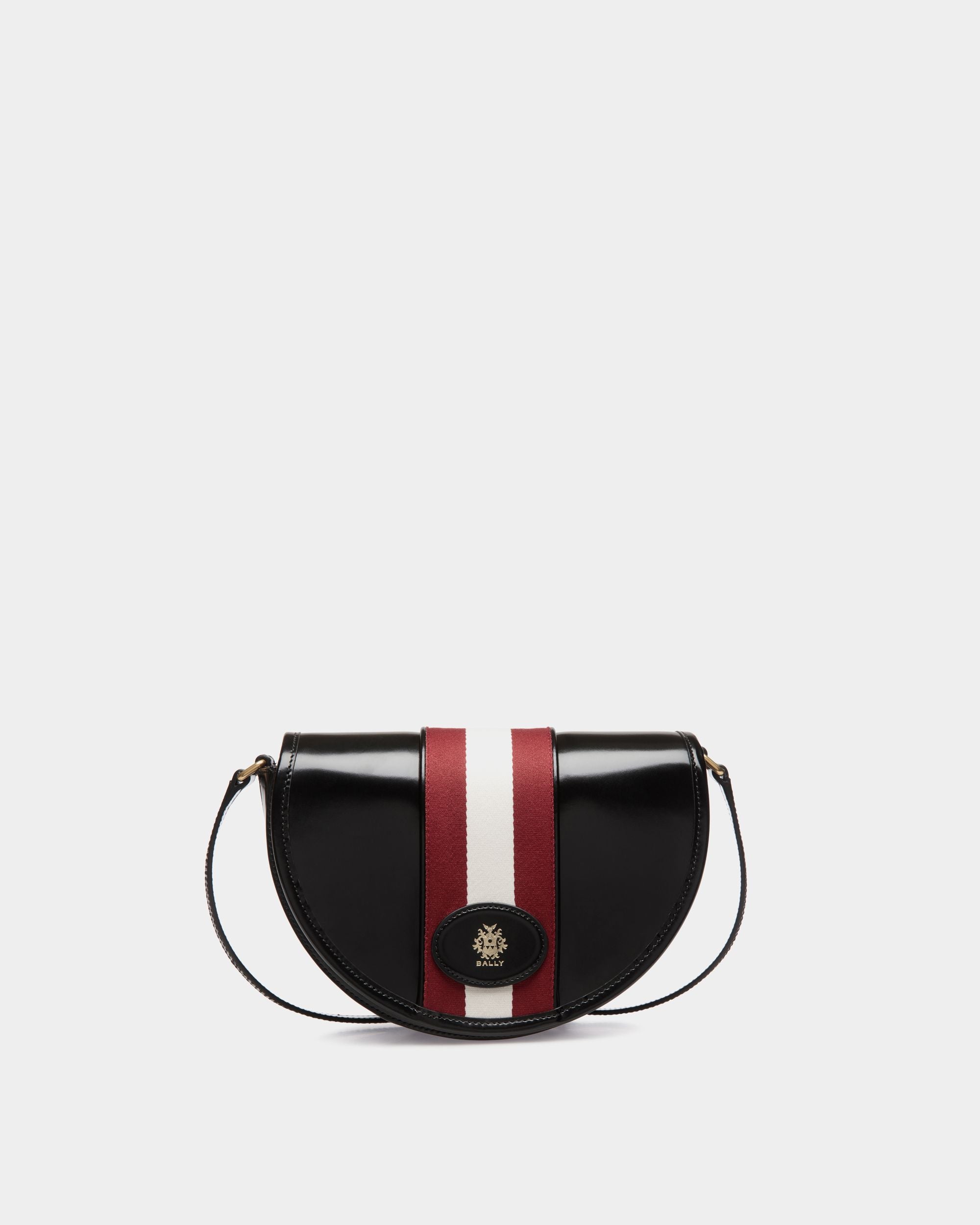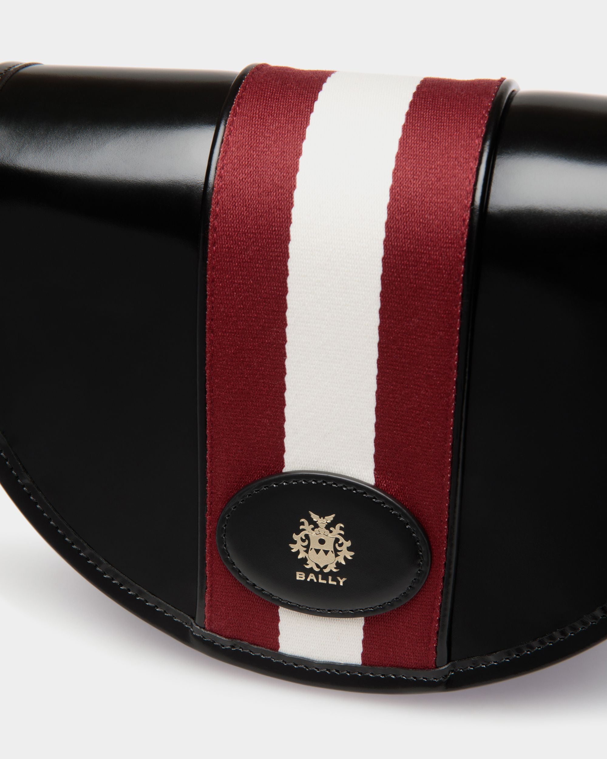 Esta bandolera reinterpreta la elegancia y el desenfado de la línea Signature a través de una silueta semicircular de piel de becerro negra cepillada. Un emblemático detalle Bally Ribbon de tela roja y blanca en el centro de la solapa aporta el legado de Bally a este modelo compacto.