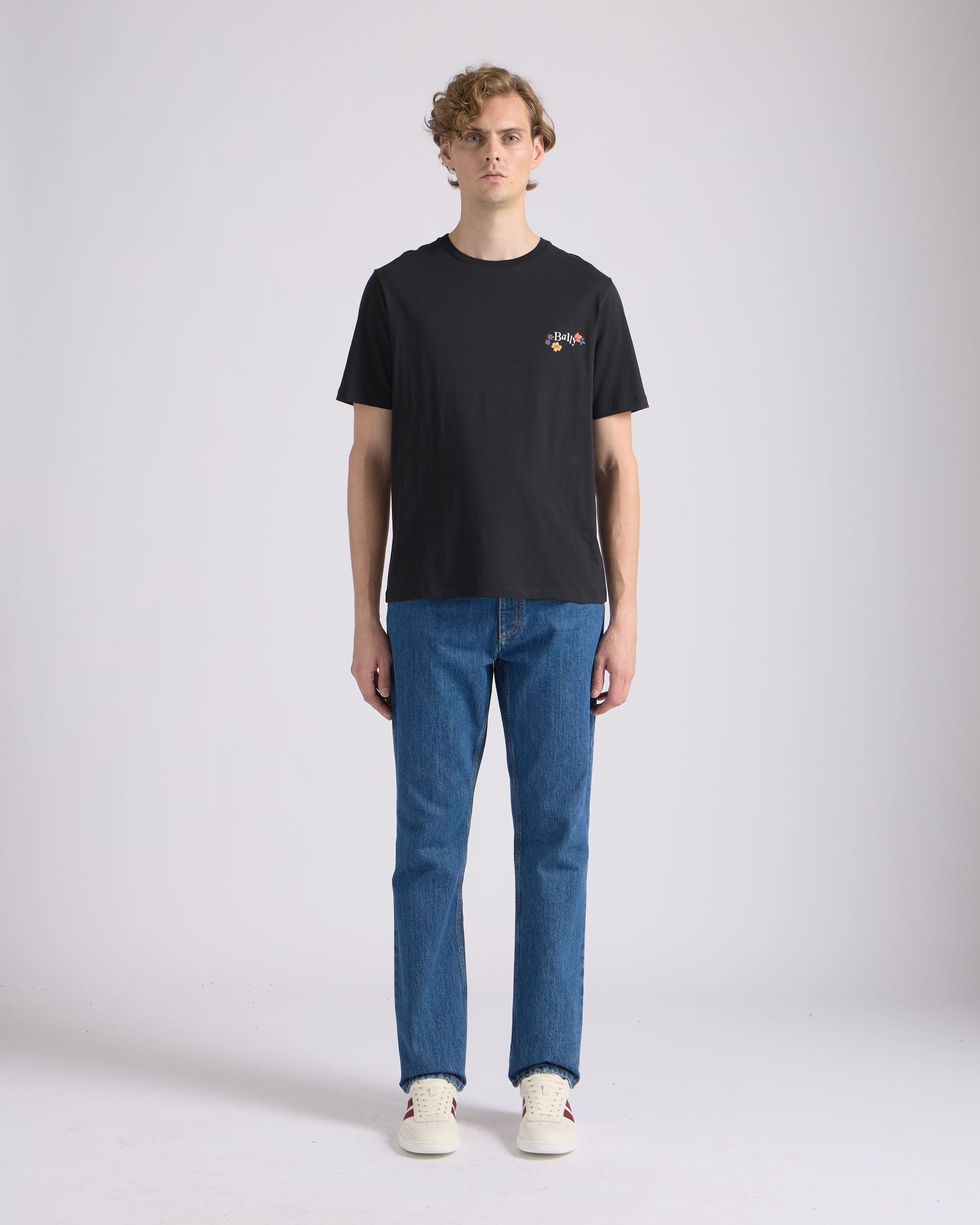 Esta camiseta de algodón negro está decorada con el logo de Bally y flores de colores en el lado izquierdo del pecho. Su silueta clásica presenta cuello redondo y manga corta.