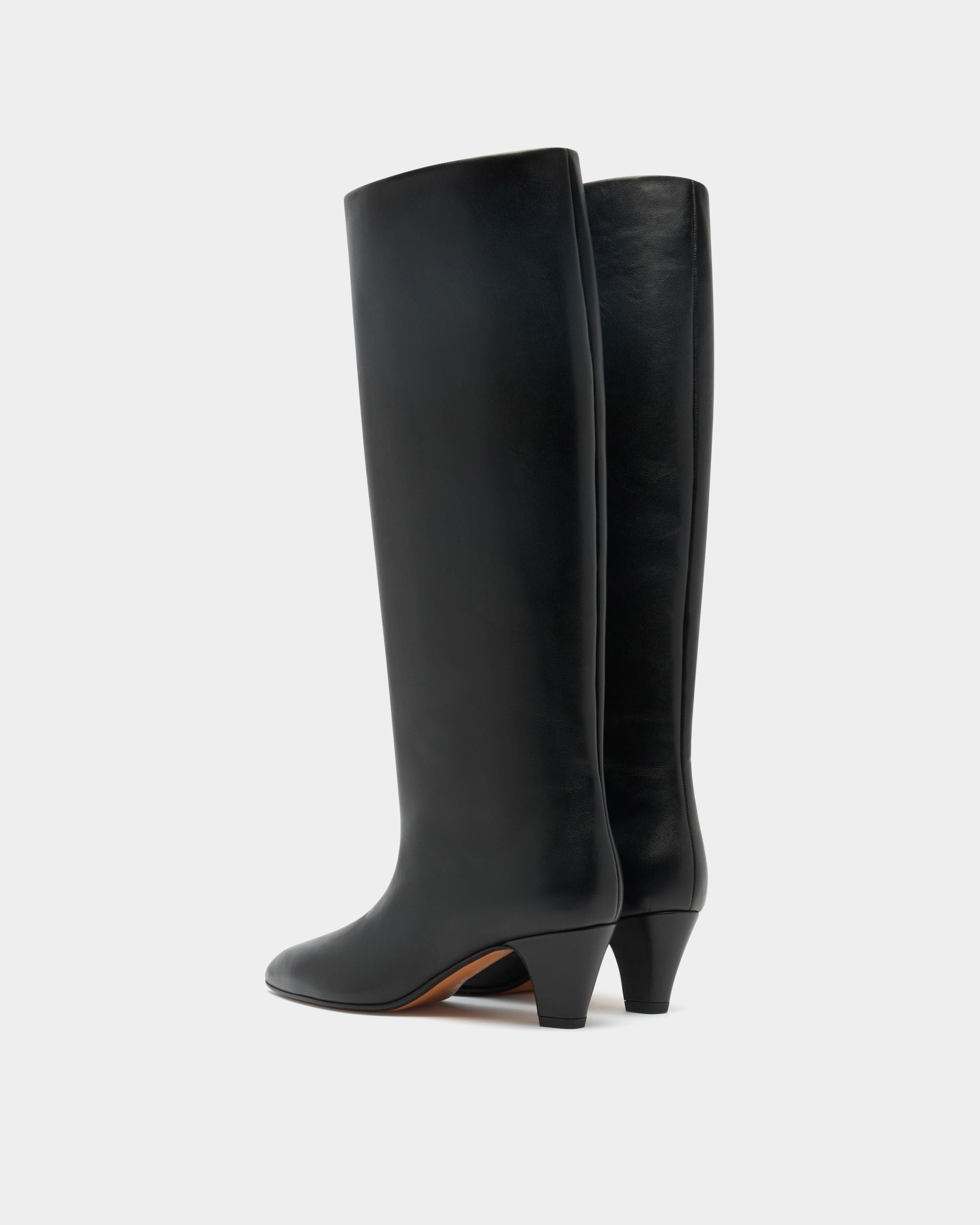 La bota alta Alva presenta una silueta de inspiración vintage confeccionada con piel de becerro lisa negra y rematada con un pequeño logo básico de Bally.