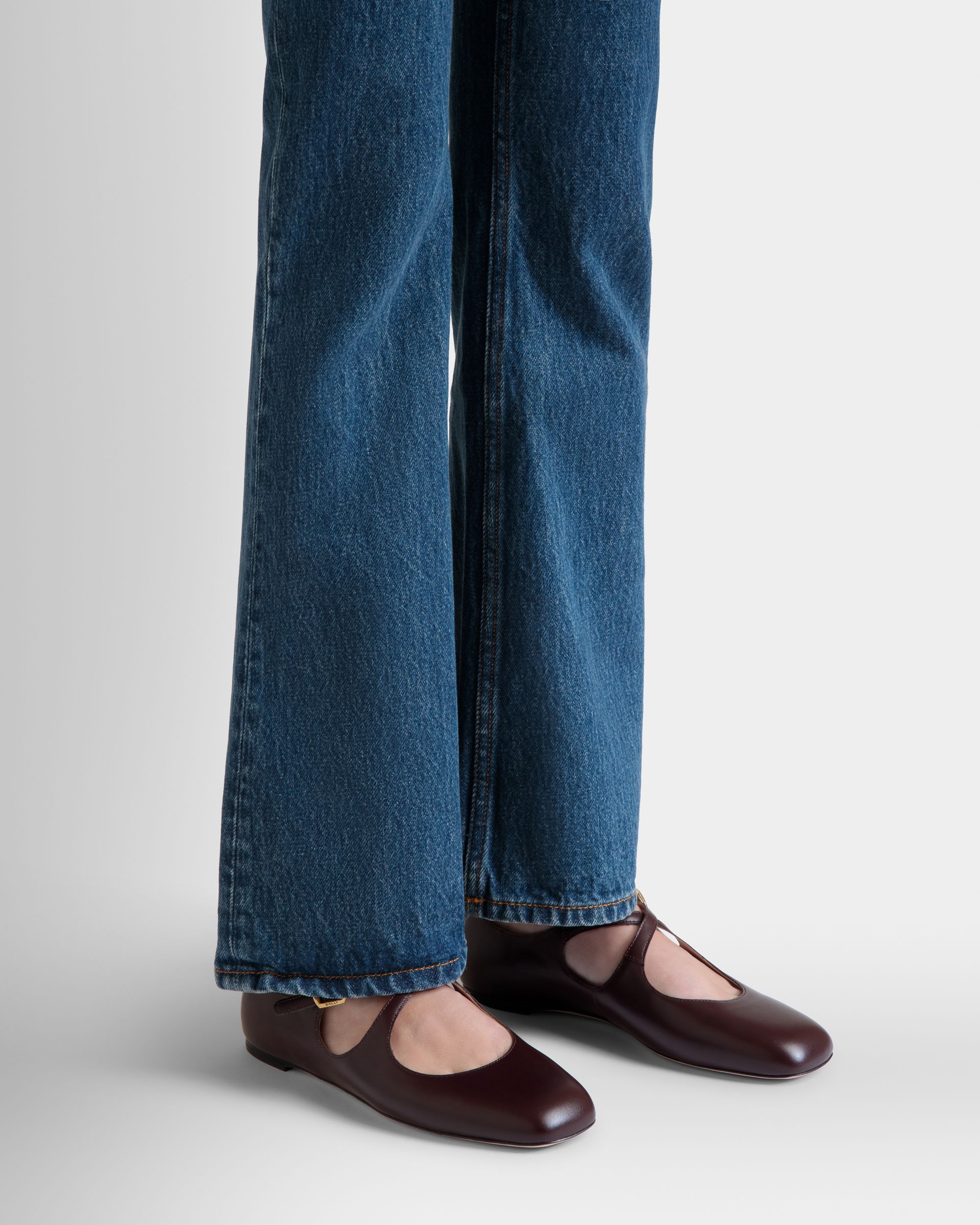 This Ballyrina flat is meticulously crafted in deep burgundy calfskin with a semi-matte finish. Two slender straps cross at the top, secured by a metal buckle from the Bally archives. A square toe provides an on-point finish.