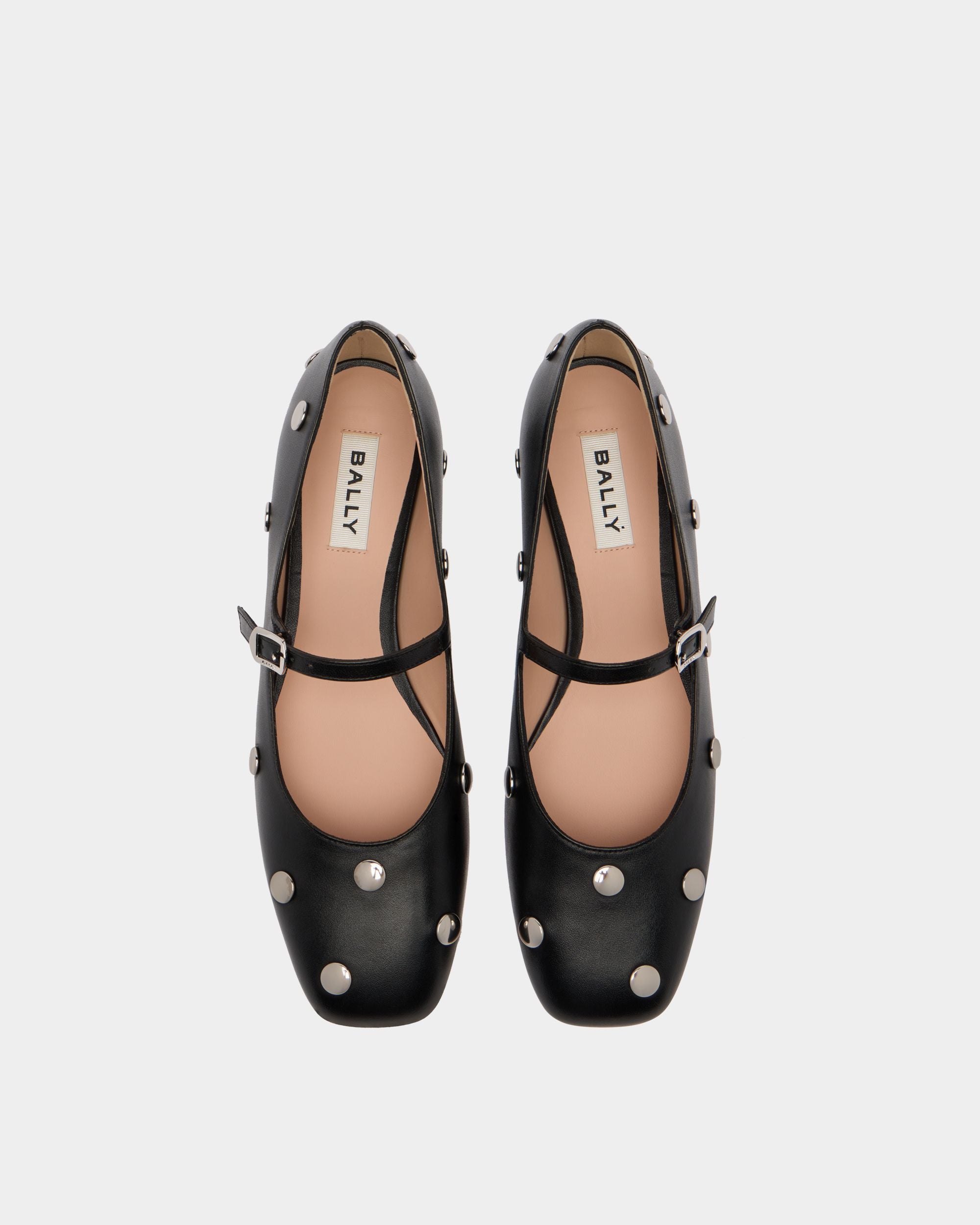 Cette chaussure à talon plat Ballyrina est méticuleusement réalisée en cuir de veau noir avec des clous plats ronds qui créent des Polka Dots amusants et audacieux à la fois. Une bride fine se croise sur le dessus, fixée par une boucle en métal inspirée d’un modèle issu des archives de Bally.