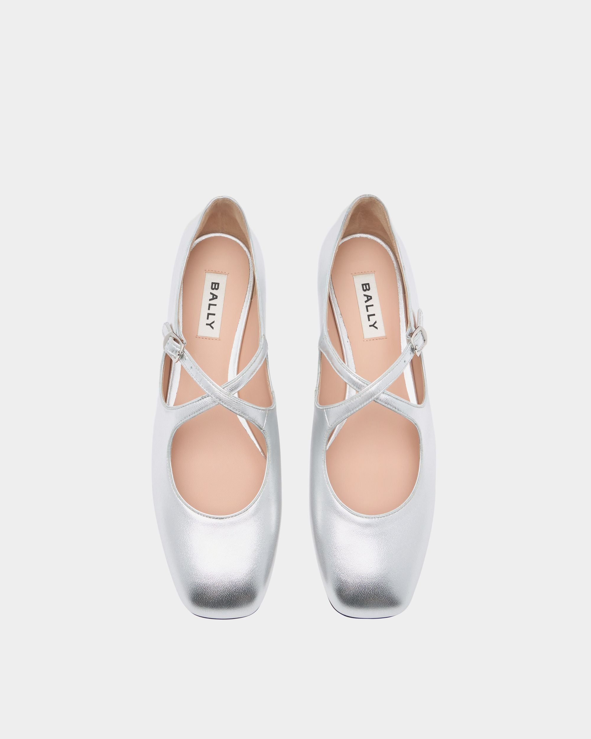 Cette chaussure à talon plat Ballyrina est méticuleusement fabriquée en peau de mouton douce avec une finition couleur argent. Deux brides fines se croisent sur le dessus, fixées par une boucle en métal inspirée d’un détail issu des archives de Bally. Le bout carré assure une finition impeccable.