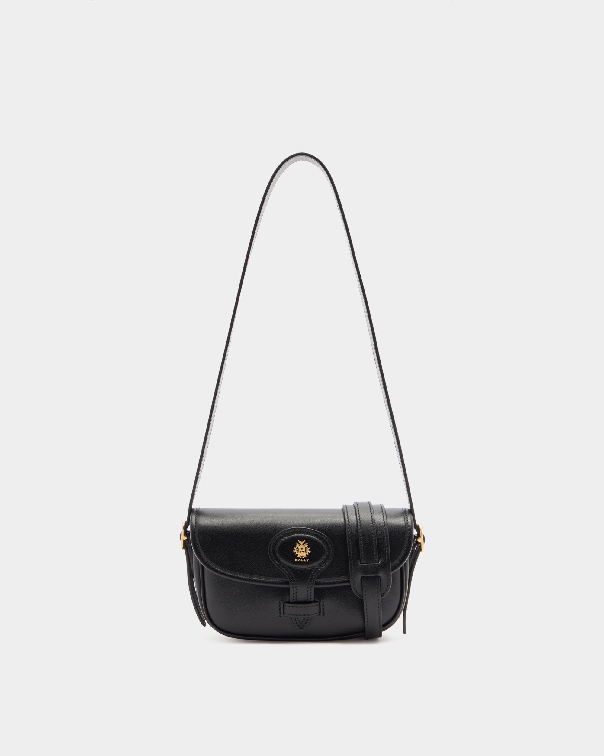 Ce minisac Beckett en cuir noir arbore une silhouette compacte rehaussée d'un écusson Bally Crest couleur or appliqué par placage sur la fermeture à rabat. Le choix entre deux bretelles offre un port à bandoulière et à l'épaule.