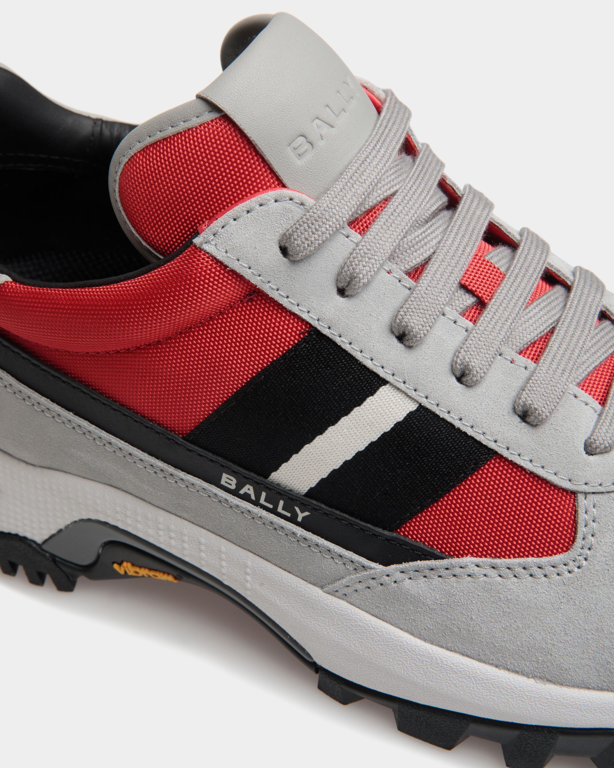 This lace-up Faster sneaker combines red suede and nylon, enriched by a red and white Bally Ribbon at the side. The Vibram running sole in rubber provides advanced grip on any terrain.