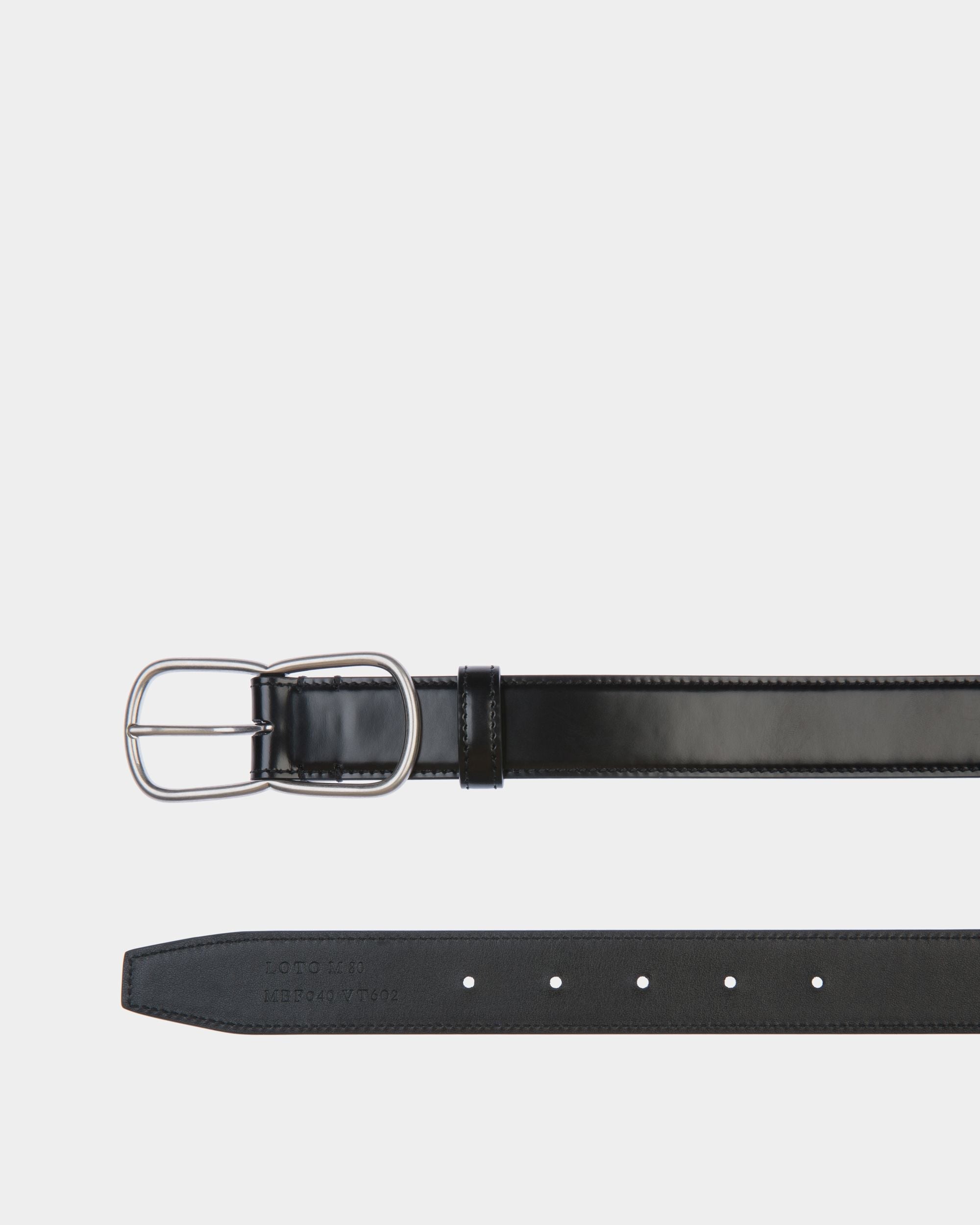 The Loto 30mm belt in black brushed calfskin features a slender figure-eight buckle in palladium-hue metal to the front. On-tone stitching runs along the edges.