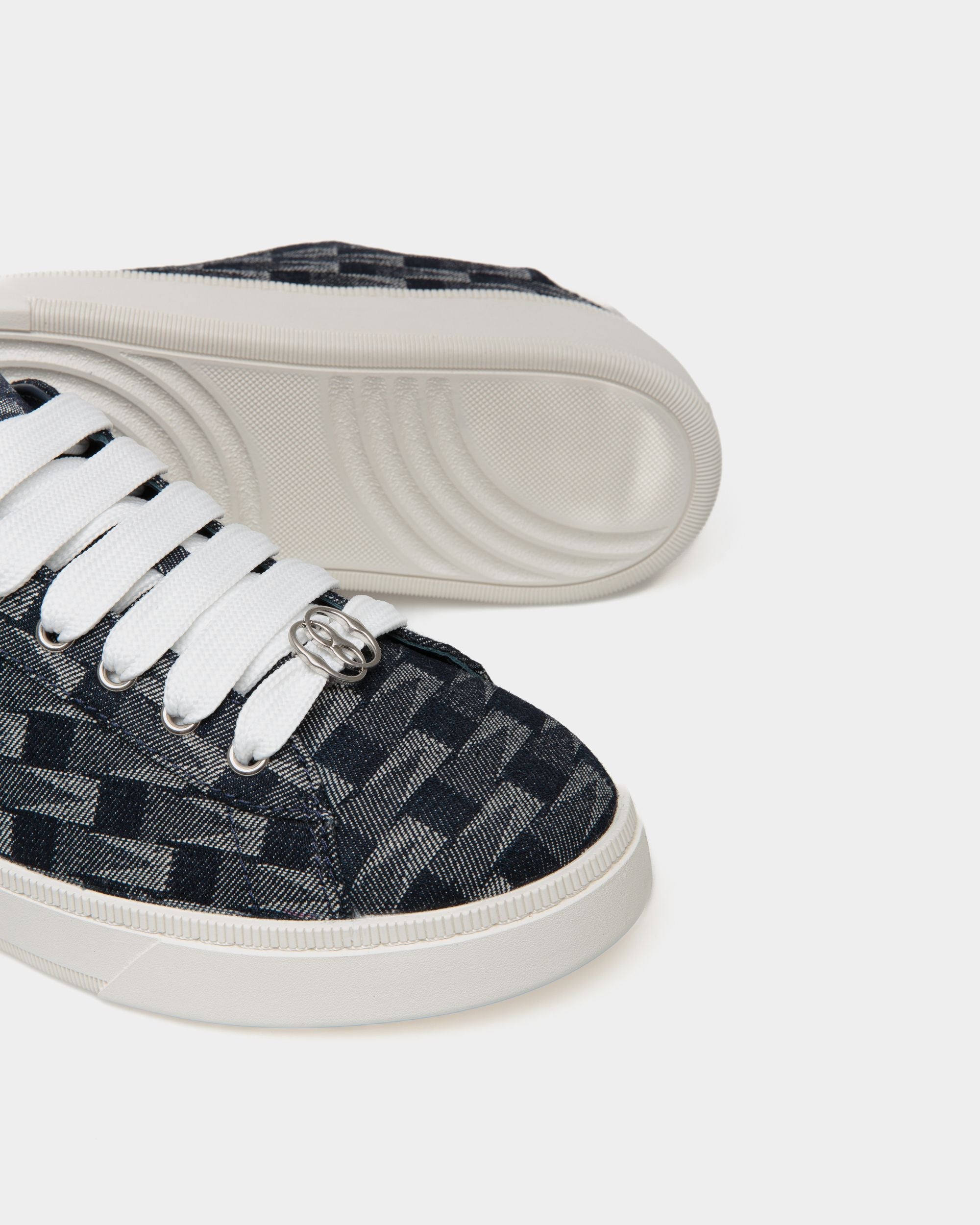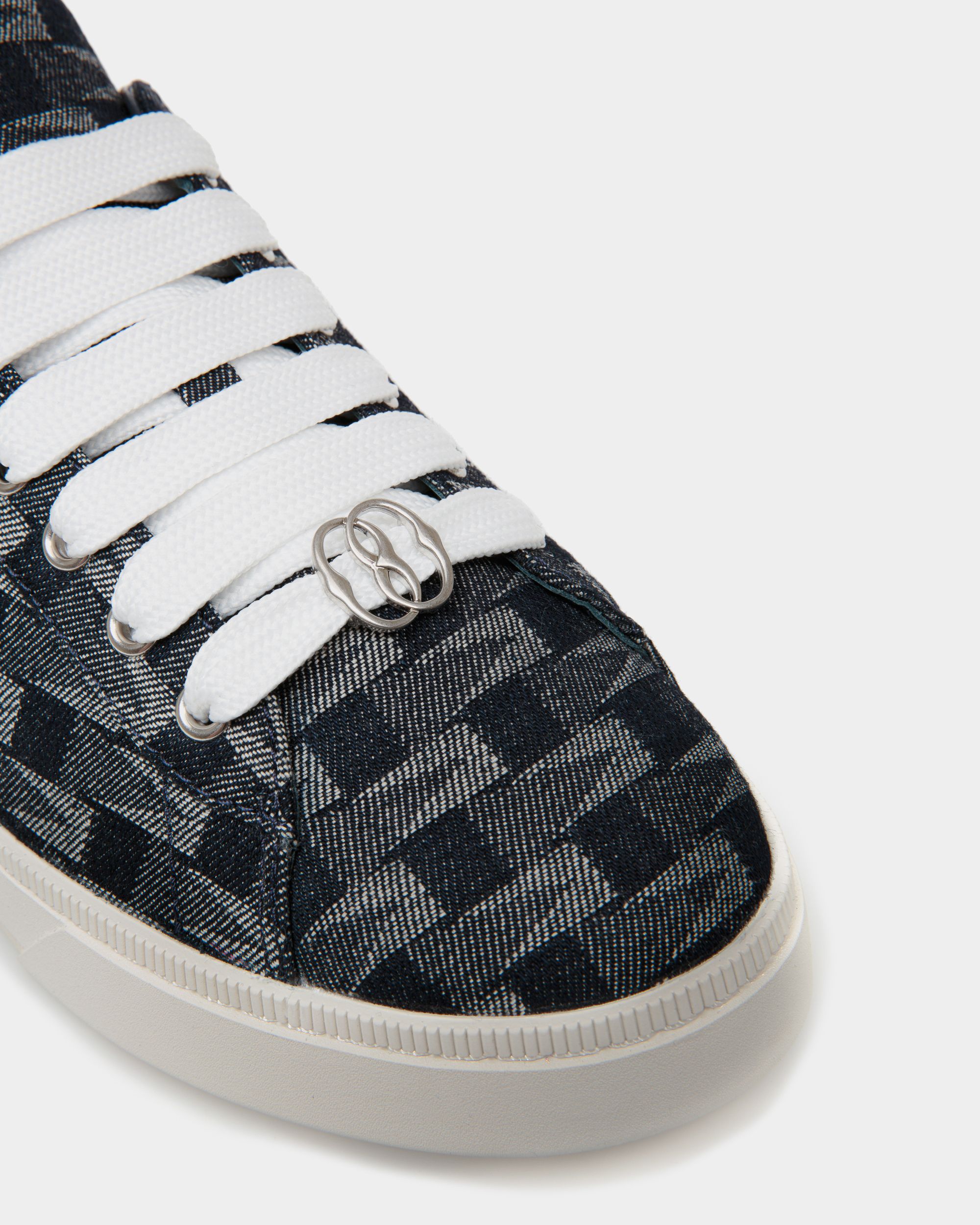 The essential silhouette of this low-top Raise sneaker is united with a thick rubber cup sole and a natural latex footbed. Navy blue Pennant print denim finishes this style with Bally heritage.