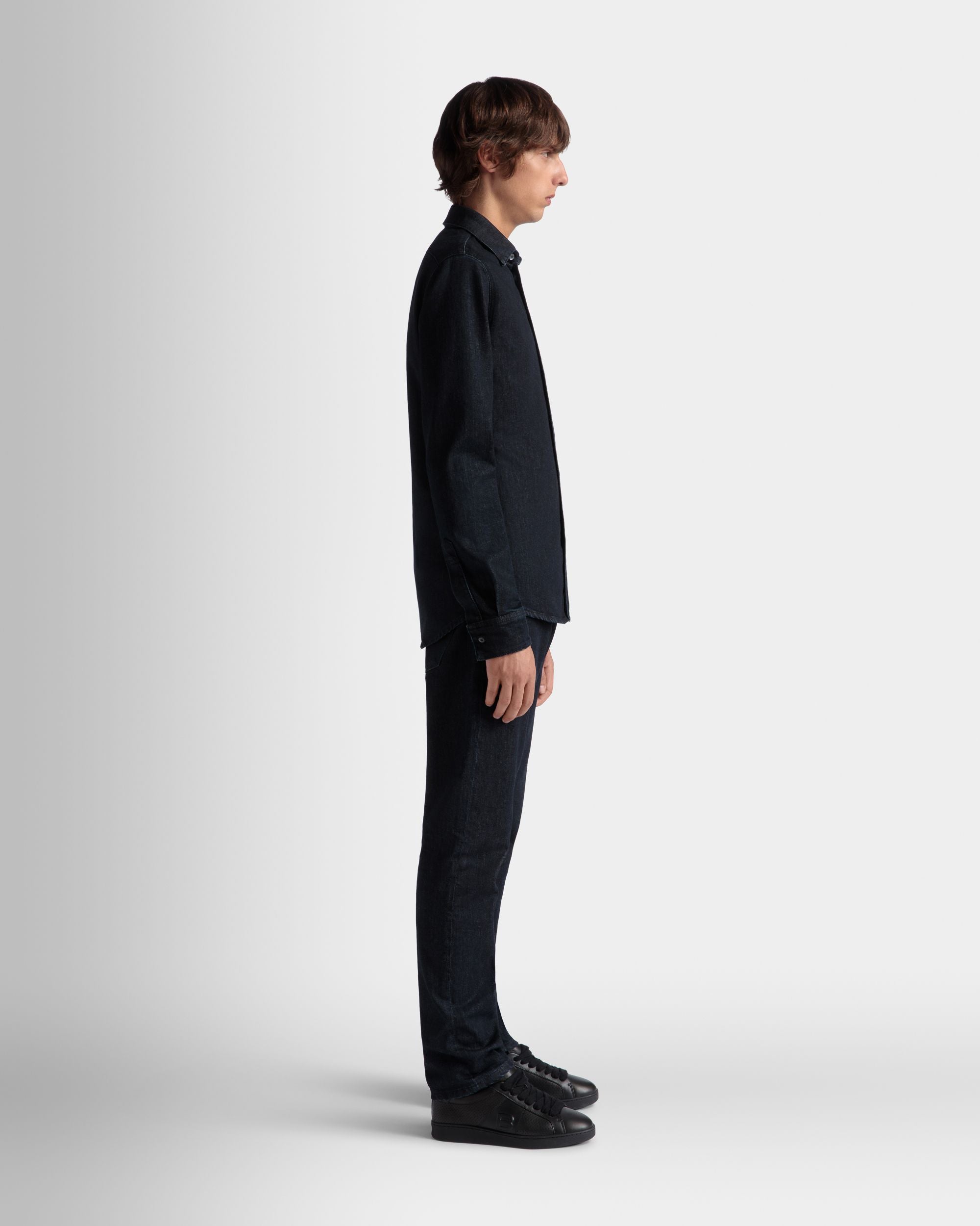 In navy blue cotton denim, this long-sleeve shirt from the Adrien Brody Travel Collection is designed for casual, effortless sophistication and comfort. Buttons fasten the front and adjust the fit of the cuffs.