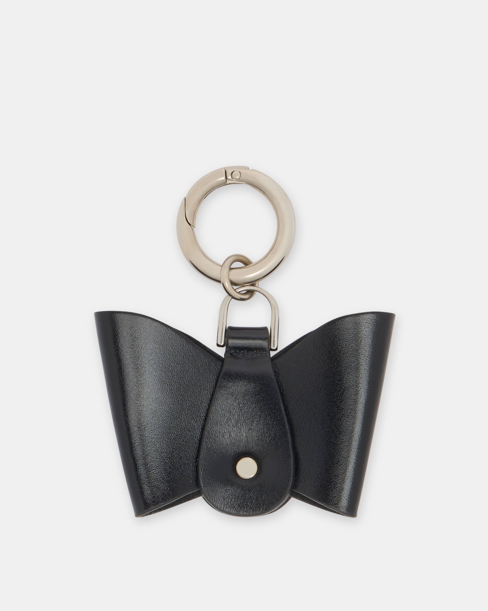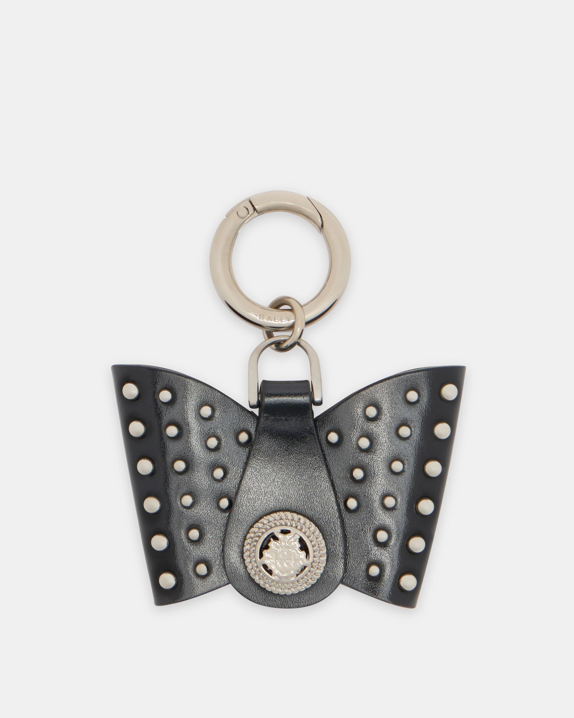 This charm has an iconic Bally B-Bow silhouette in leather enriched with round metal studs. The bold metal keyring is engraved with a Bally logo.