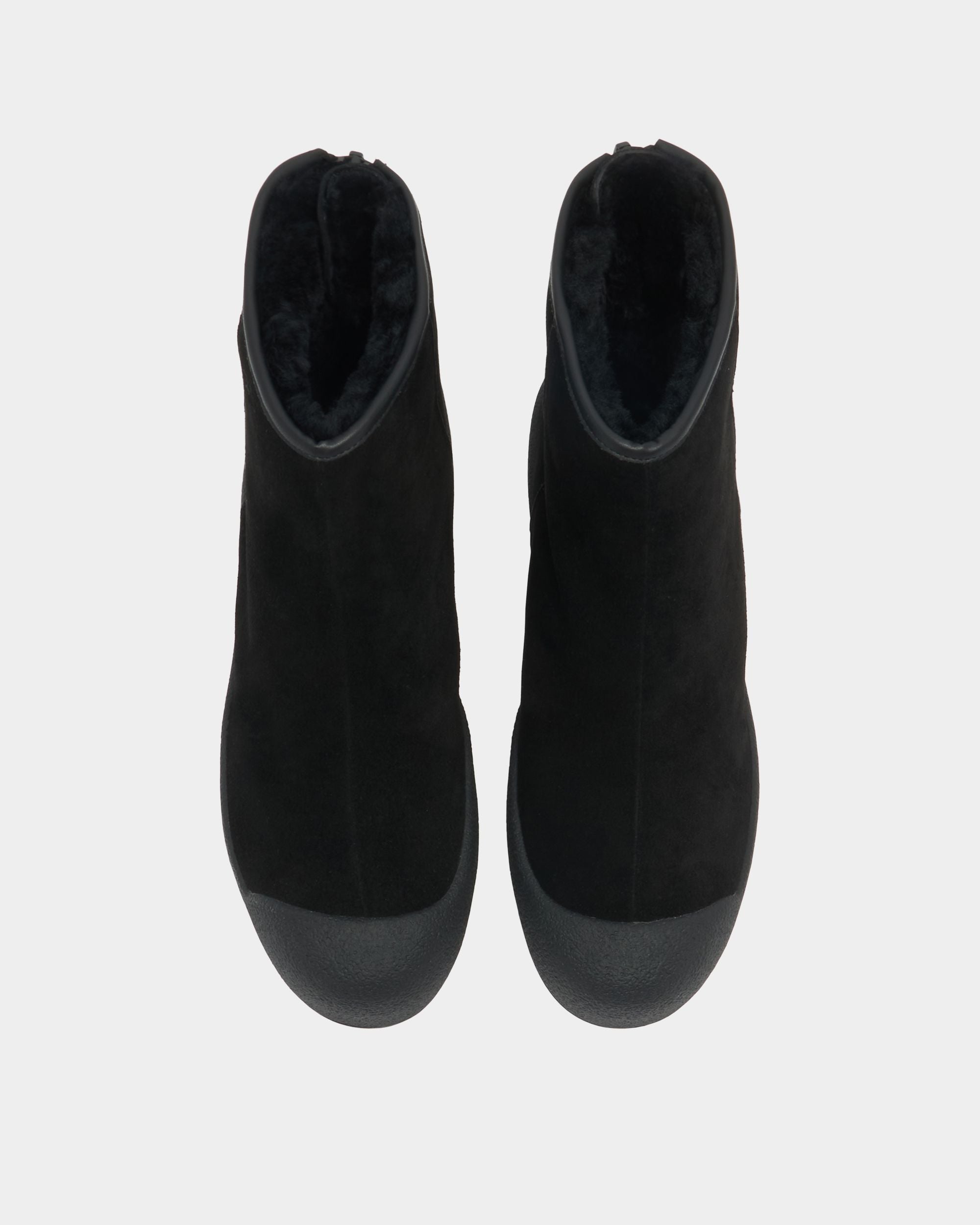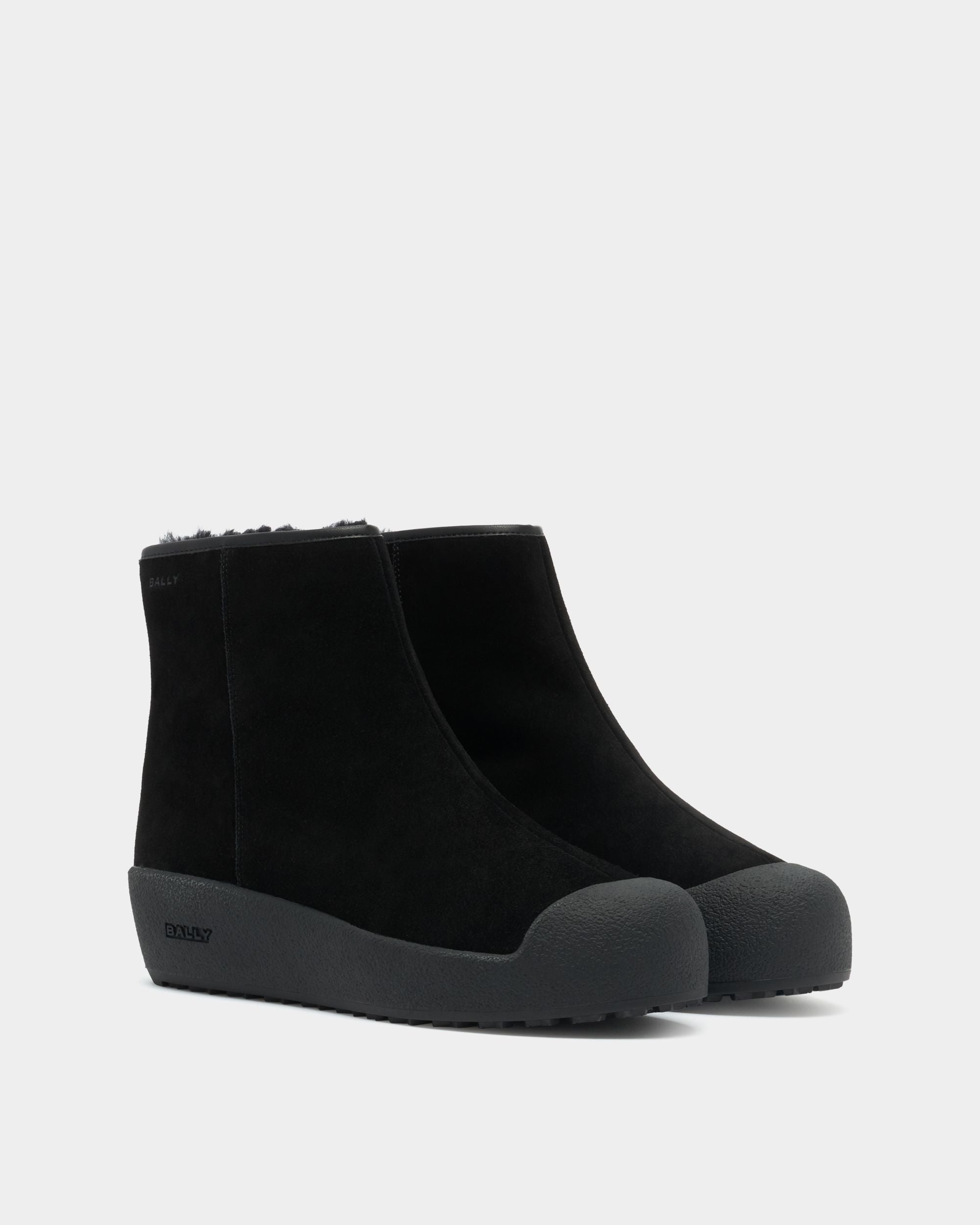 Inspired by a 1950s design by Bally for the Swiss Olympic team, this Curling bootie in black suede is engineered to insulate and cushion. A practical zipper fastens the back.