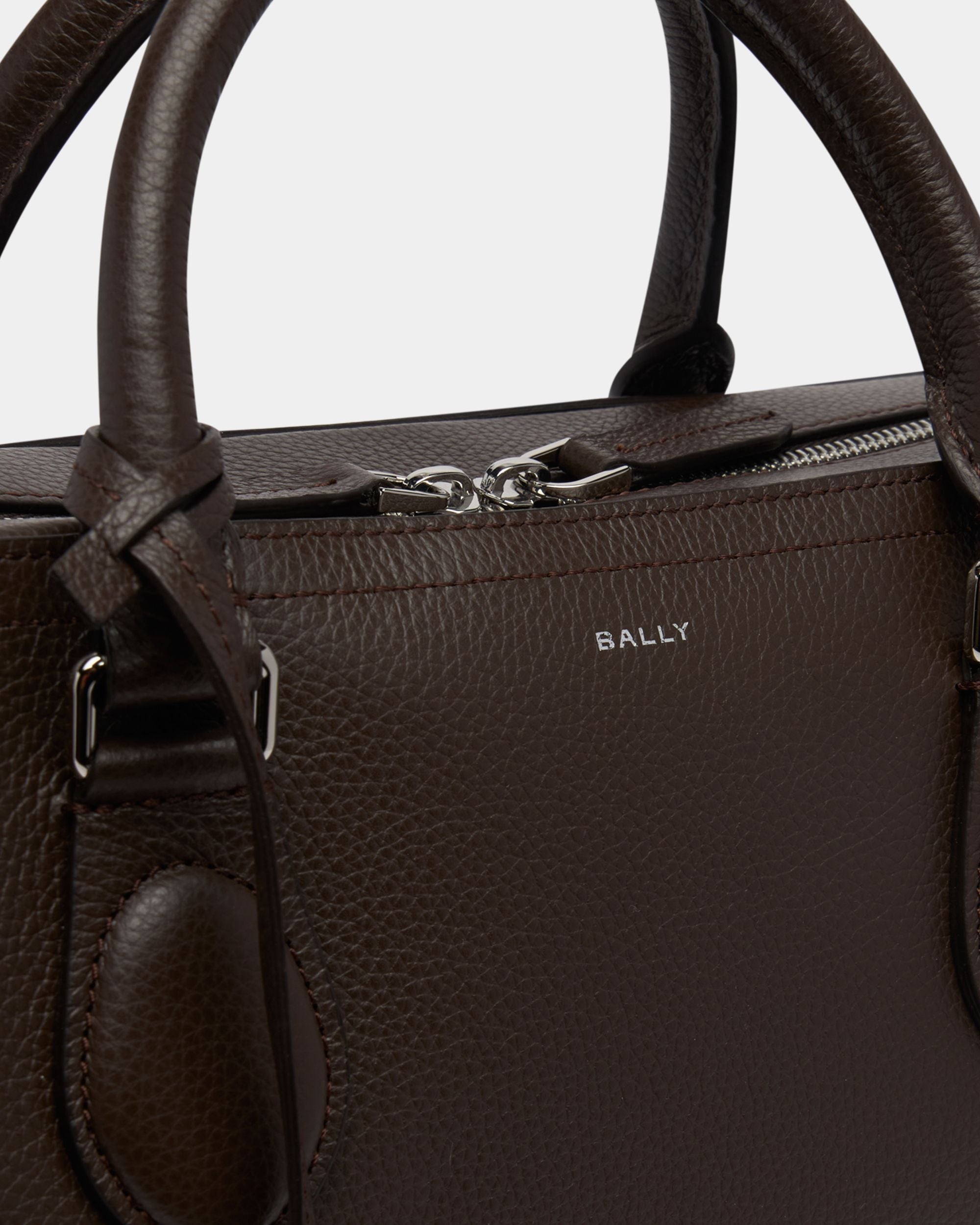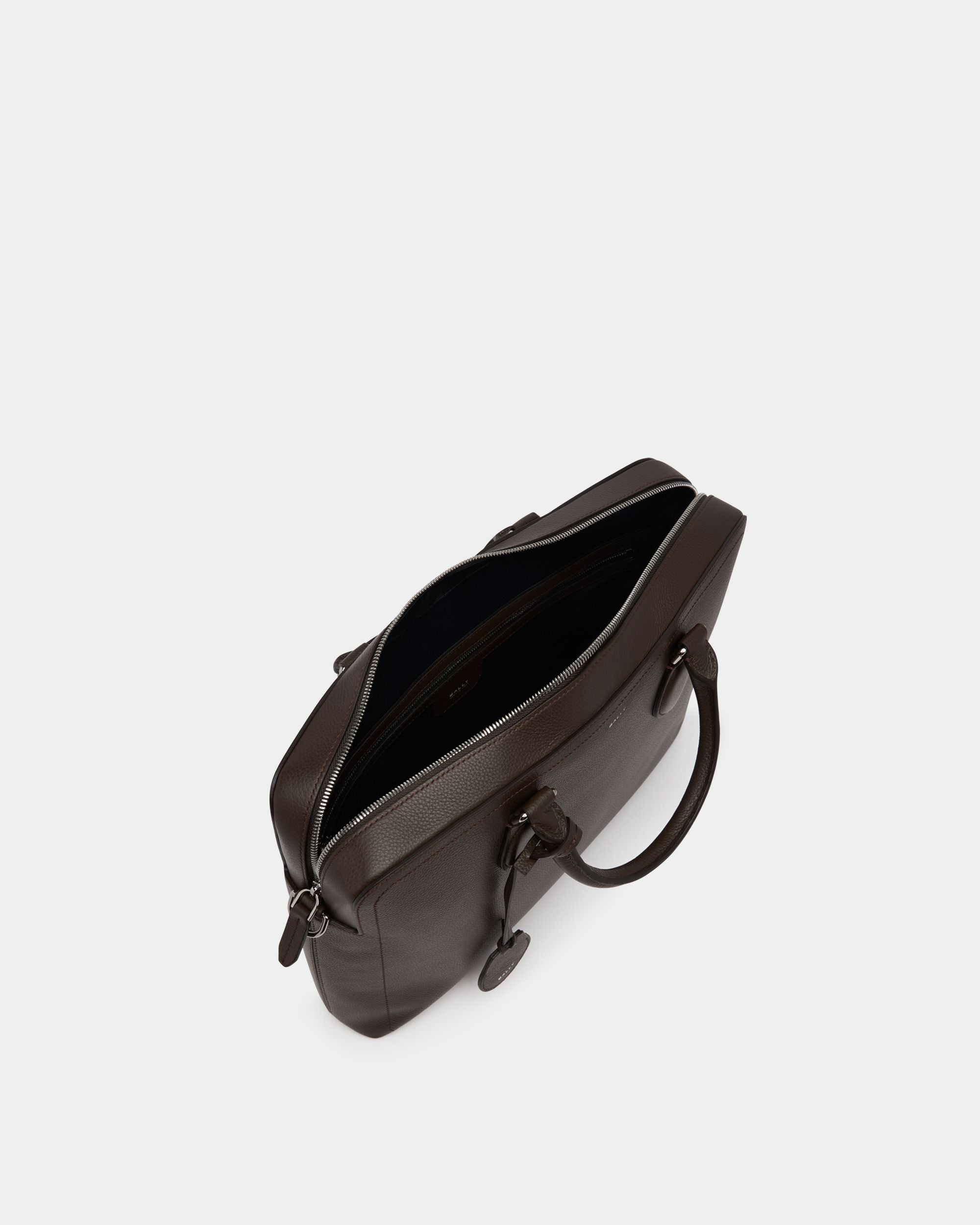 Capitol briefcase in Ebano calfskin with a grained finish and palladium-hue metal hardware. Inner pockets, room for a laptop and an external AirTag carrier reveal the practical design of this timeless bag.