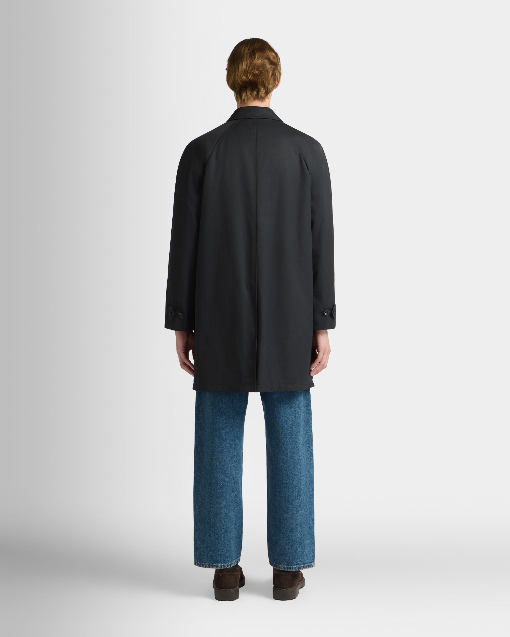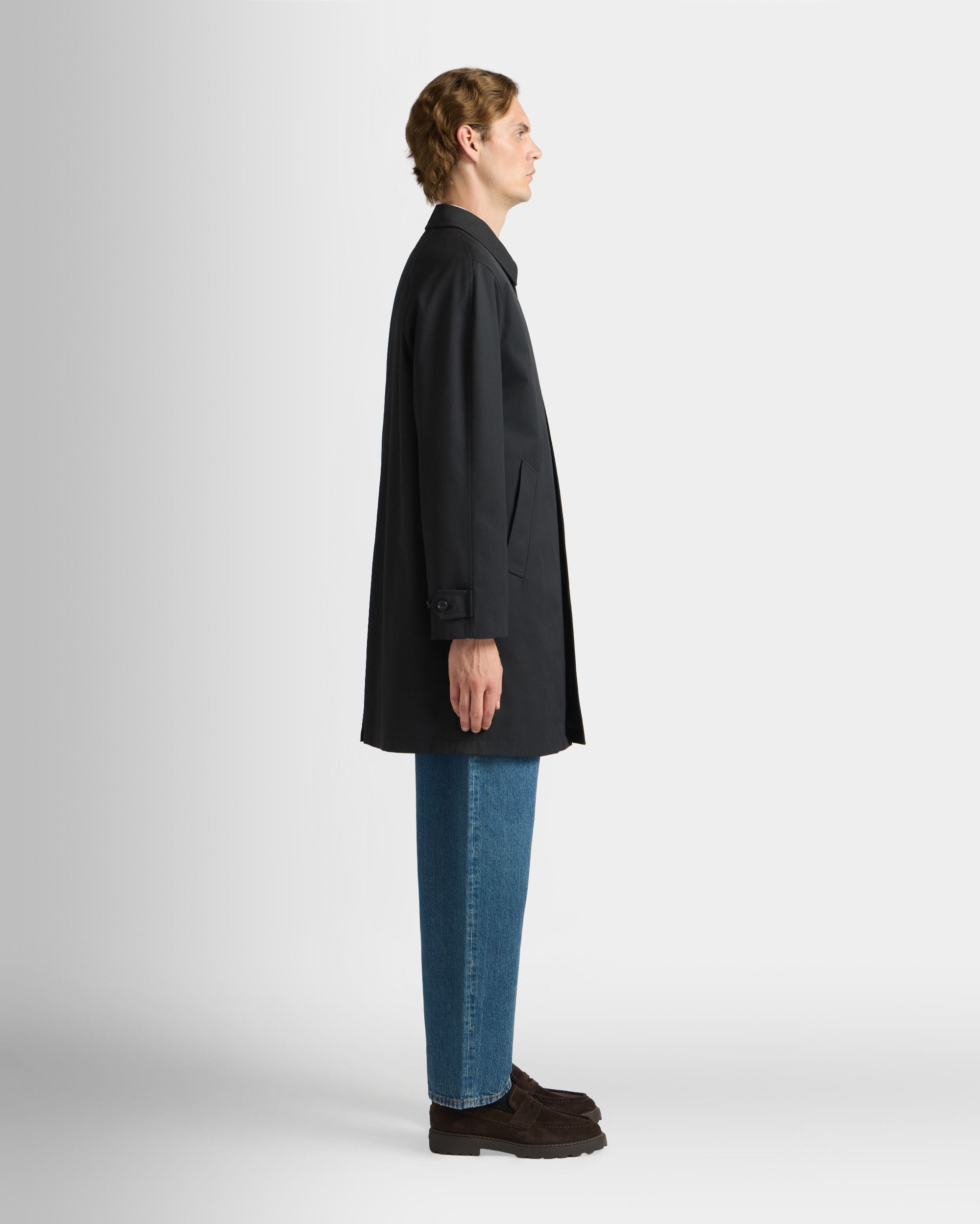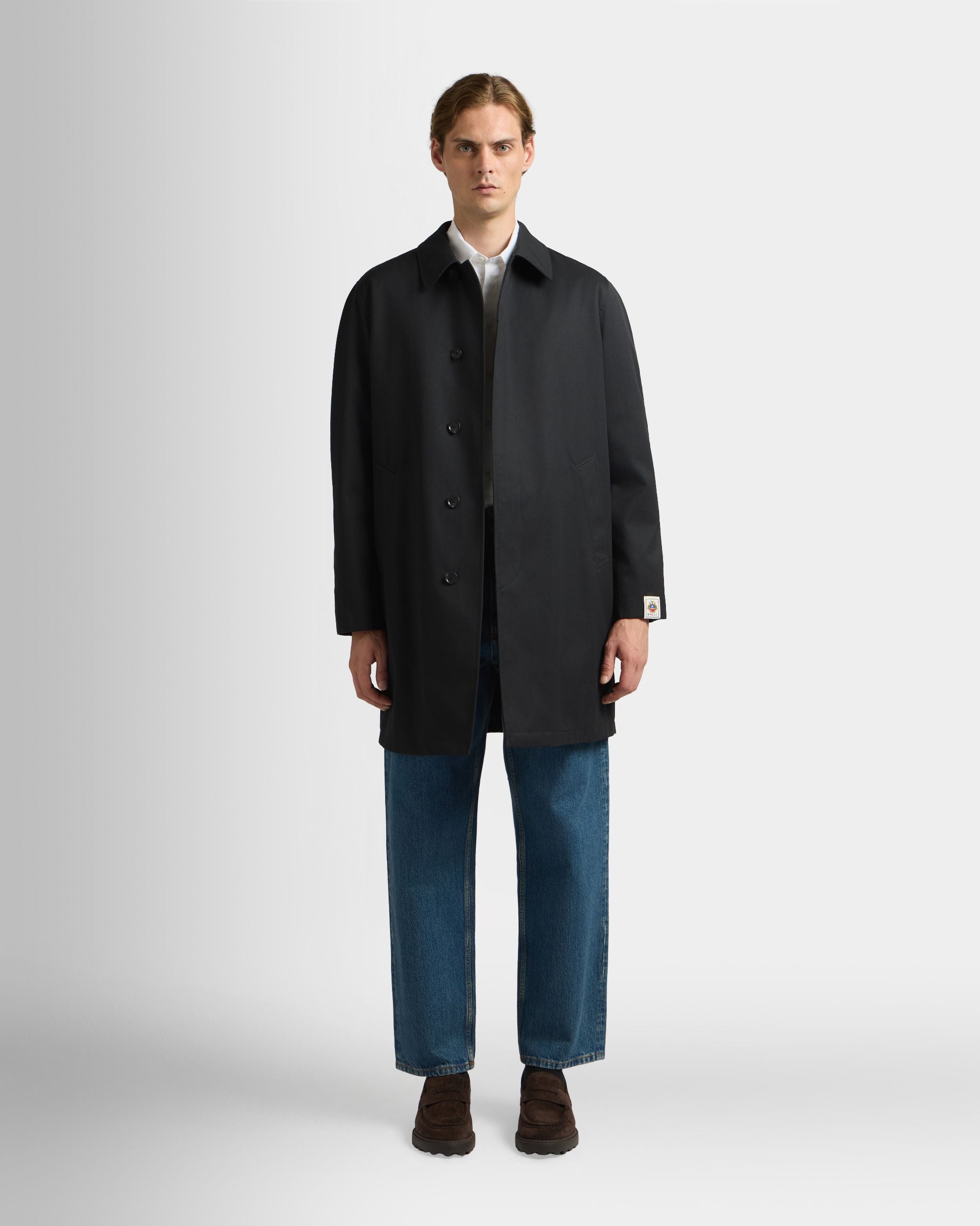 Navy blue car coat in smooth cotton-polyester gabardine with a water-resistant finish and light padding for warmth without bulk. A Bally Crest label trims the left cuff.