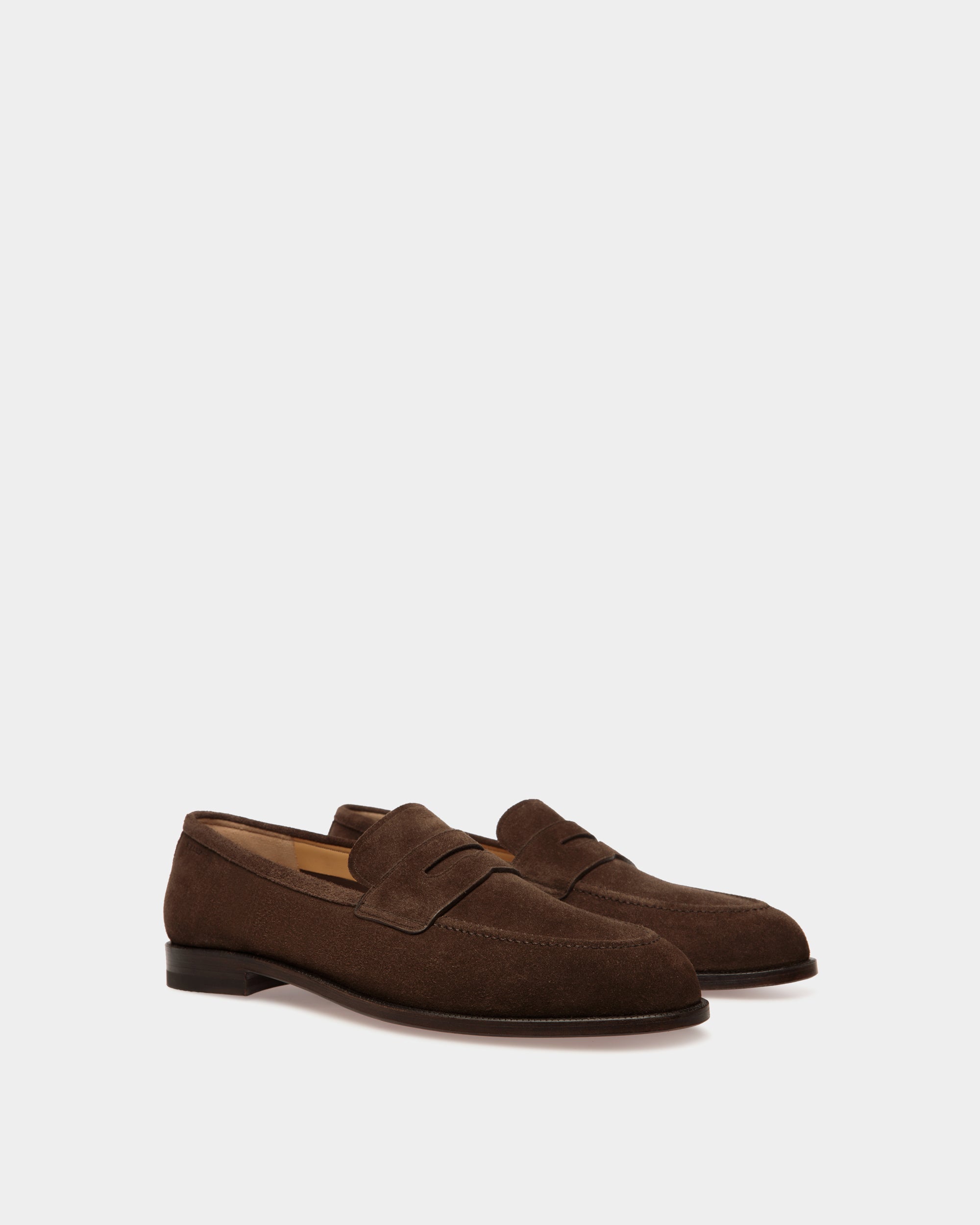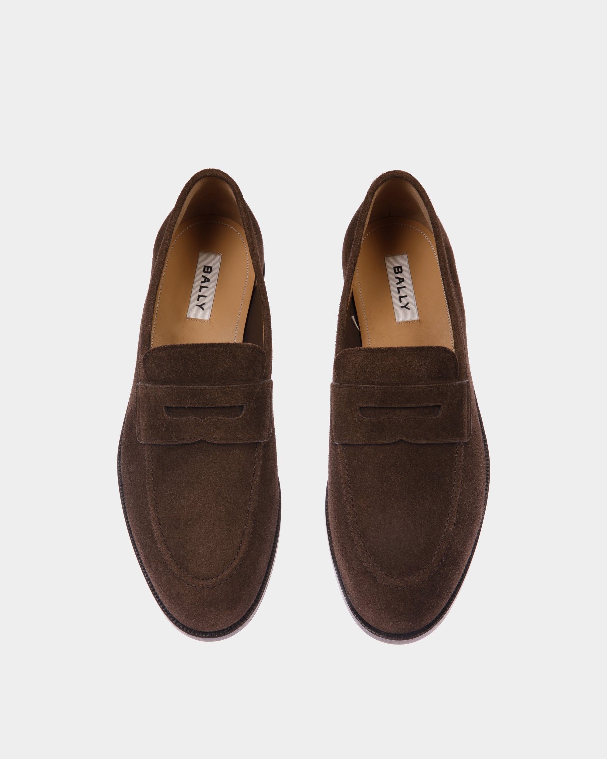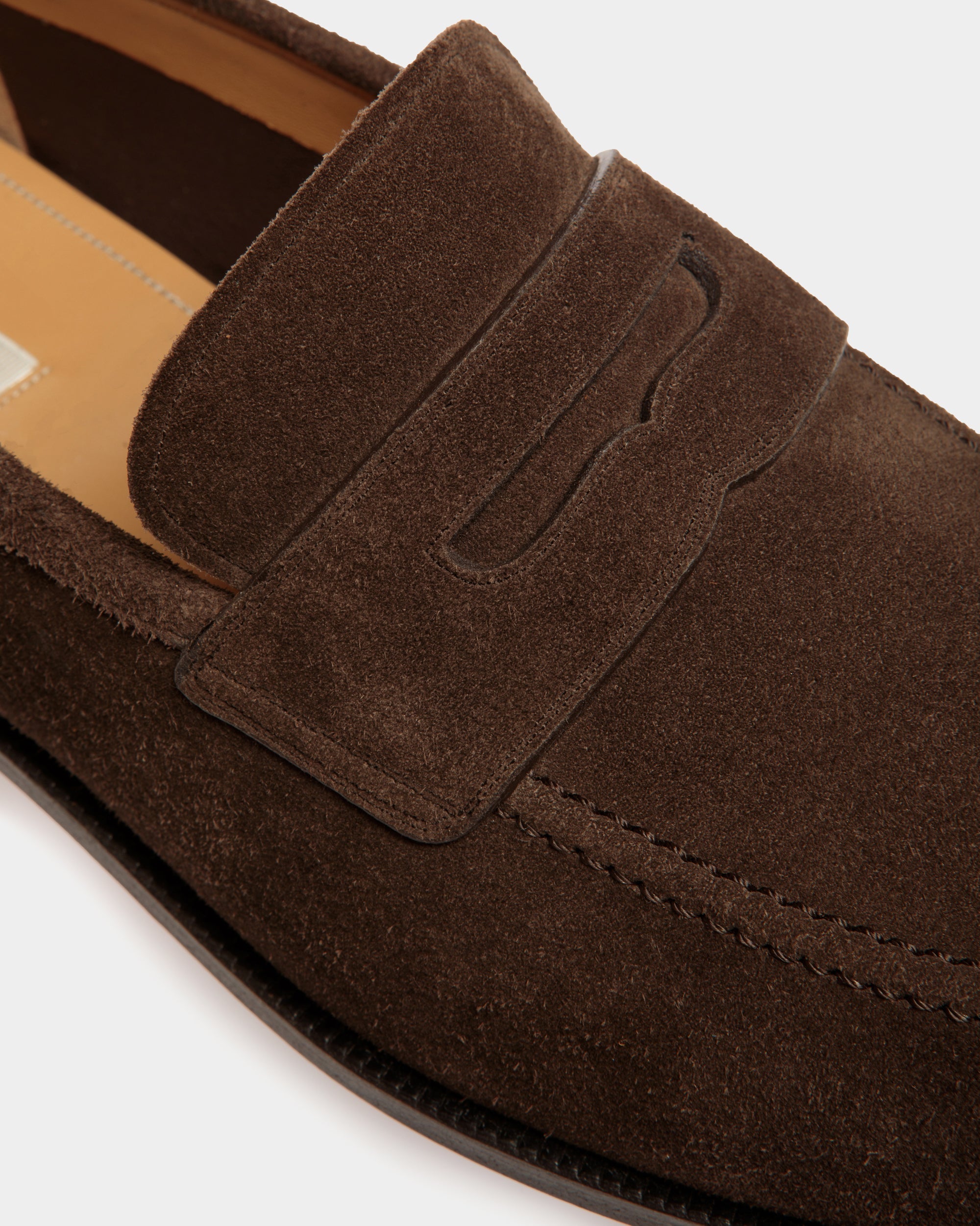 Inspired by an archival style, the slip-on Carl loafer is finely constructed in soft Ebano suede and finished by a classic penny strap across the vamp. A debossed Bally logo decorates the collar at the heel.